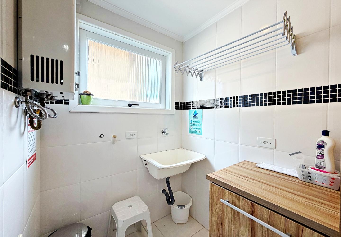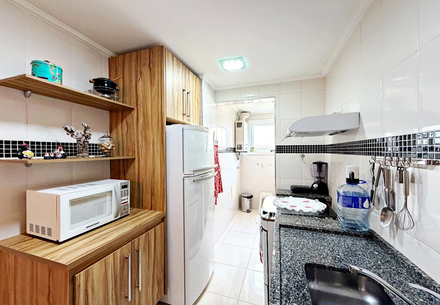 A cozinha é independente, equipada com armários e bancada em granito, conectada à área de serviço ventilada. O imóvel conta com 2 dormitórios atendidos por um banheiro social completo, com iluminação e ventilação naturais.