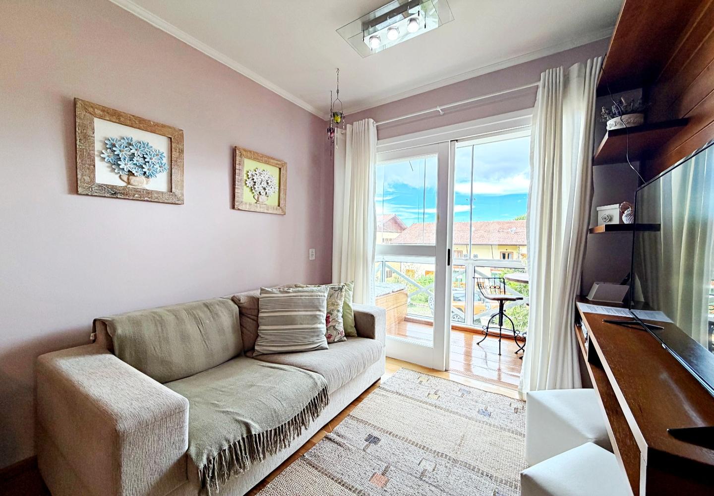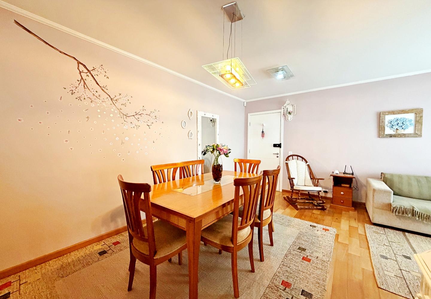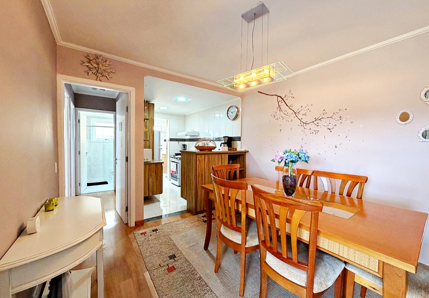 Com 55 m² bem distribuídos, o apartamento reúne sala de estar e jantar integradas, com piso em madeira e boa entrada de luz natural. A varanda foi fechada em vidro e funciona como uma extensão do living, voltada para o verde do condomínio e para o entorno tranquilo da região.
