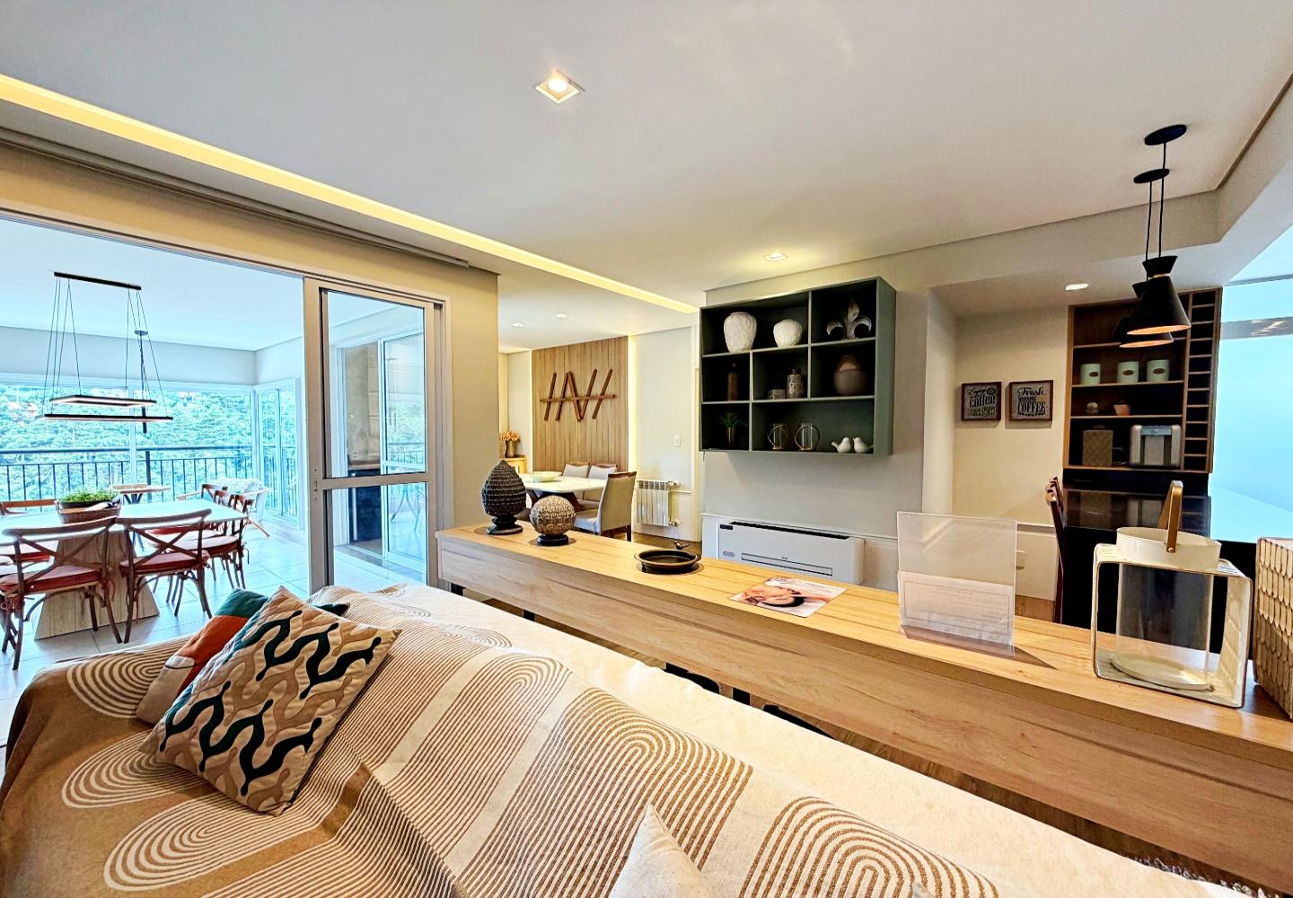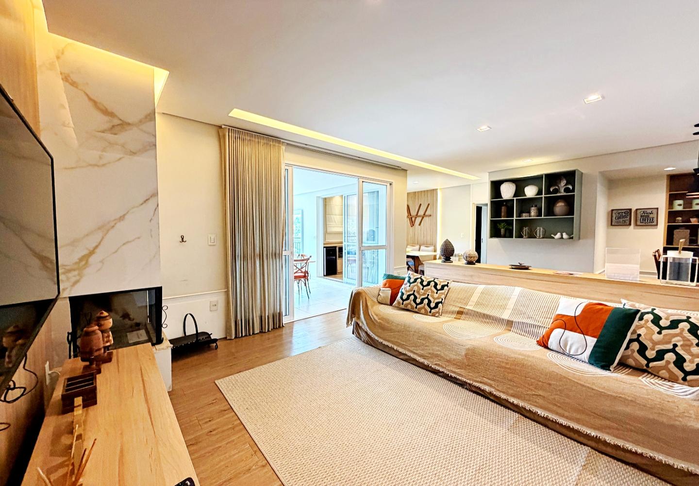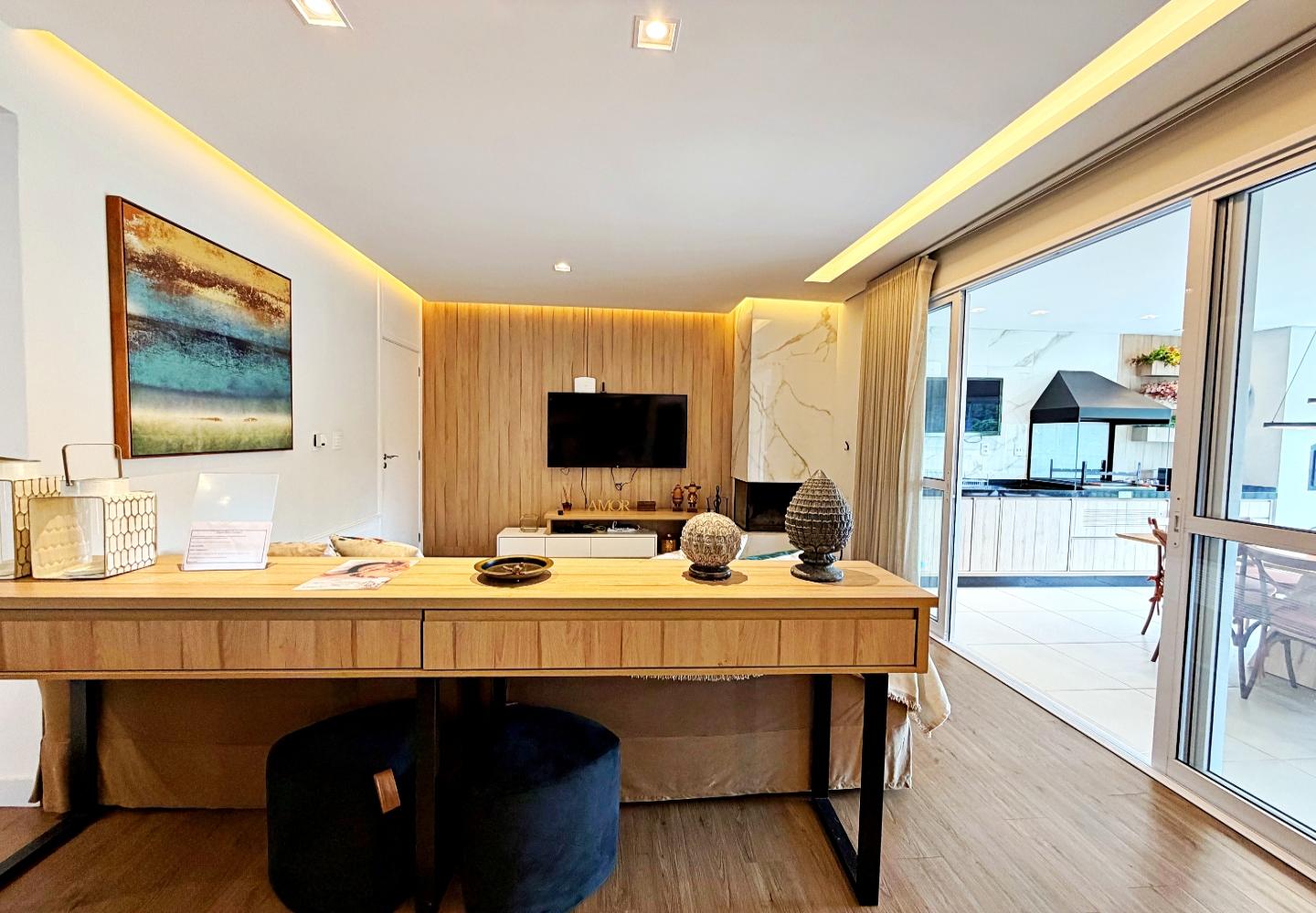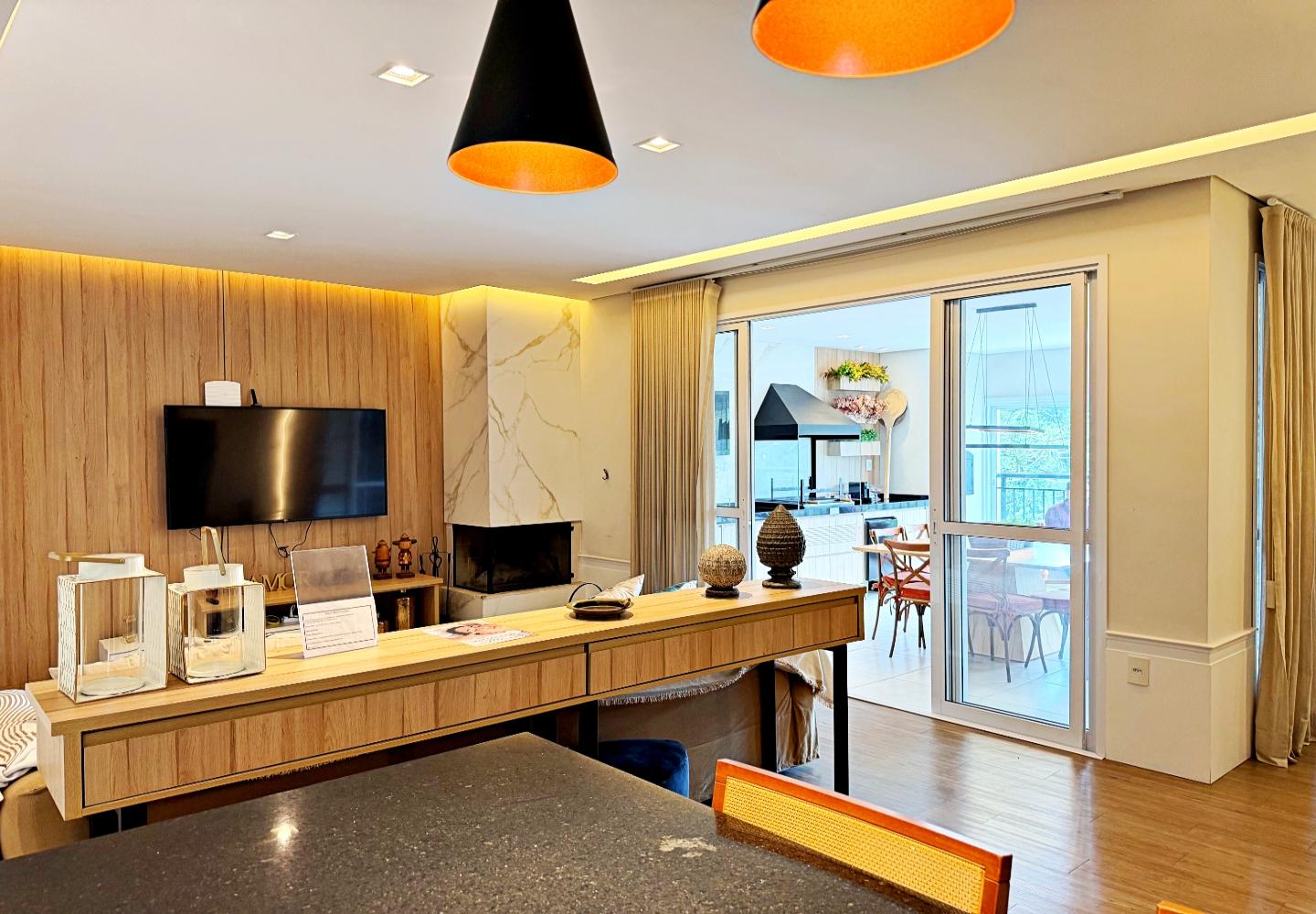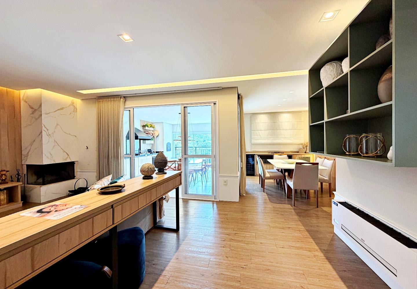 Apartamento com 127 m² no Le Premier, totalmente mobiliado e decorado. O living reúne estar, jantar e cozinha em ambiente integrado, com lareira em pedra, marcenaria planejada e iluminação indireta. As portas de correr conectam à área gourmet envidraçada, voltada para o verde e utilizável em todas as estações.