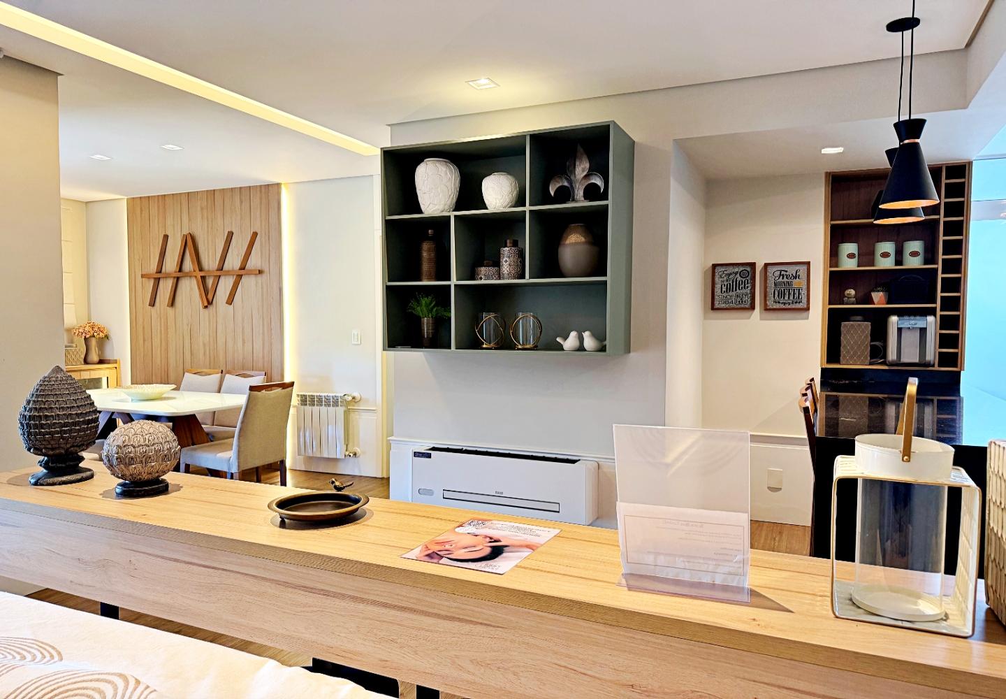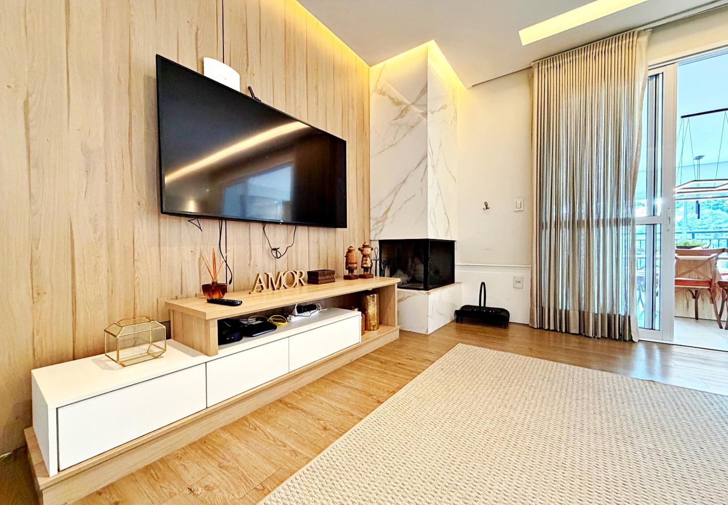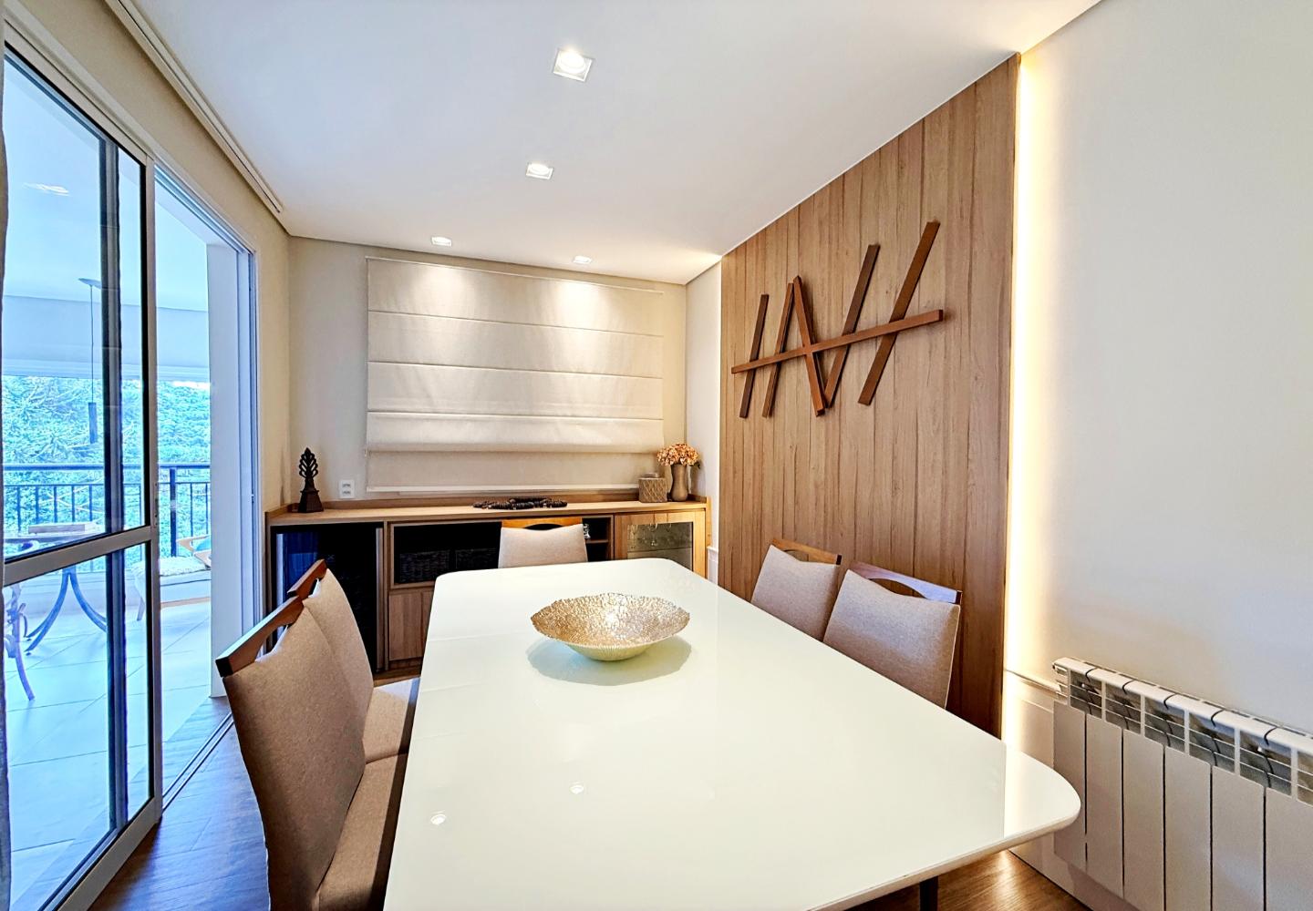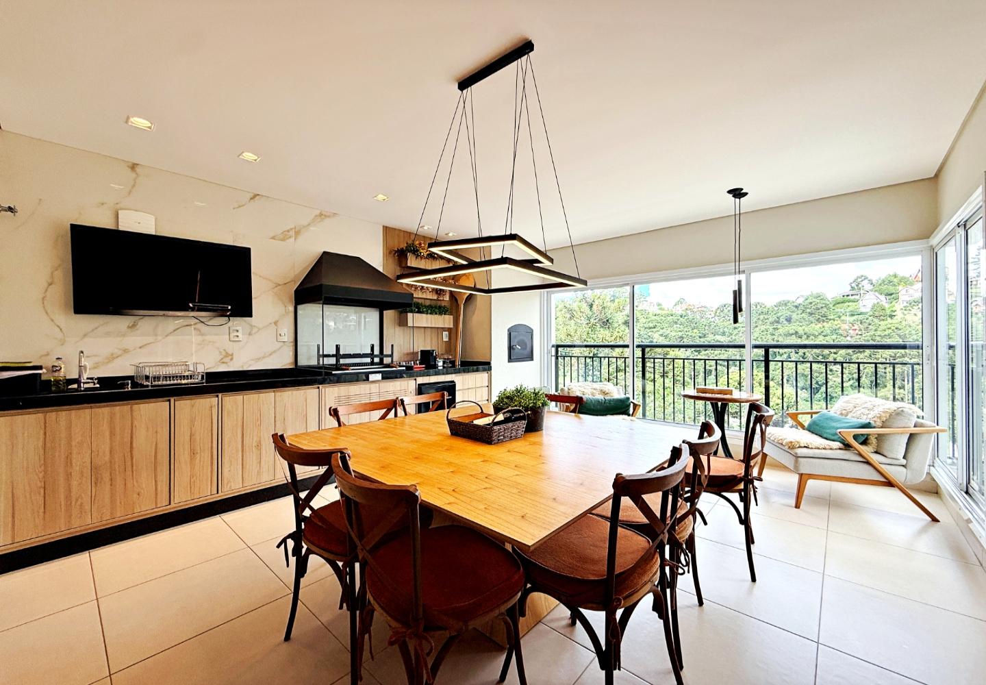 Apartamento com 127 m² no Le Premier, totalmente mobiliado e decorado. O living reúne estar, jantar e cozinha em ambiente integrado, com lareira em pedra, marcenaria planejada e iluminação indireta. As portas de correr conectam à área gourmet envidraçada, voltada para o verde e utilizável em todas as estações.