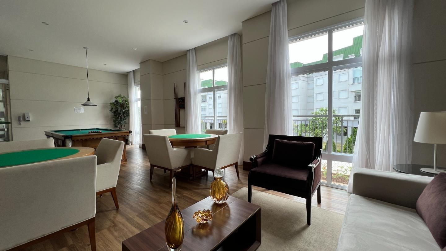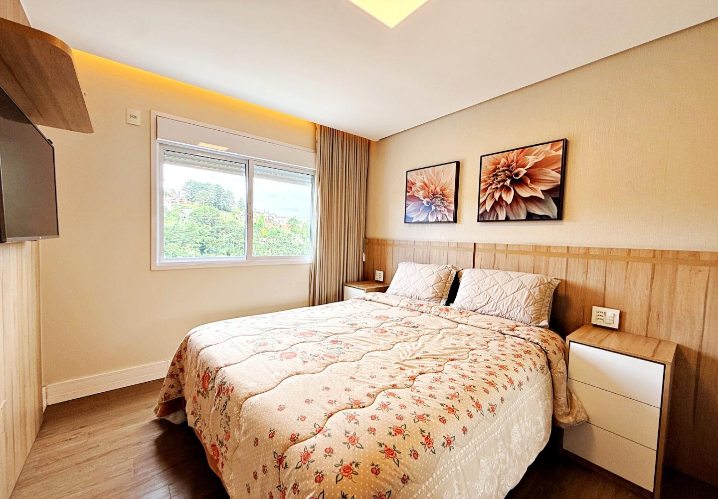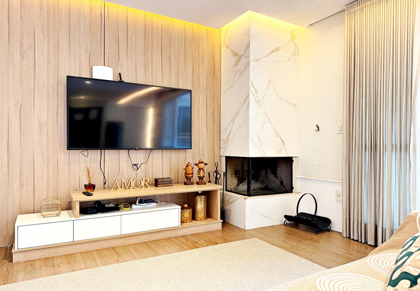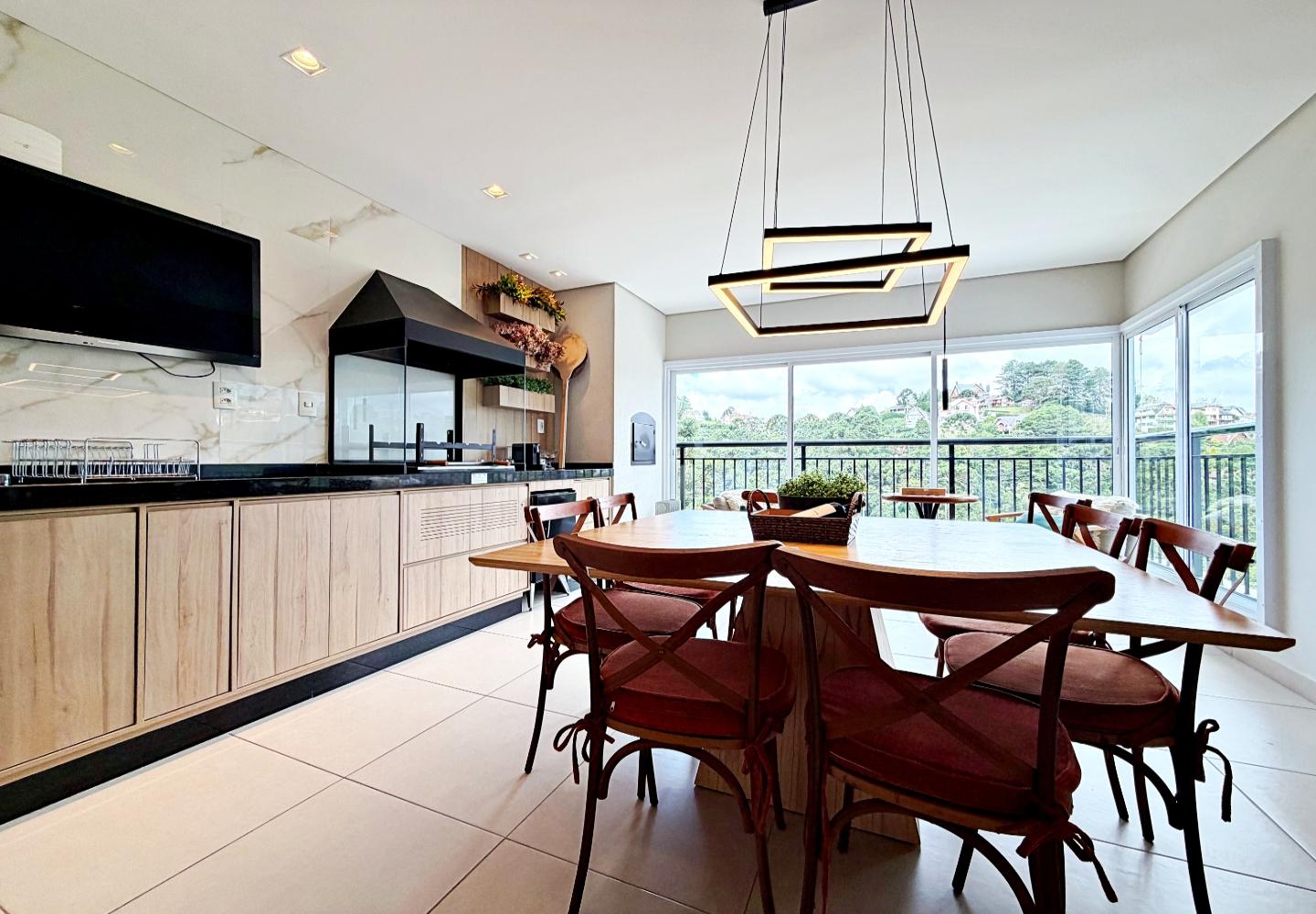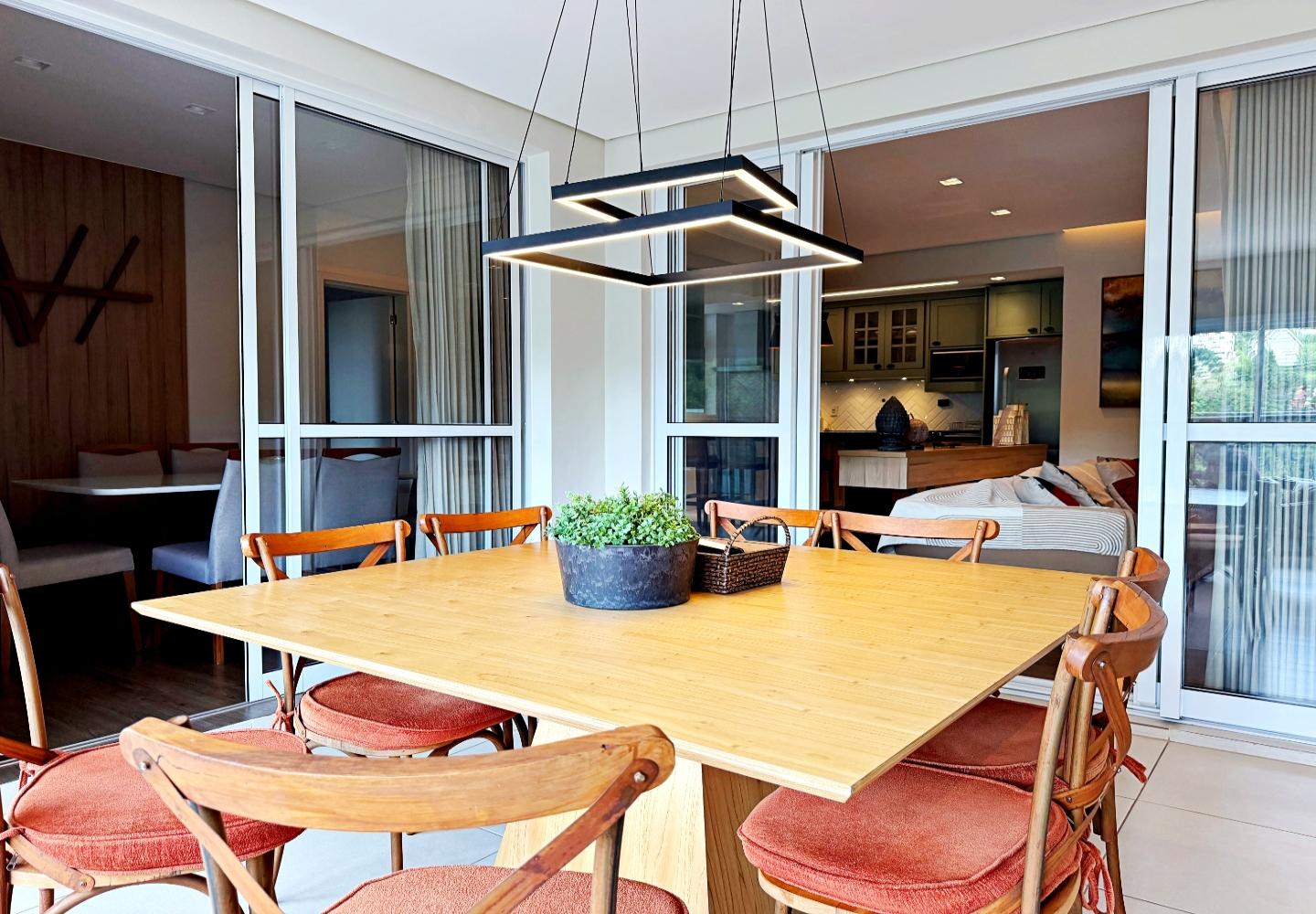 Apartamento com 127 m² no Le Premier, totalmente mobiliado e decorado. O living reúne estar, jantar e cozinha em ambiente integrado, com lareira em pedra, marcenaria planejada e iluminação indireta. As portas de correr conectam à área gourmet envidraçada, voltada para o verde e utilizável em todas as estações.