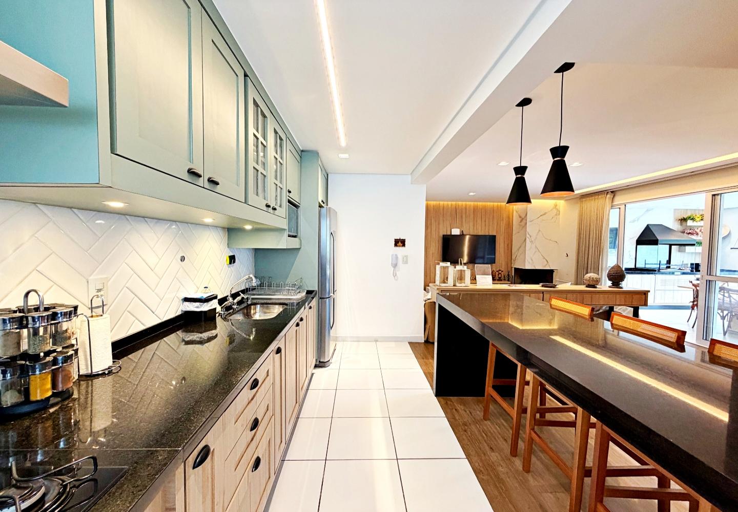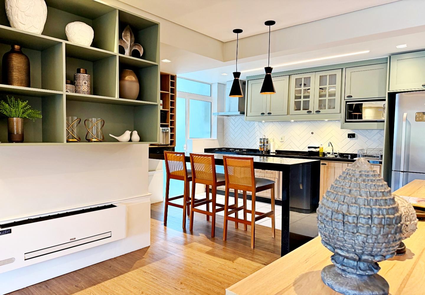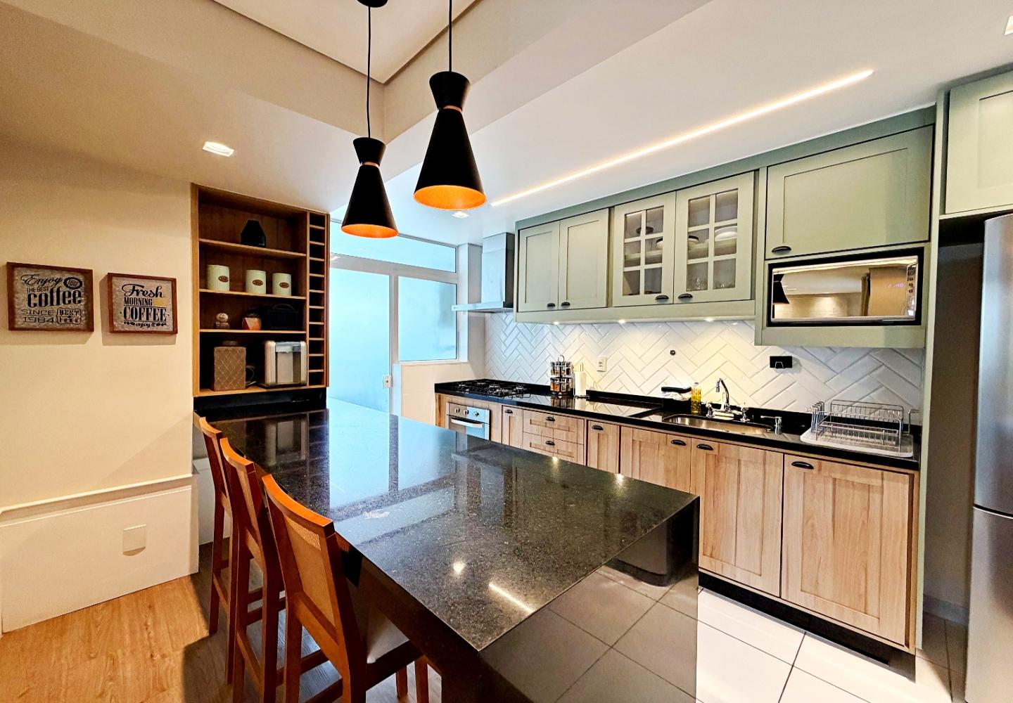 A cozinha é funcional e bem equipada, apoiando a área social sem separar os ambientes. Na área íntima são três suítes bem iluminadas, com banheiros completos e circulação reservada. Imóvel pronto para uso, sem necessidade de intervenções imediatas.