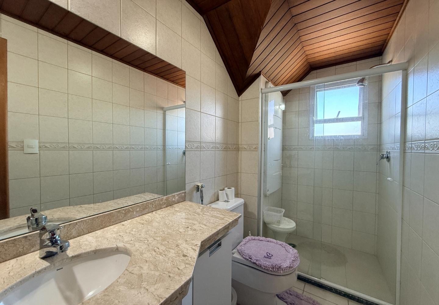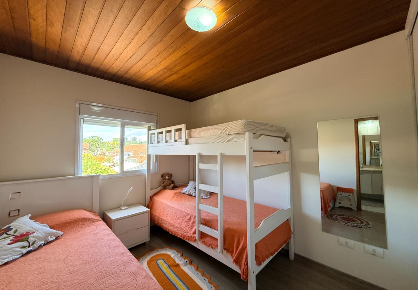 No piso superior ficam as 2 suítes, com bons espaços internos, armários e aberturas amplas. O teto inclinado em madeira reforça o estilo de montanha, e a suíte principal possui saída para a varanda, garantindo iluminação natural e ventilação.