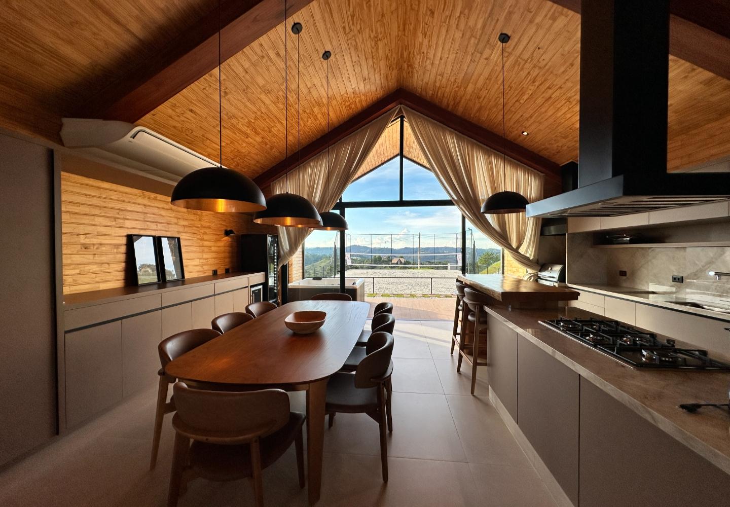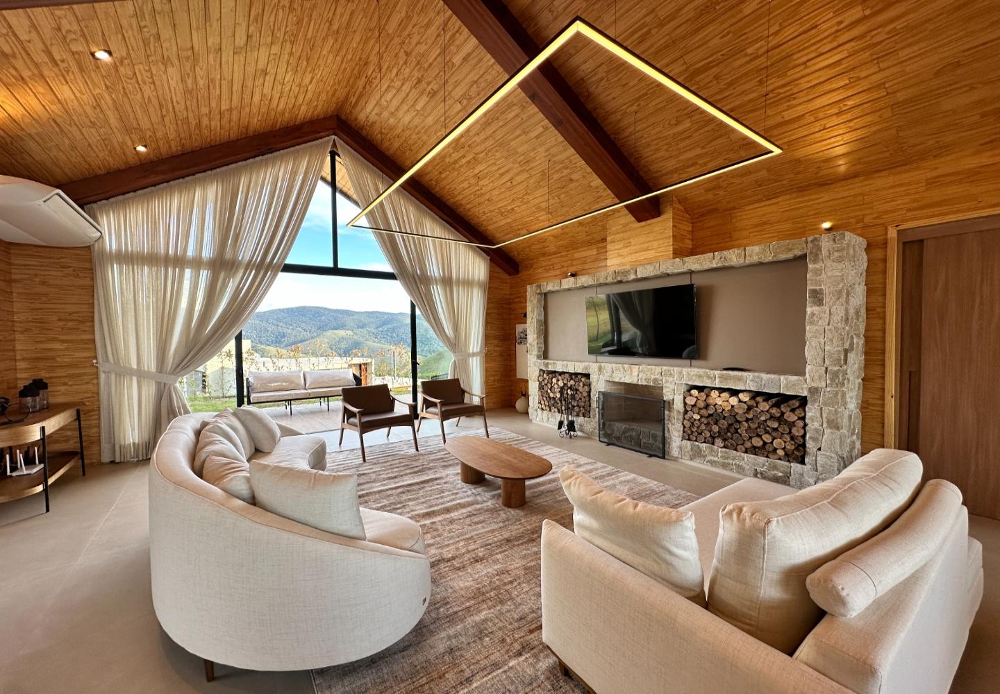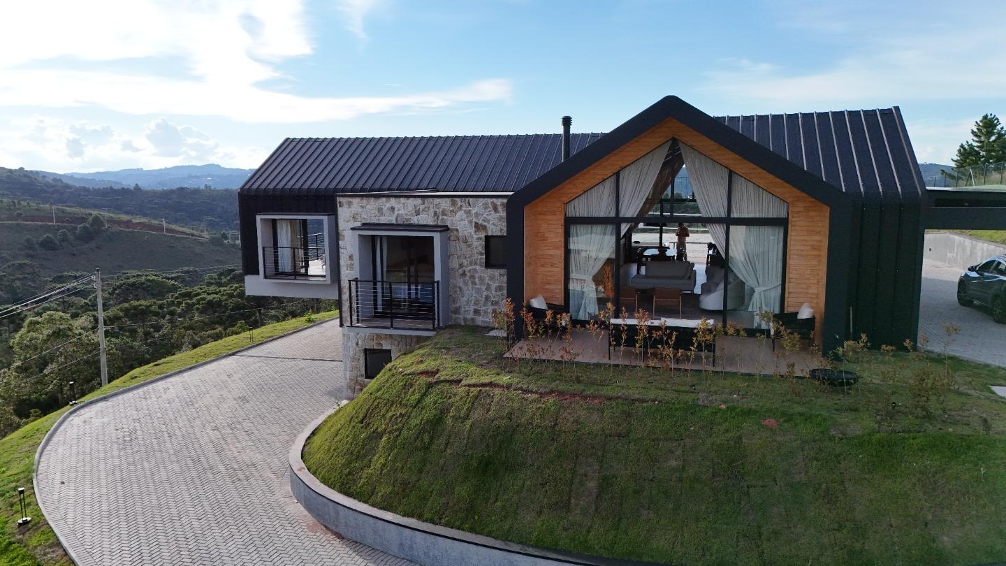 A área social é marcada por pé-direito elevado, grandes panos de vidro e lareira em pedra, criando uma conexão direta entre interior e exterior. Os ambientes se abrem para o deck e para a área externa, de onde a vista se torna parte do cotidiano. A casa conta com três suítes bem distribuídas, garantindo conforto e privacidade, além de acabamentos atuais e soluções funcionais no dia a dia.
