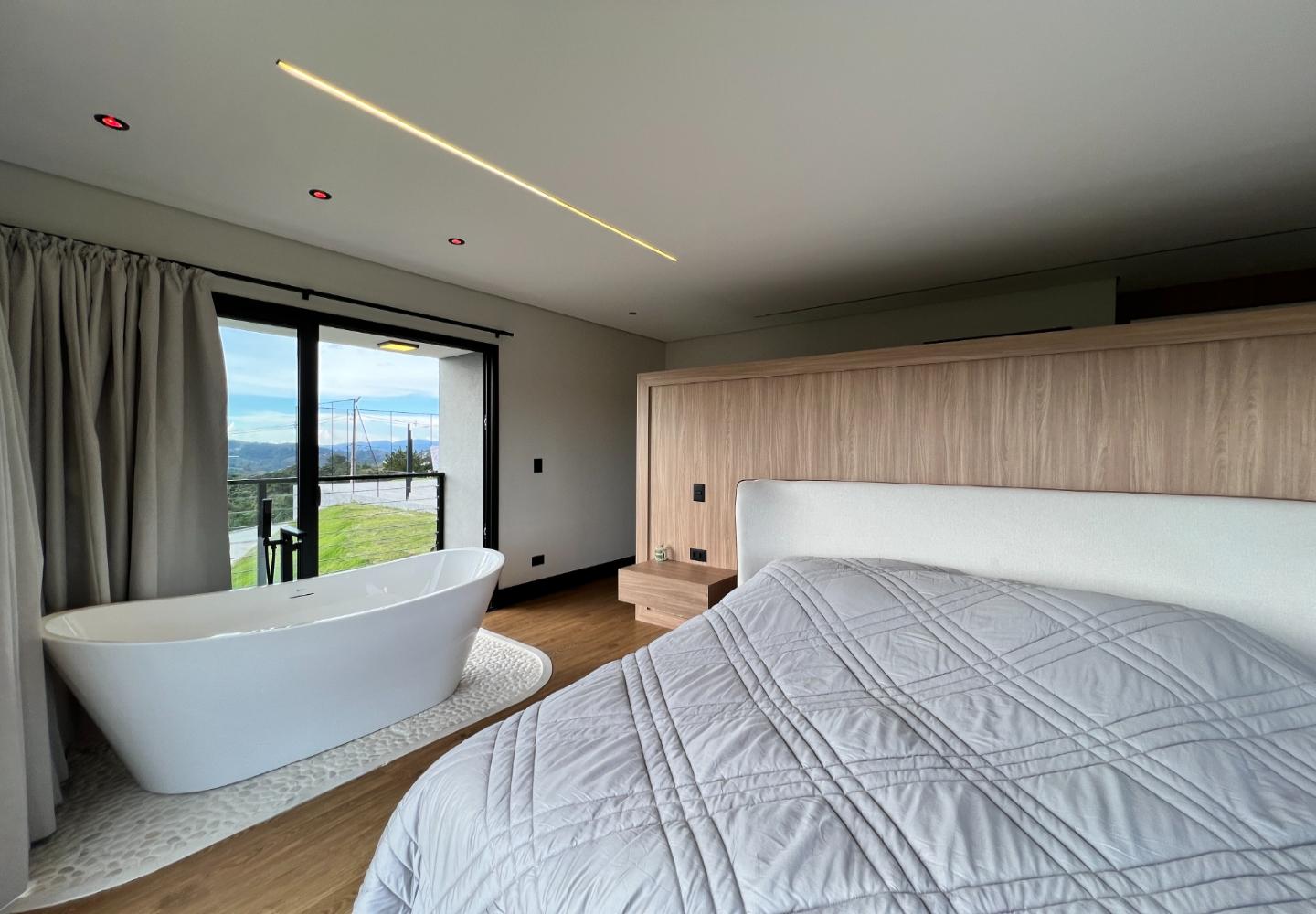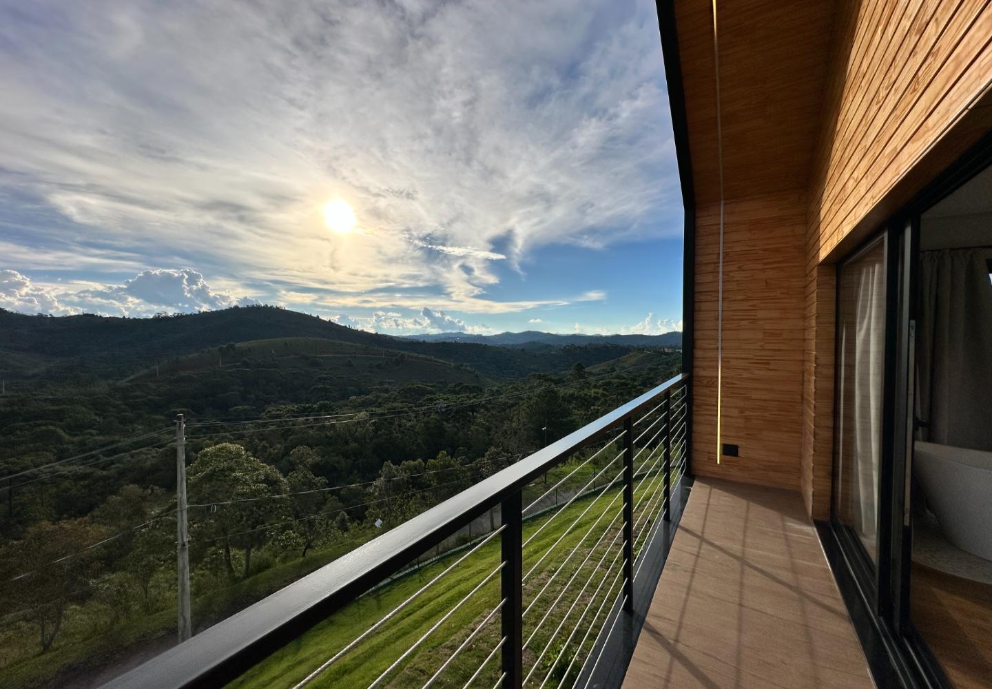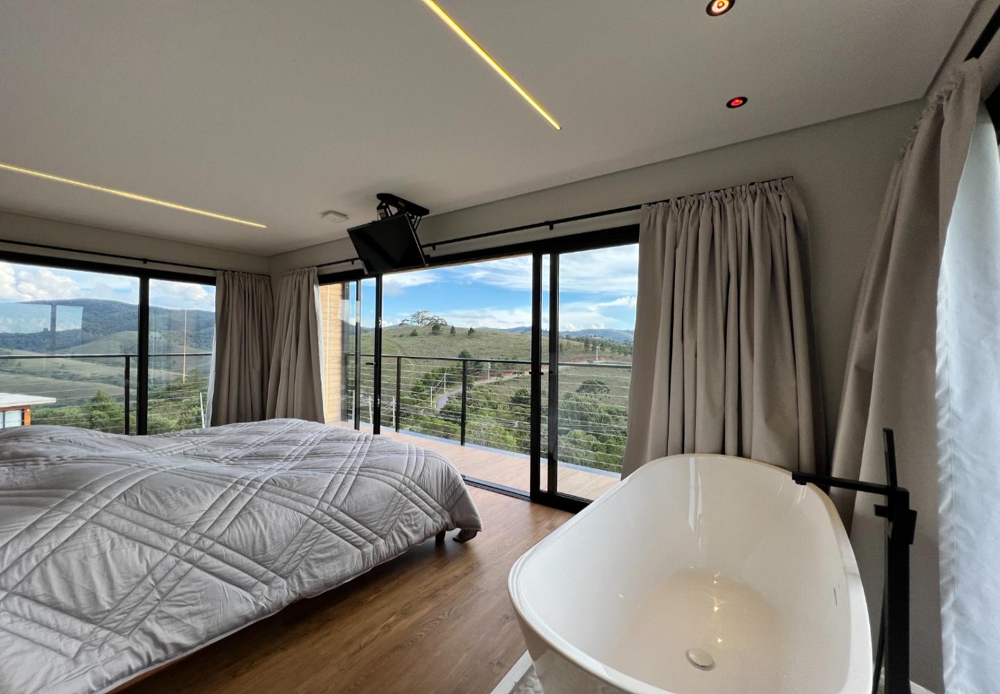 A área social é marcada por pé-direito elevado, grandes panos de vidro e lareira em pedra, criando uma conexão direta entre interior e exterior. Os ambientes se abrem para o deck e para a área externa, de onde a vista se torna parte do cotidiano. A casa conta com três suítes bem distribuídas, garantindo conforto e privacidade, além de acabamentos atuais e soluções funcionais no dia a dia.