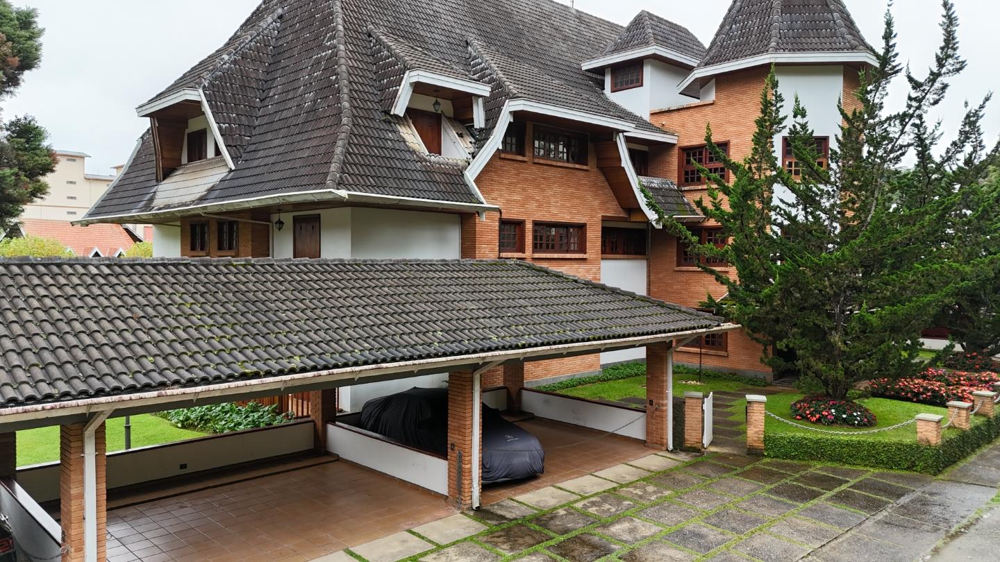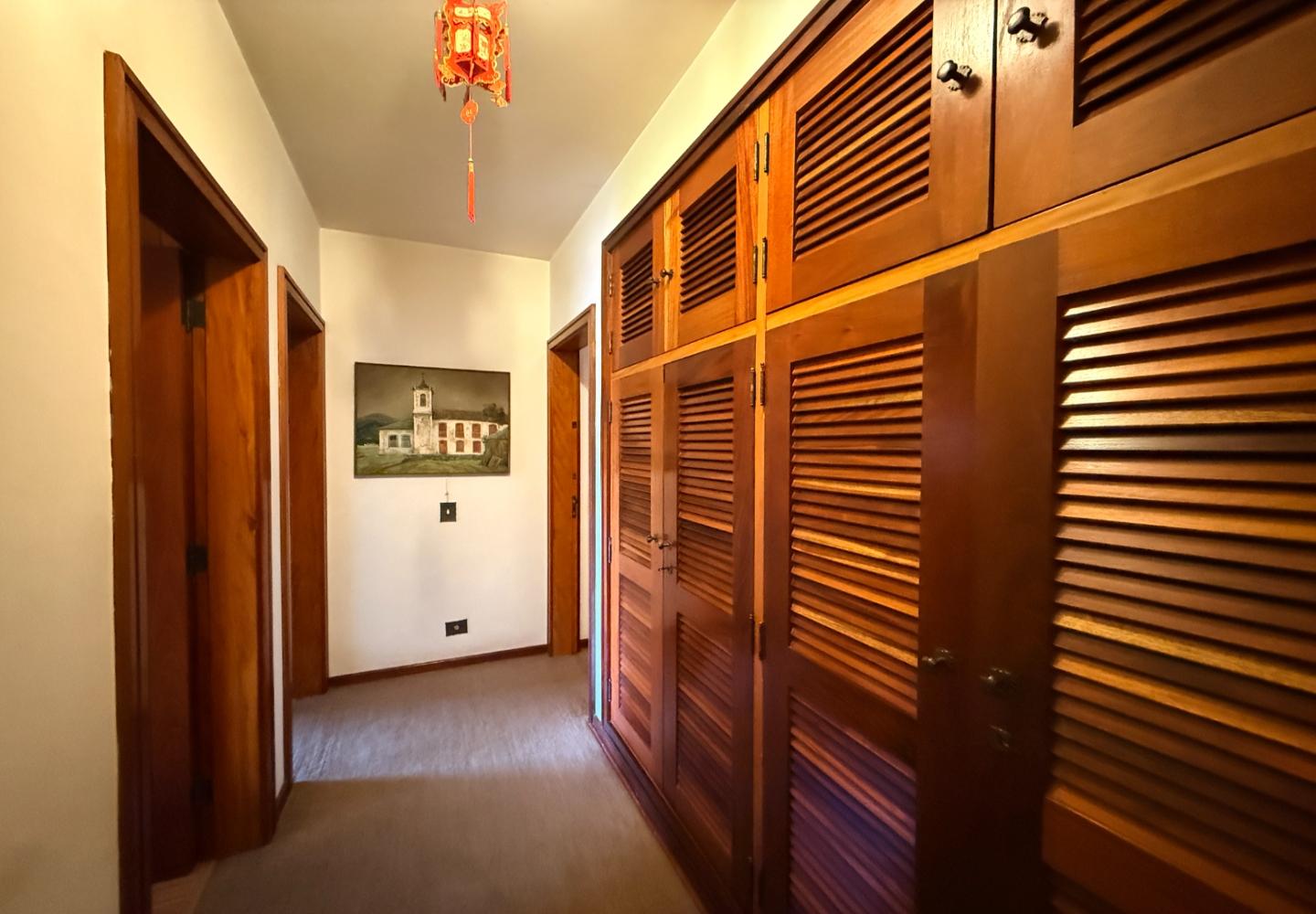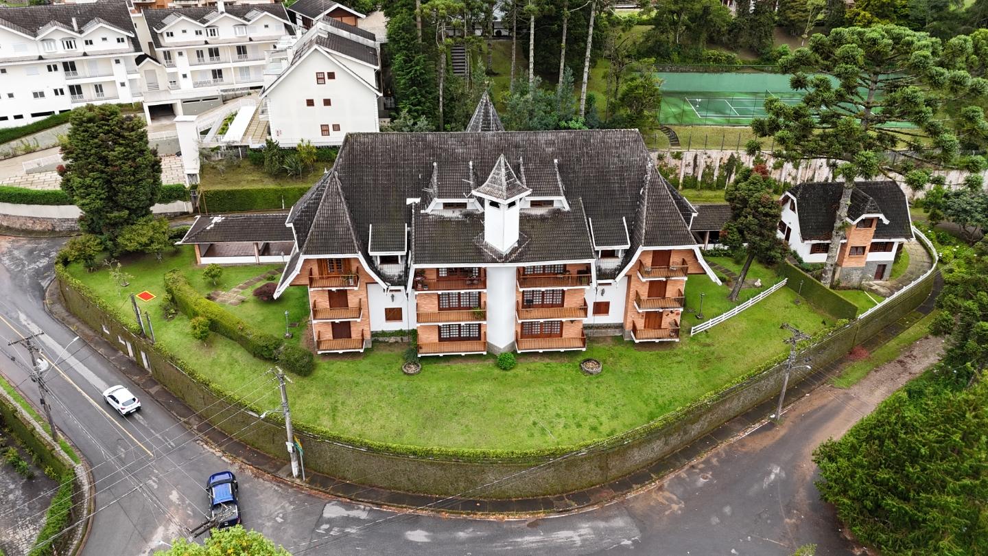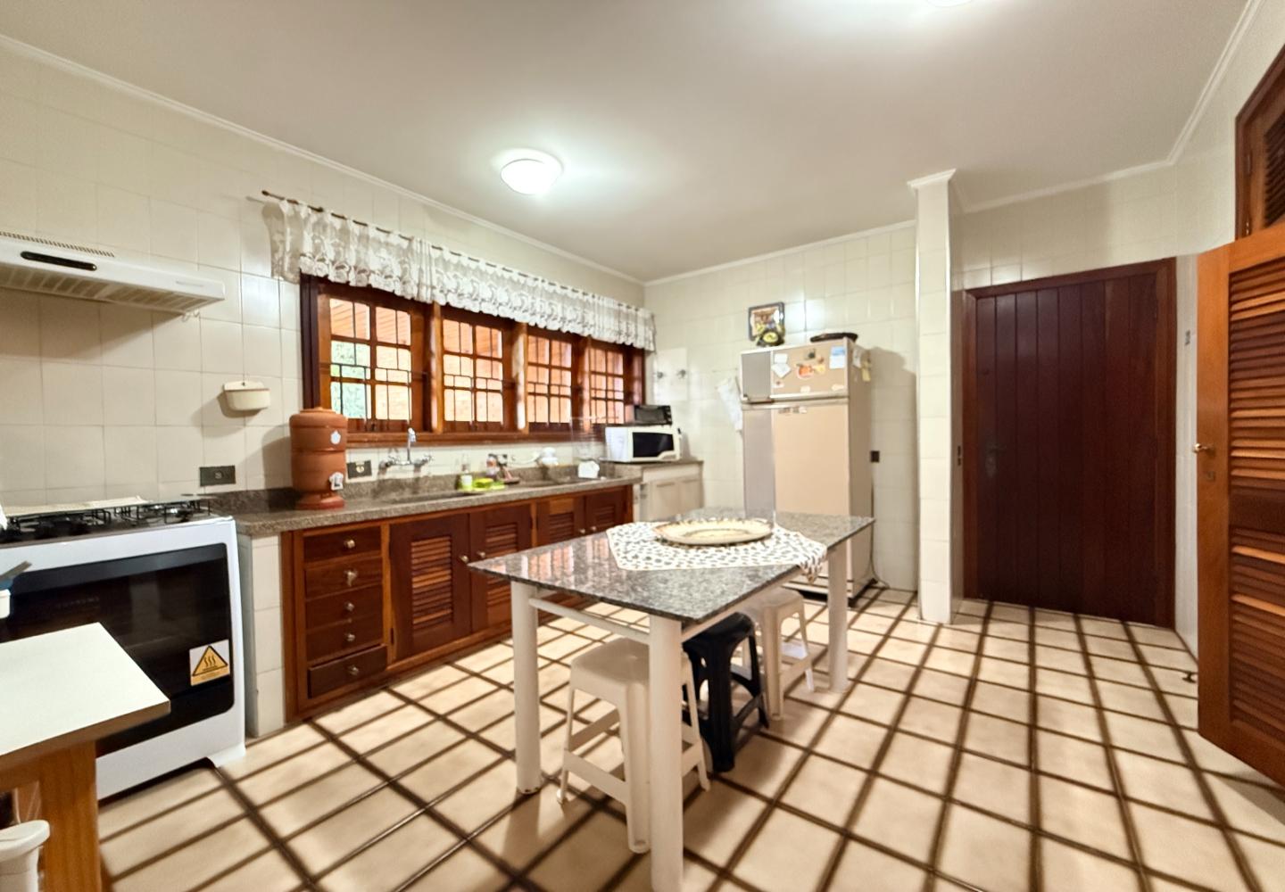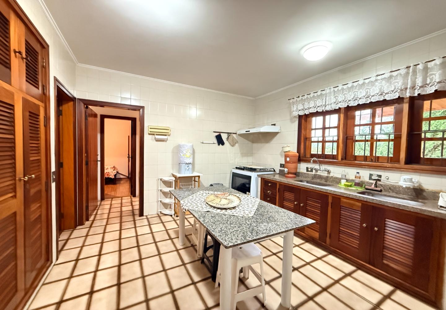A presença da madeira nos acabamentos, junto à marcenaria e aos detalhes mais clássicos, traz uma leitura bem característica da serra, com espaços confortáveis e funcionais no dia a dia. A cozinha tem proporções adequadas, com apoio de lavanderia e dependência completa de serviço.