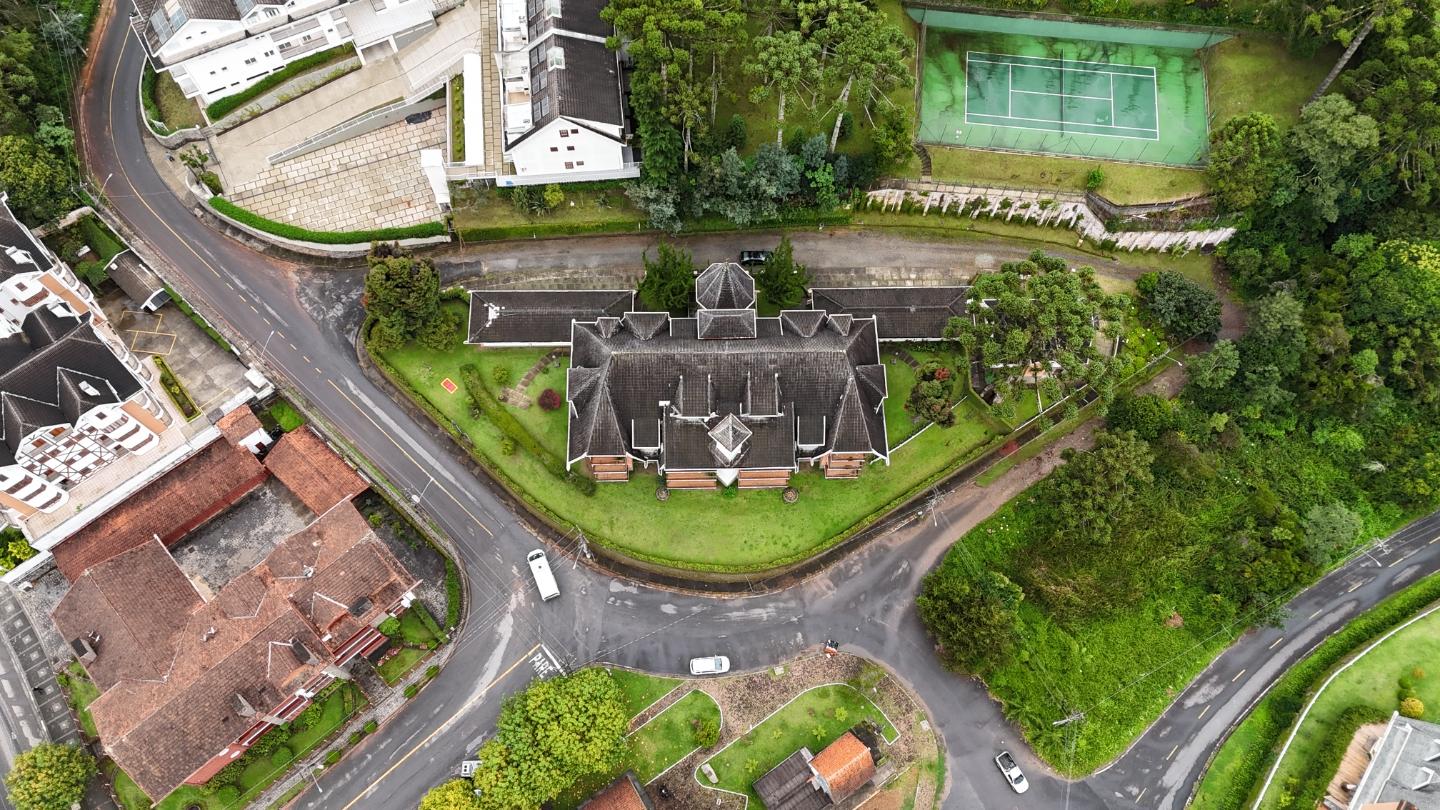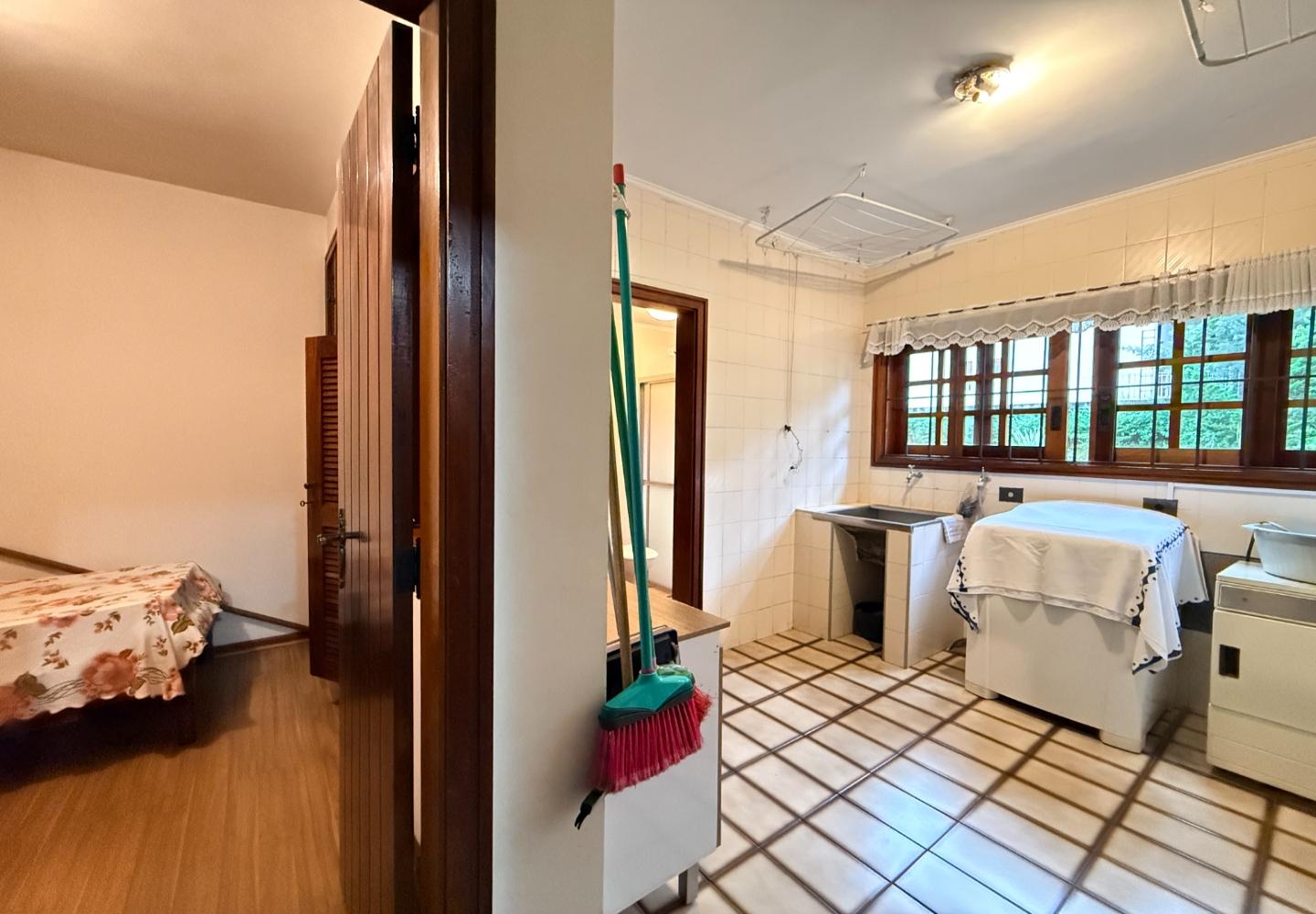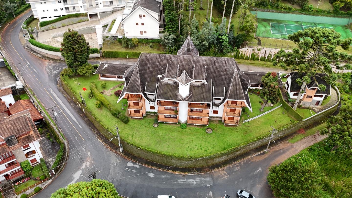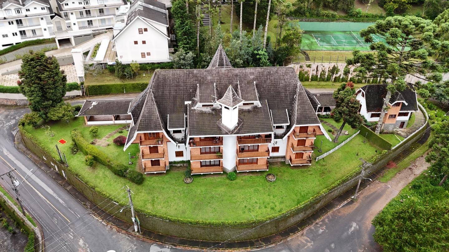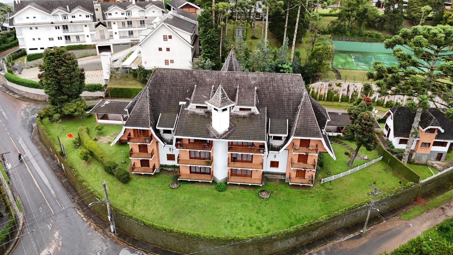 A presença da madeira nos acabamentos, junto à marcenaria e aos detalhes mais clássicos, traz uma leitura bem característica da serra, com espaços confortáveis e funcionais no dia a dia. A cozinha tem proporções adequadas, com apoio de lavanderia e dependência completa de serviço.
