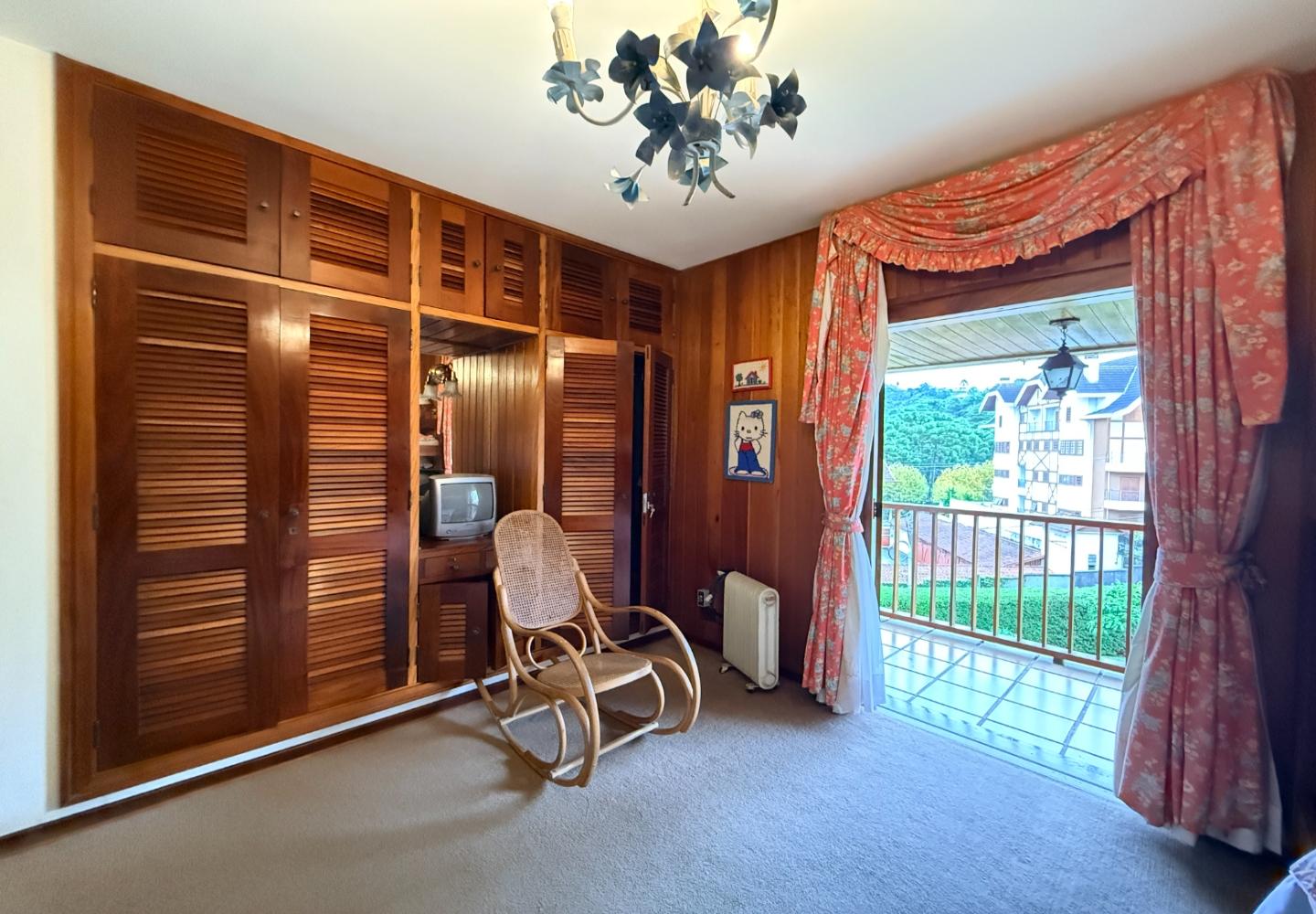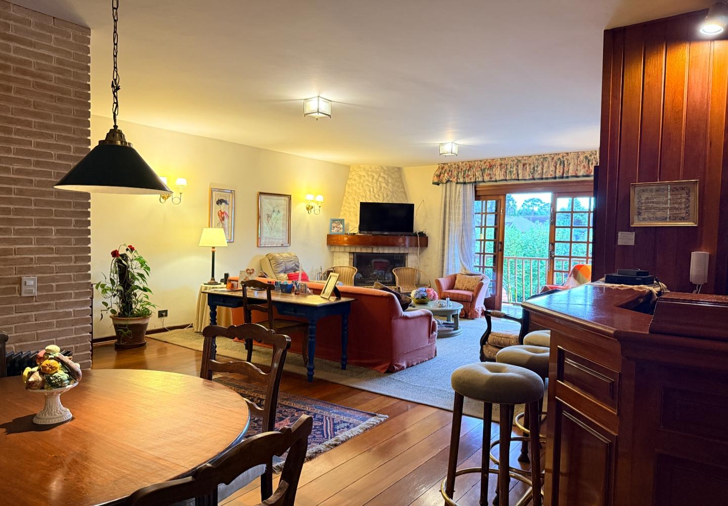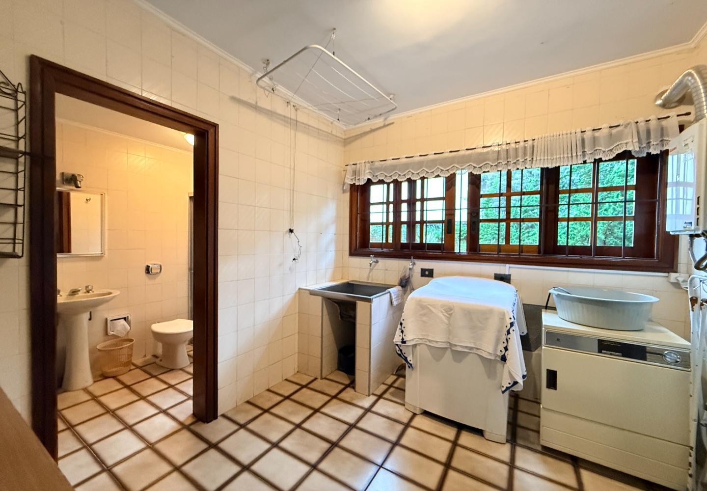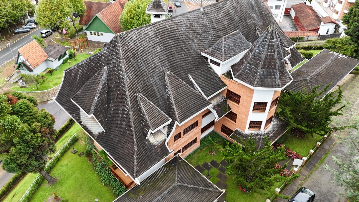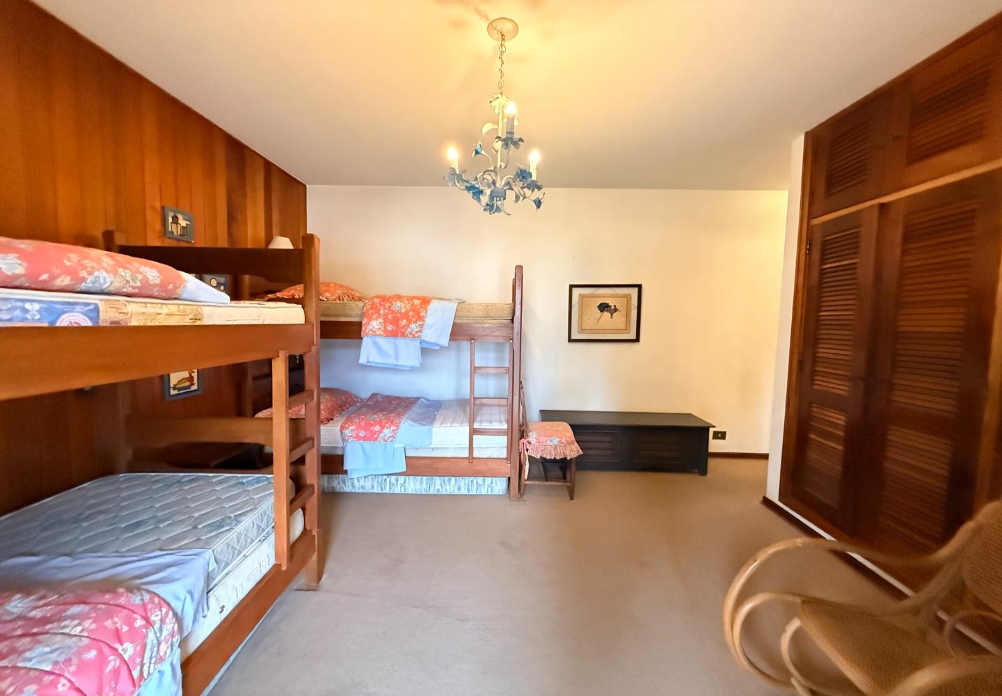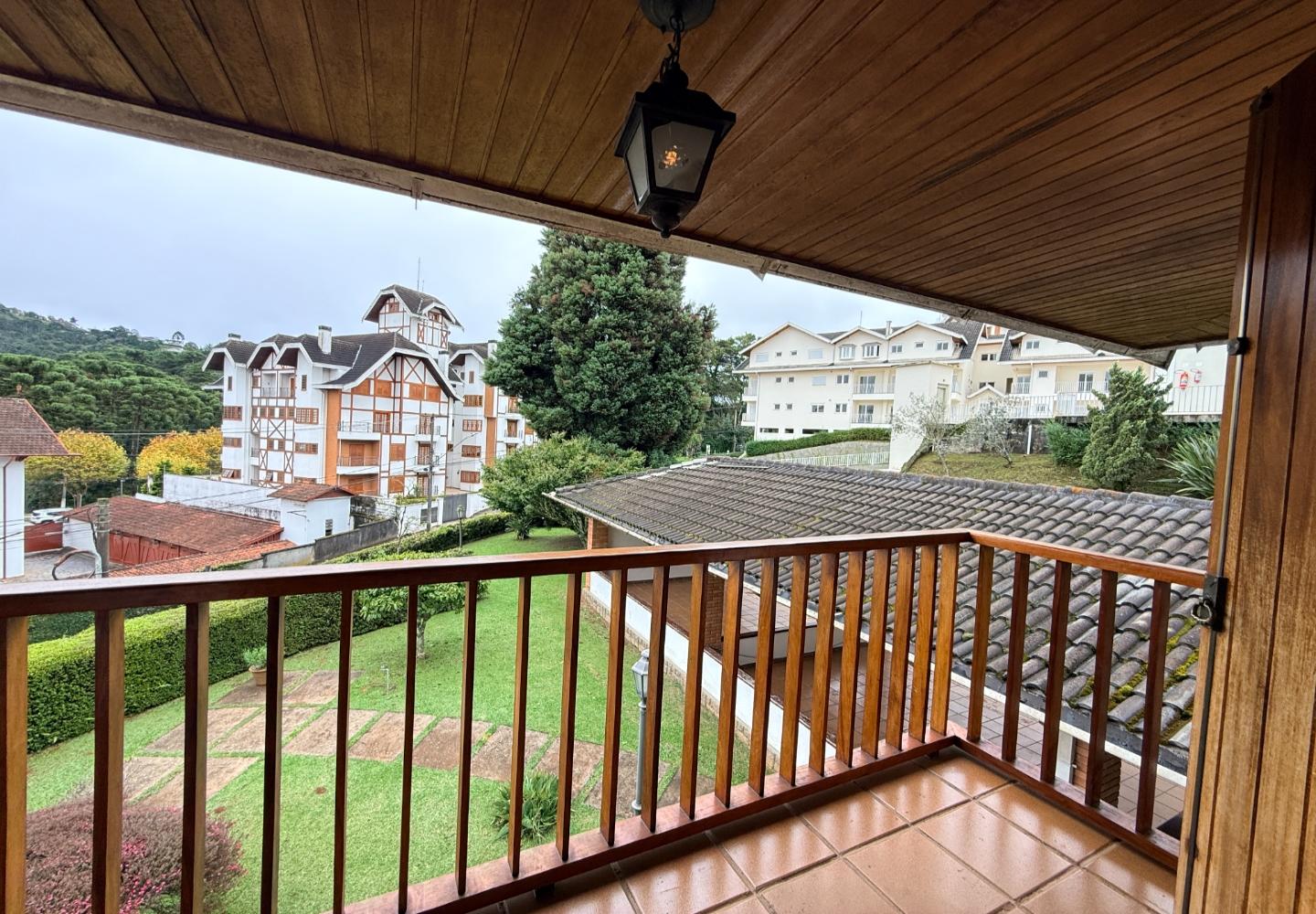 A presença da madeira nos acabamentos, junto à marcenaria e aos detalhes mais clássicos, traz uma leitura bem característica da serra, com espaços confortáveis e funcionais no dia a dia. A cozinha tem proporções adequadas, com apoio de lavanderia e dependência completa de serviço.