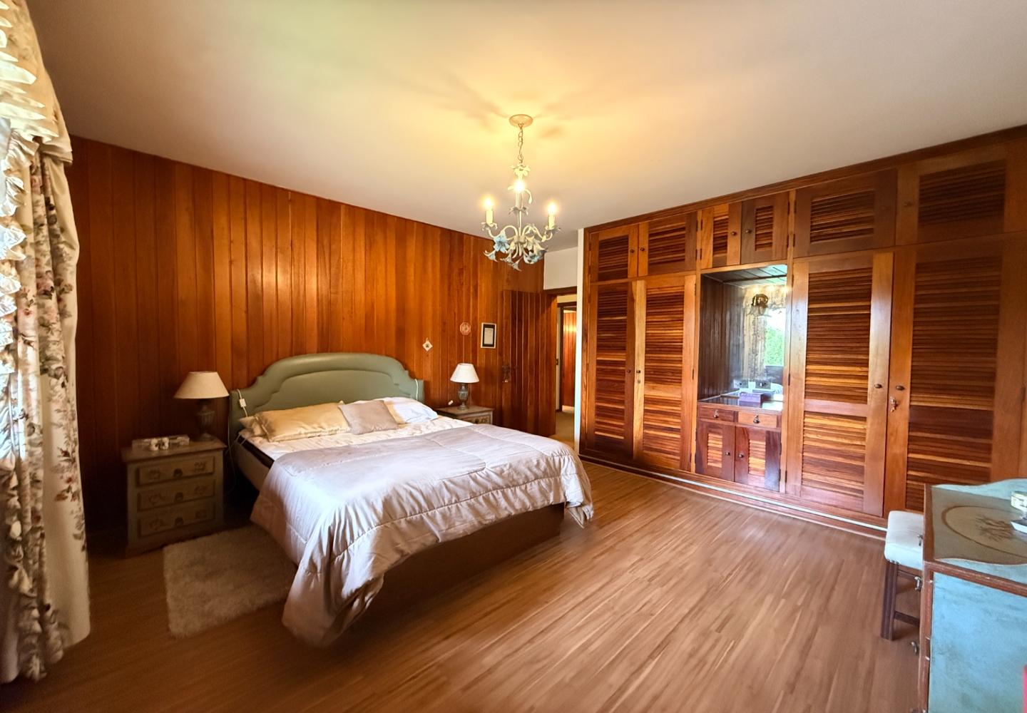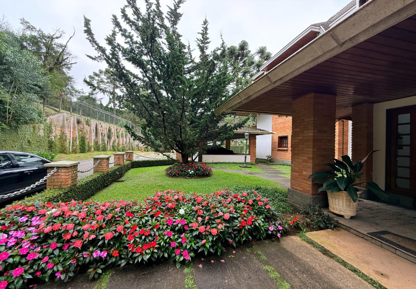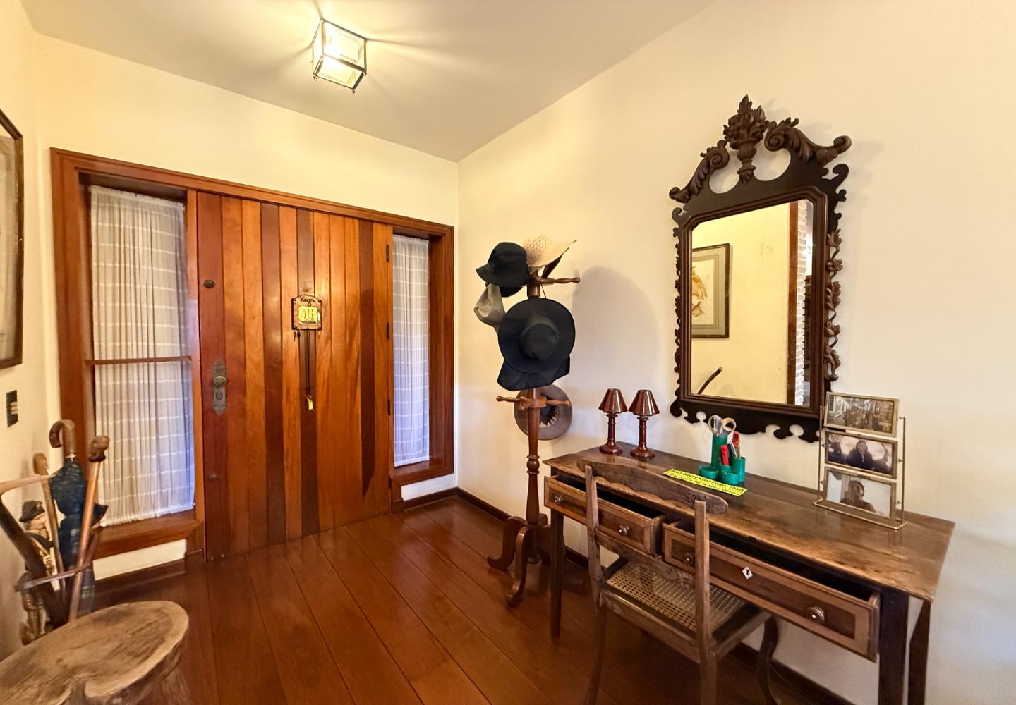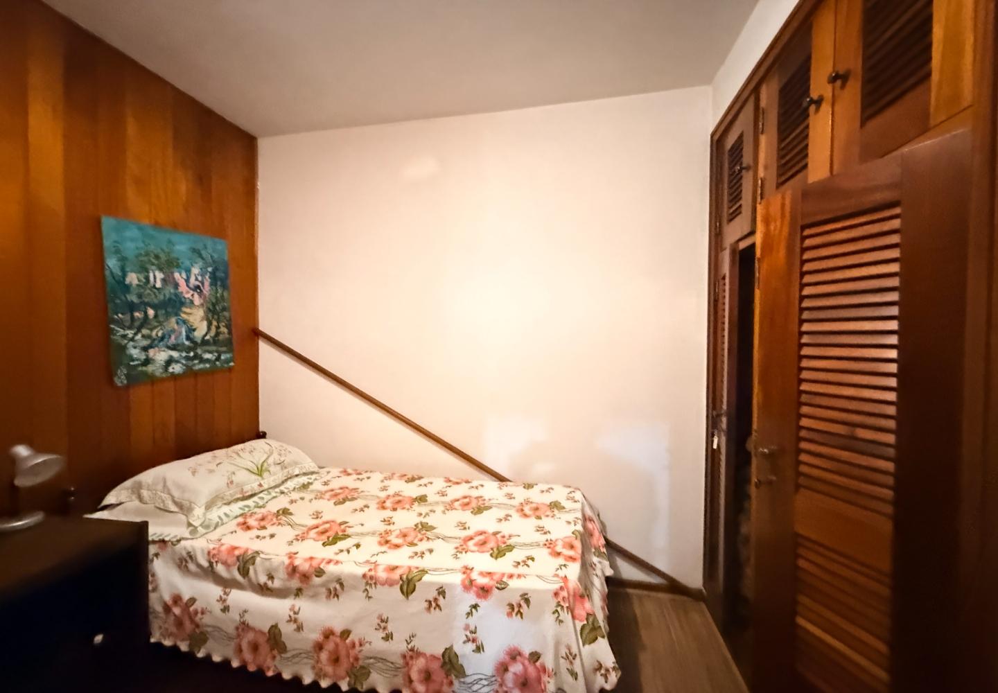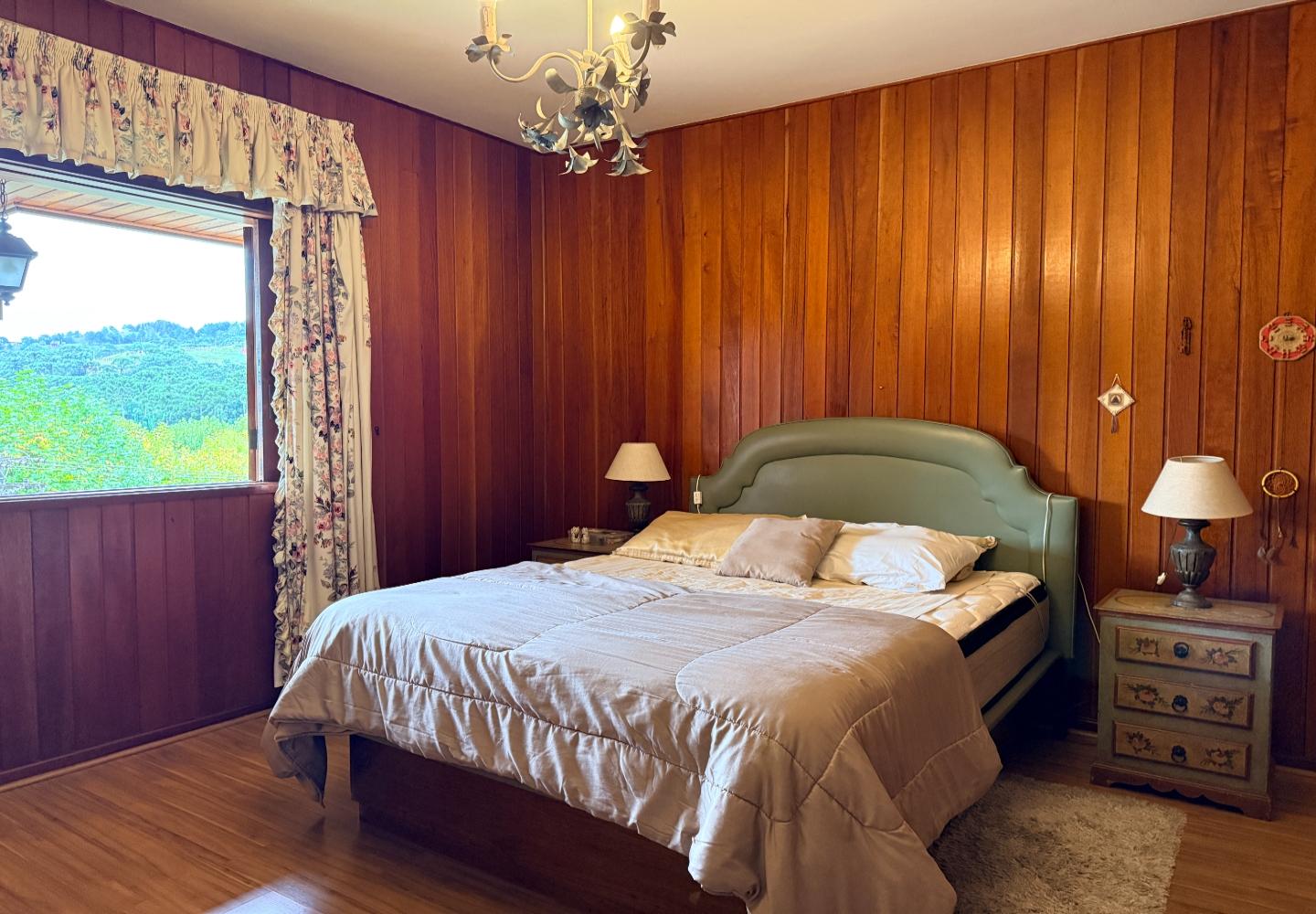 A presença da madeira nos acabamentos, junto à marcenaria e aos detalhes mais clássicos, traz uma leitura bem característica da serra, com espaços confortáveis e funcionais no dia a dia. A cozinha tem proporções adequadas, com apoio de lavanderia e dependência completa de serviço.