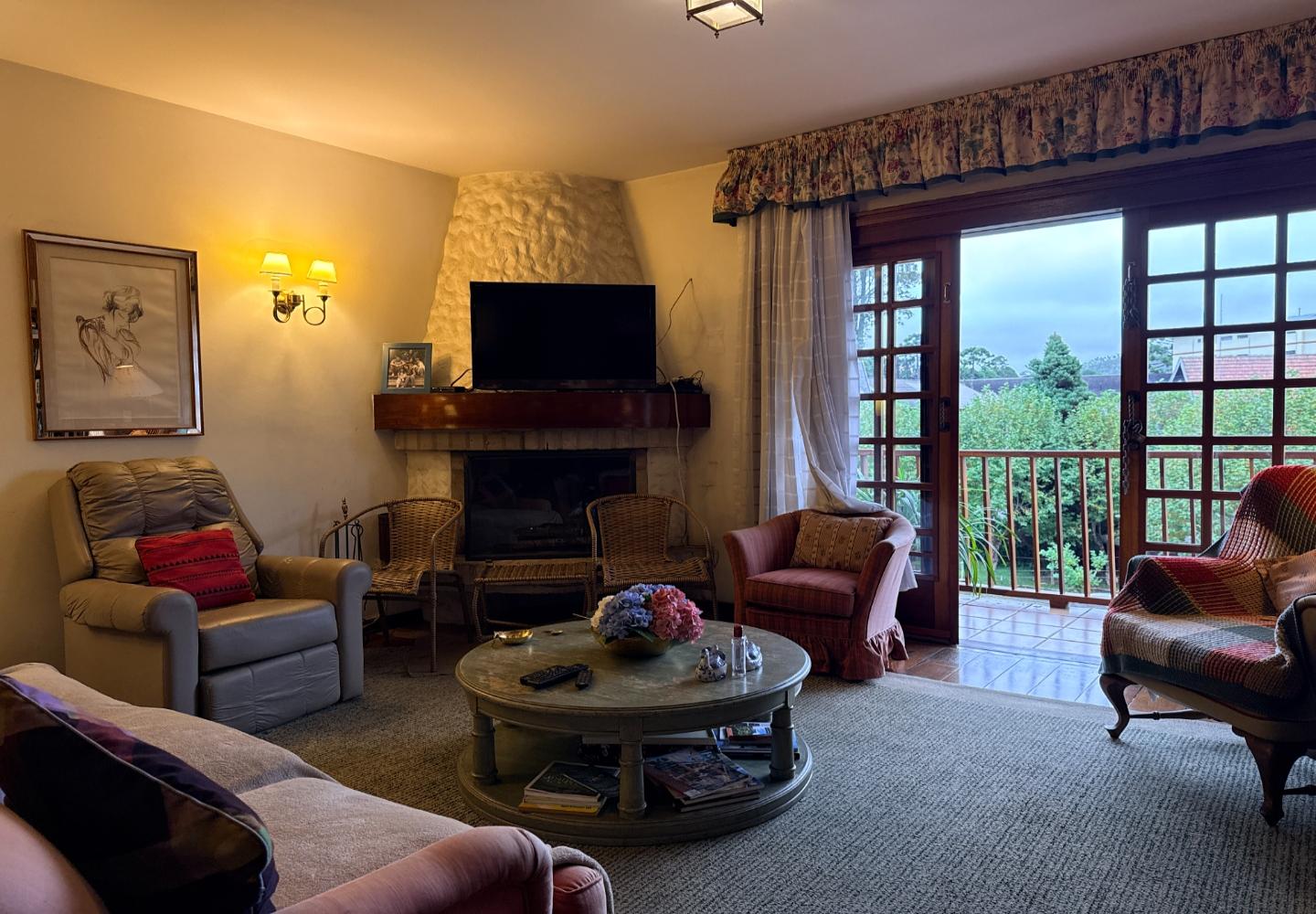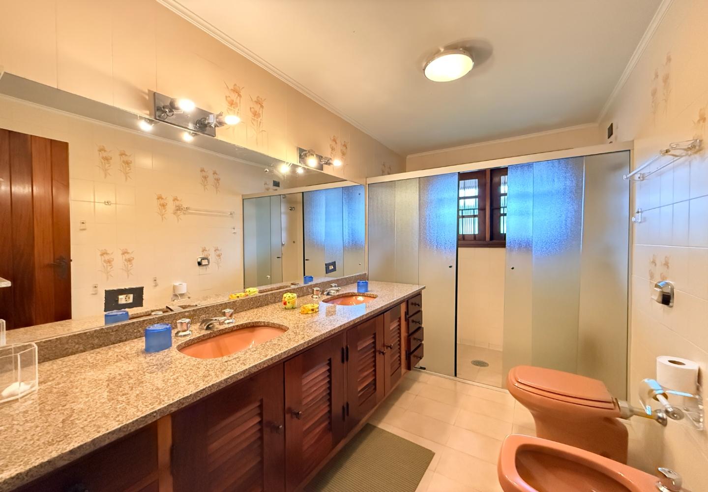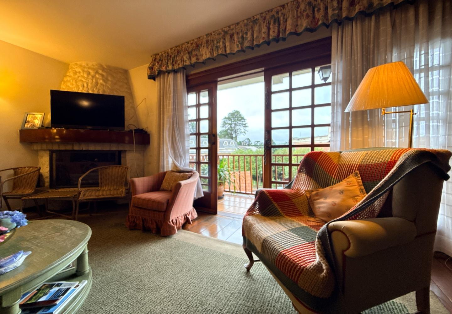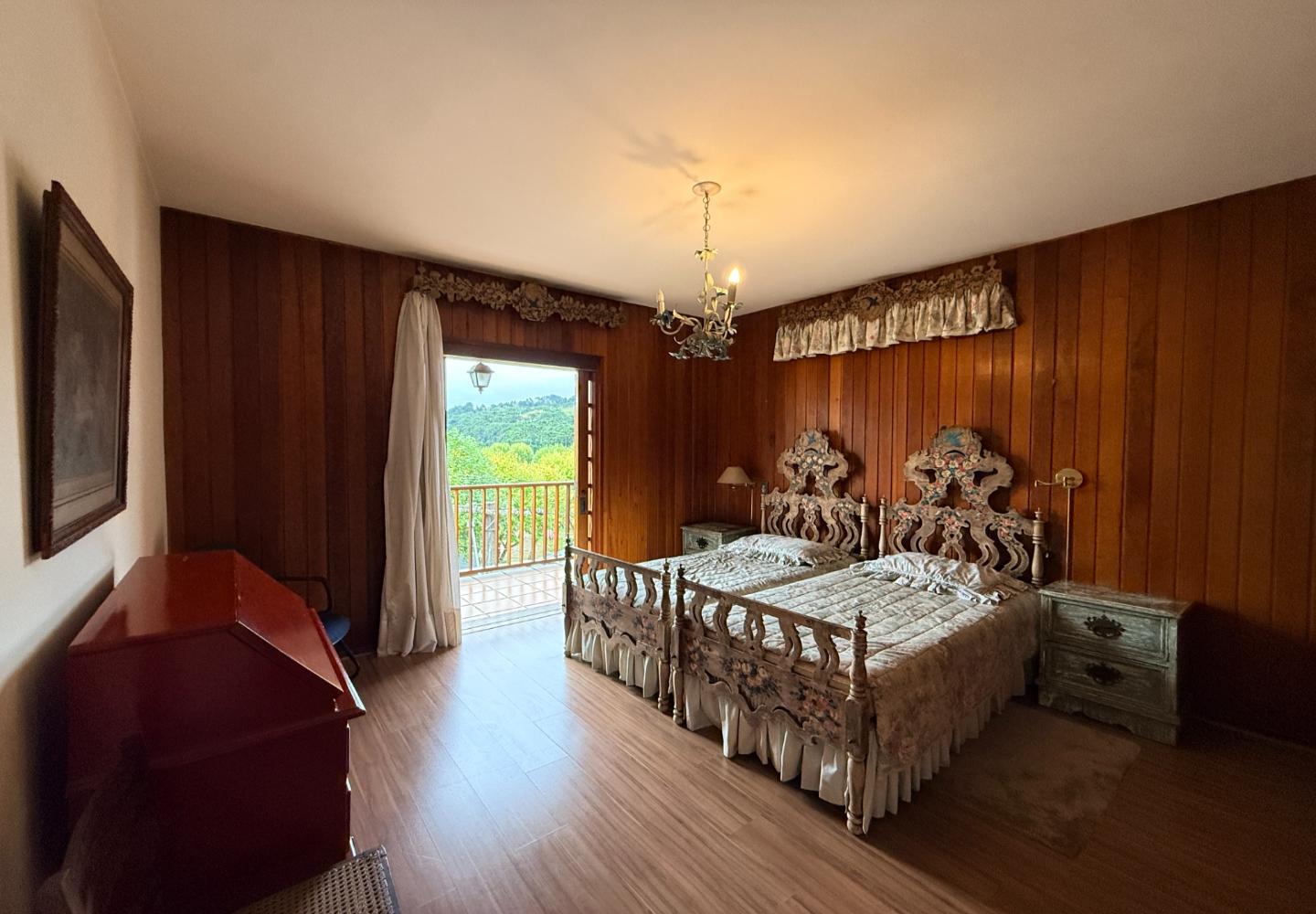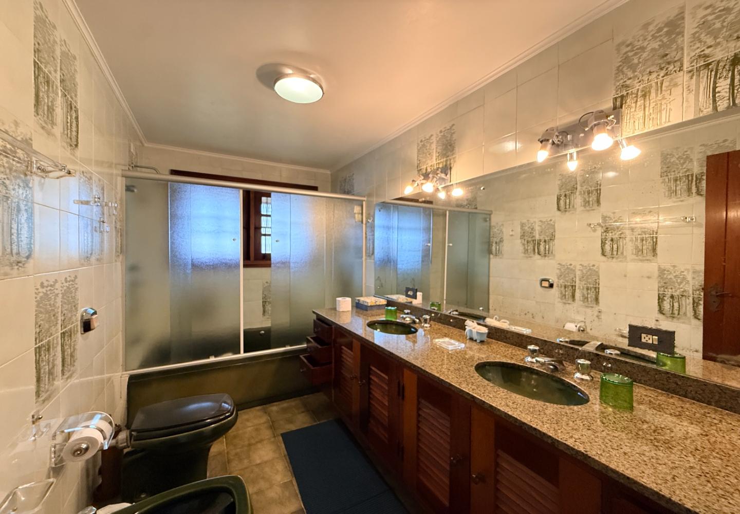A presença da madeira nos acabamentos, junto à marcenaria e aos detalhes mais clássicos, traz uma leitura bem característica da serra, com espaços confortáveis e funcionais no dia a dia. A cozinha tem proporções adequadas, com apoio de lavanderia e dependência completa de serviço.