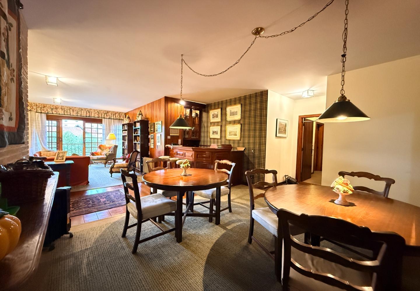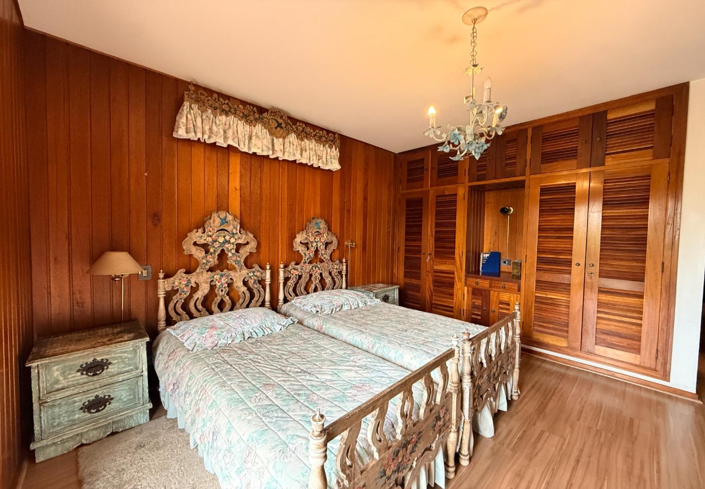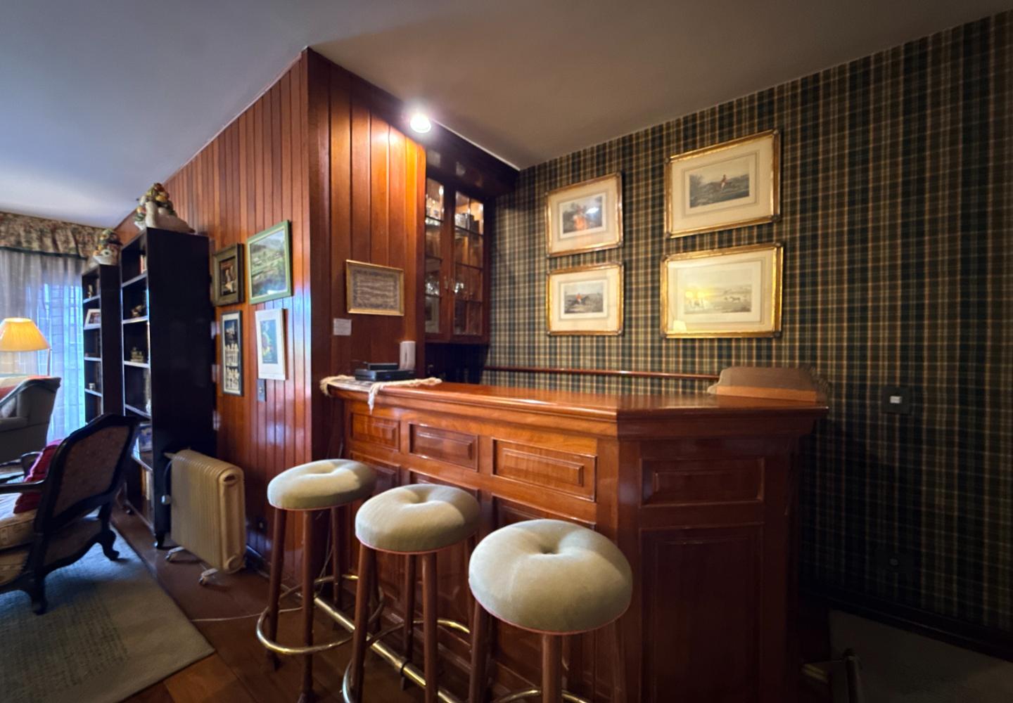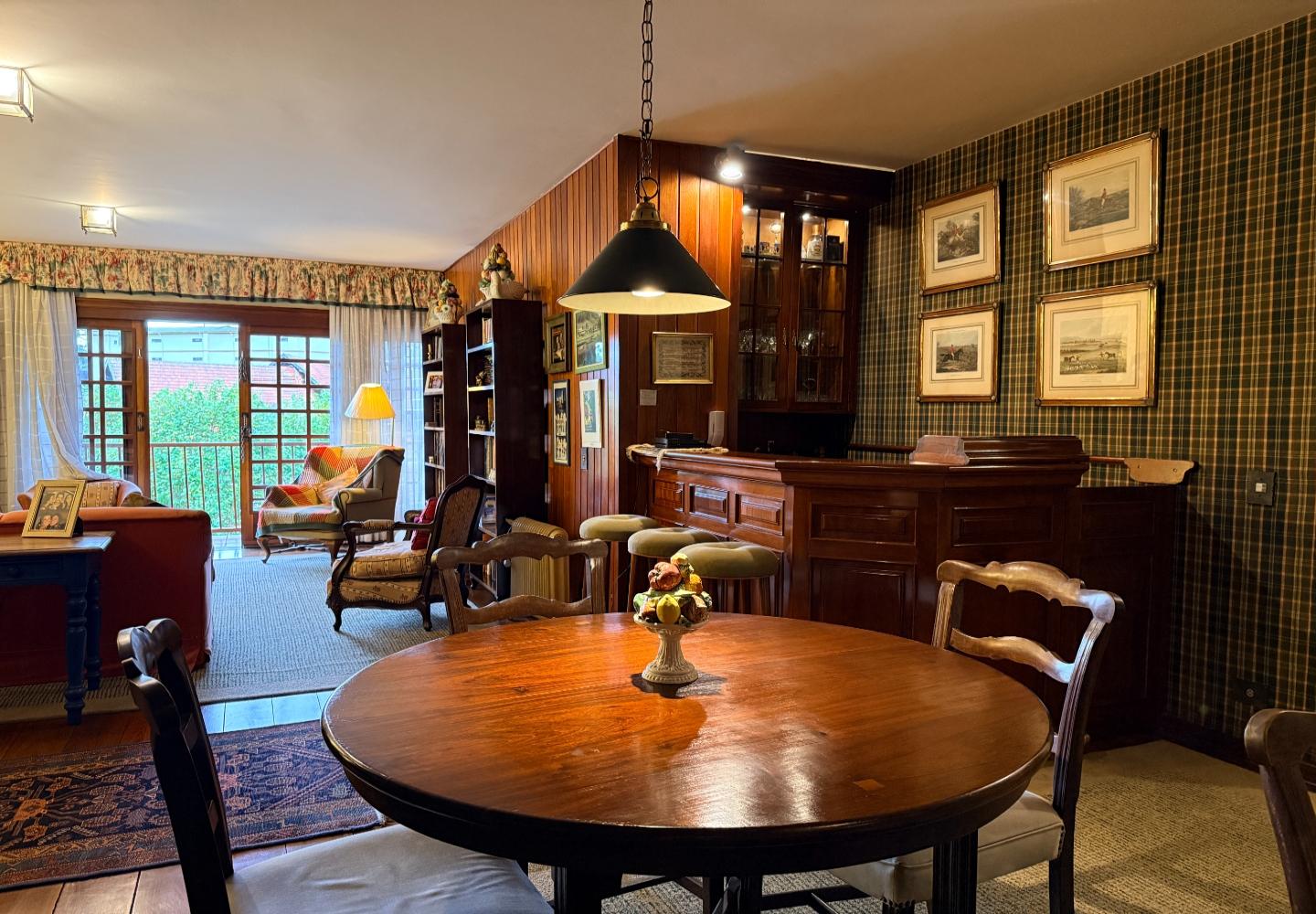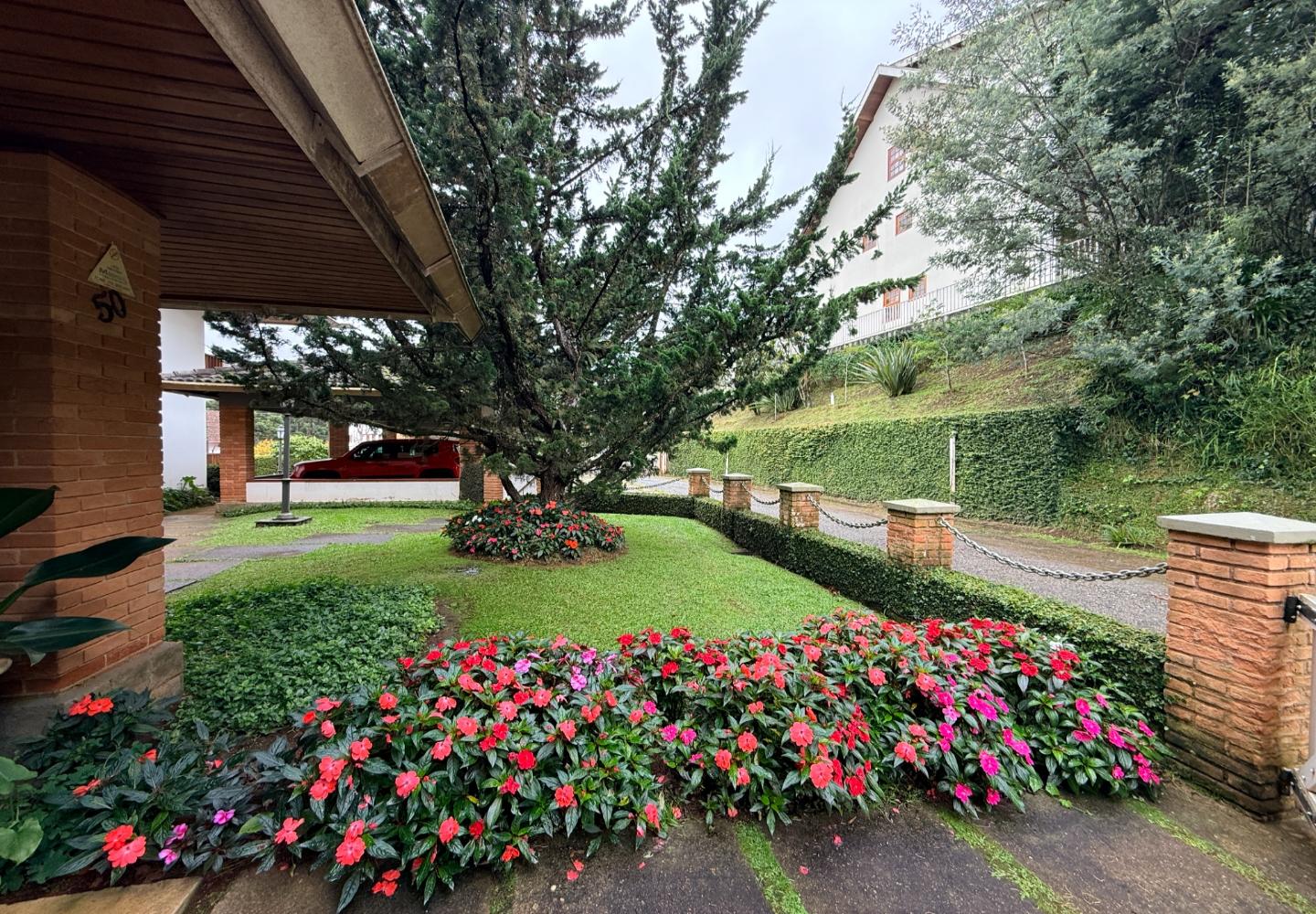 A presença da madeira nos acabamentos, junto à marcenaria e aos detalhes mais clássicos, traz uma leitura bem característica da serra, com espaços confortáveis e funcionais no dia a dia. A cozinha tem proporções adequadas, com apoio de lavanderia e dependência completa de serviço.