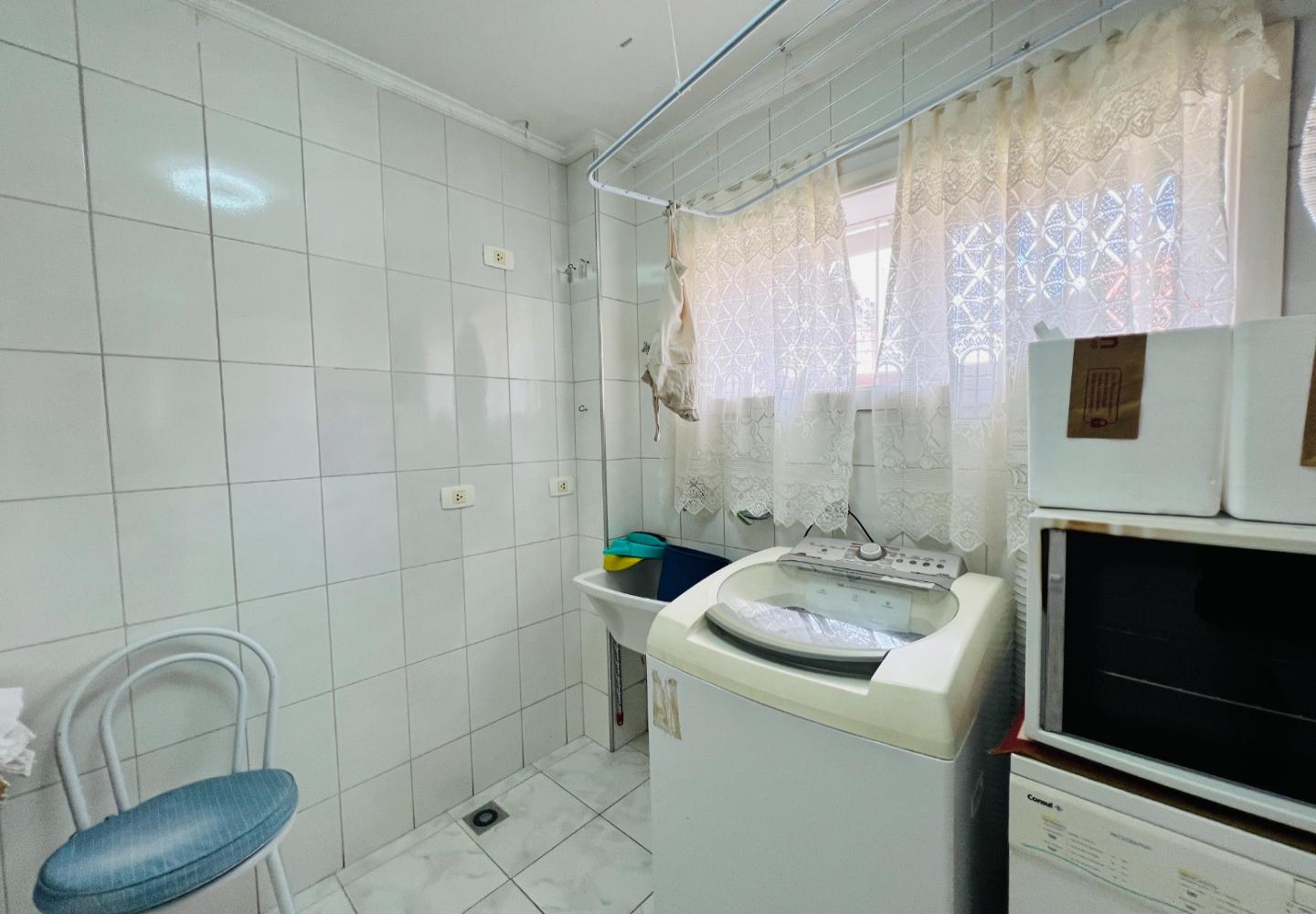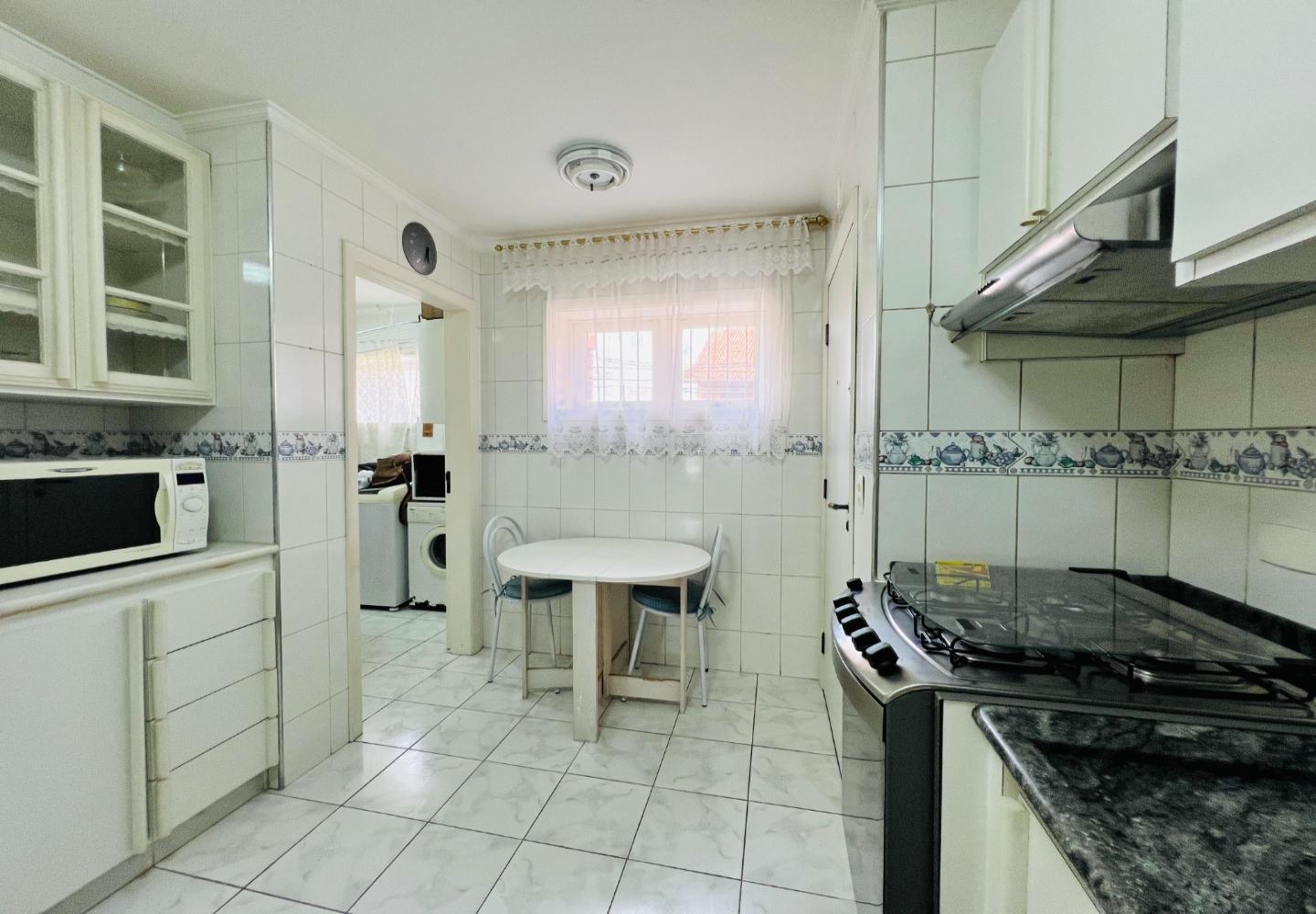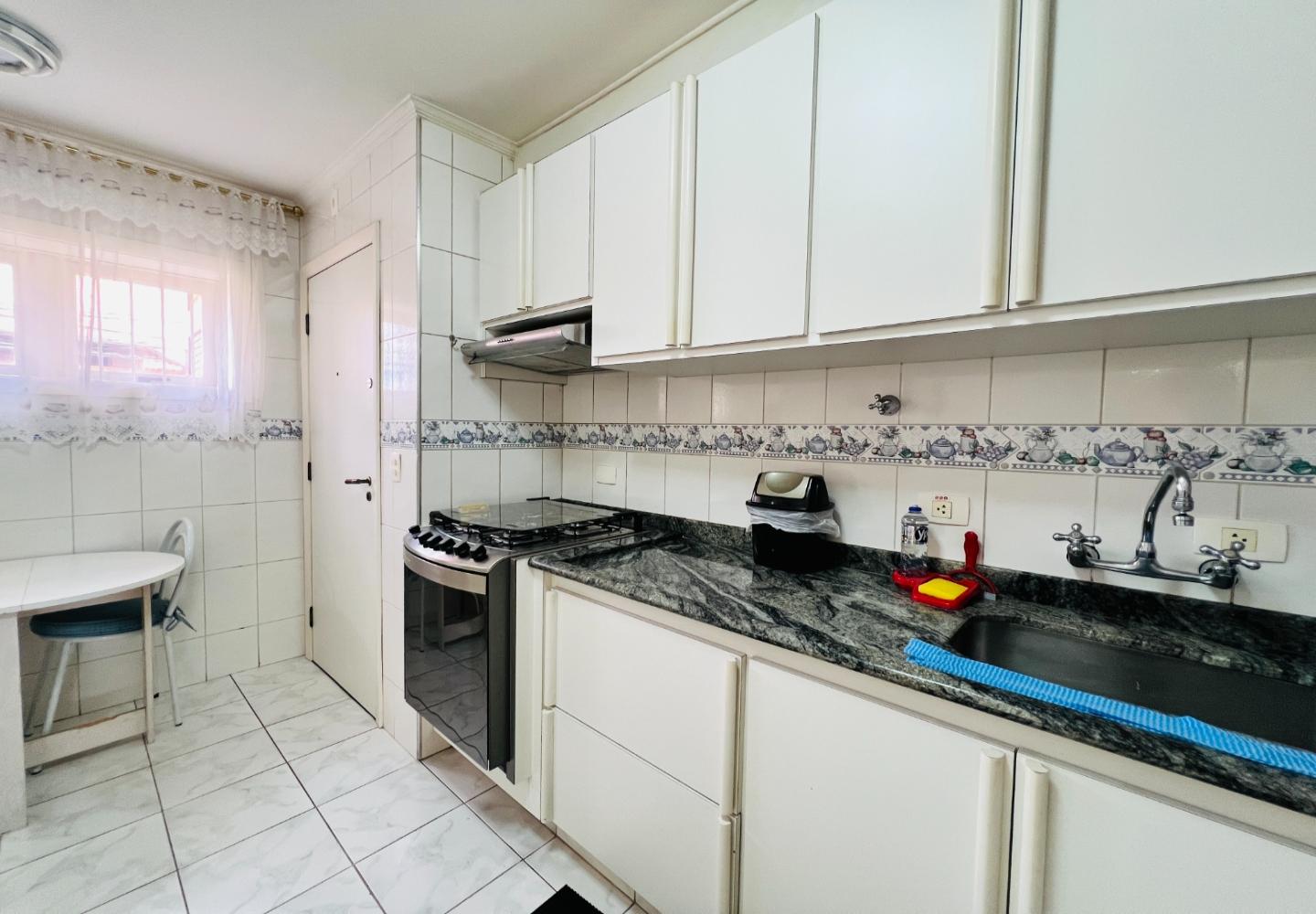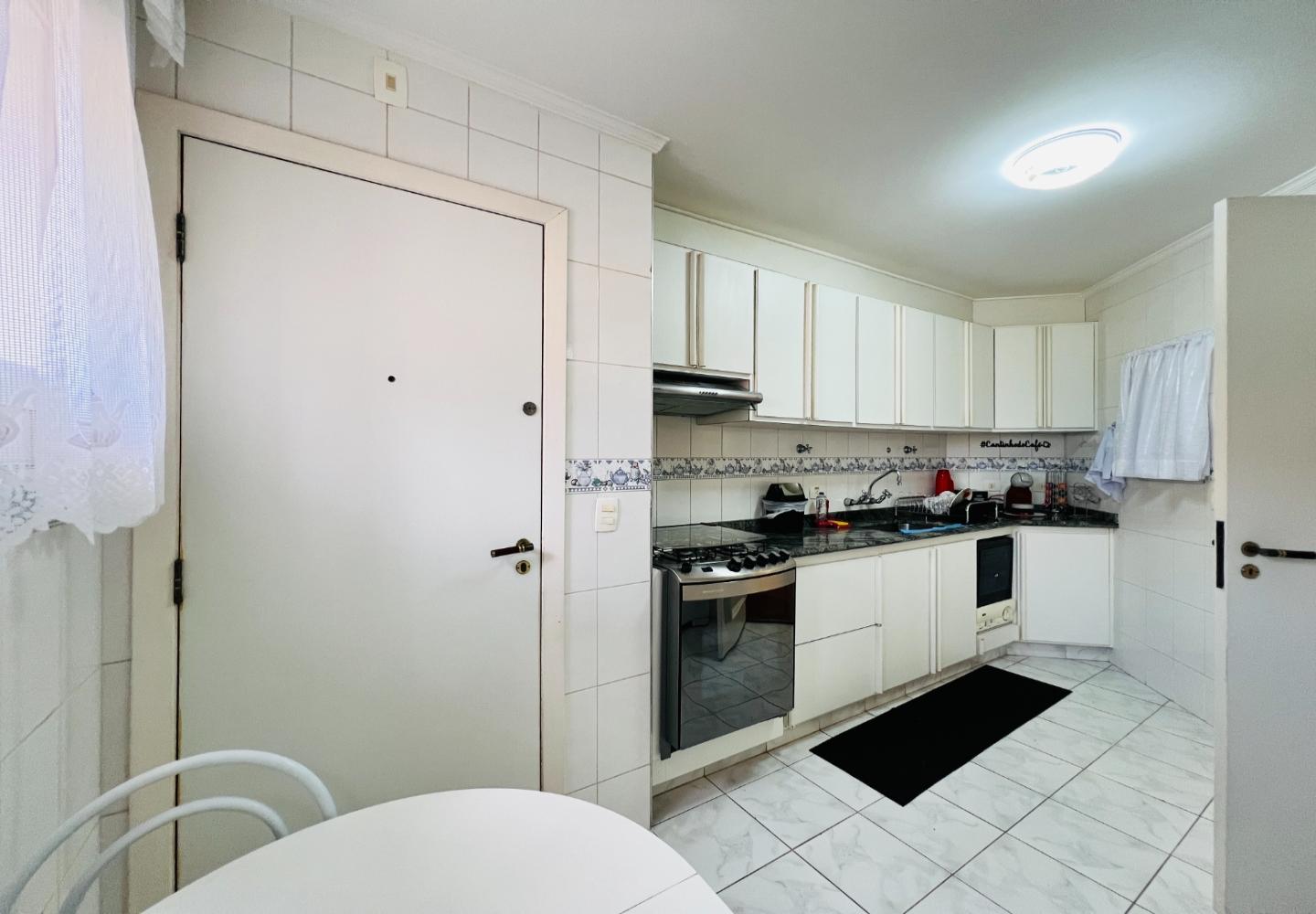 A cozinha é planejada, funcional e bem iluminada, com área de serviço independente e aquecimento de passagem. O condomínio oferece elevador, sauna, salão de festas, playground, segurança 24 horas e duas vagas de garagem cobertas.