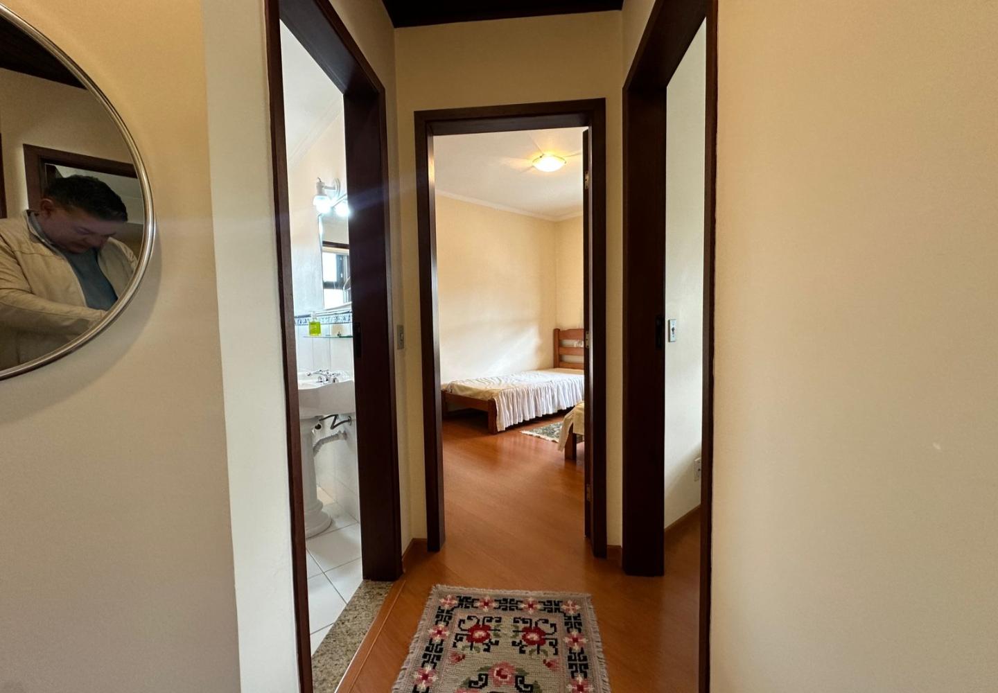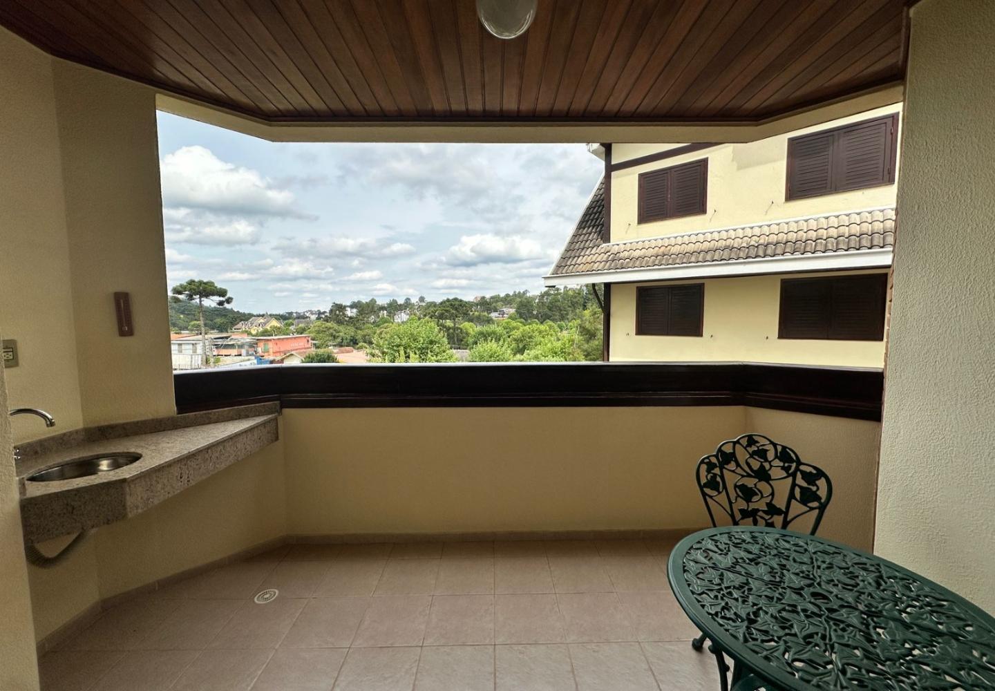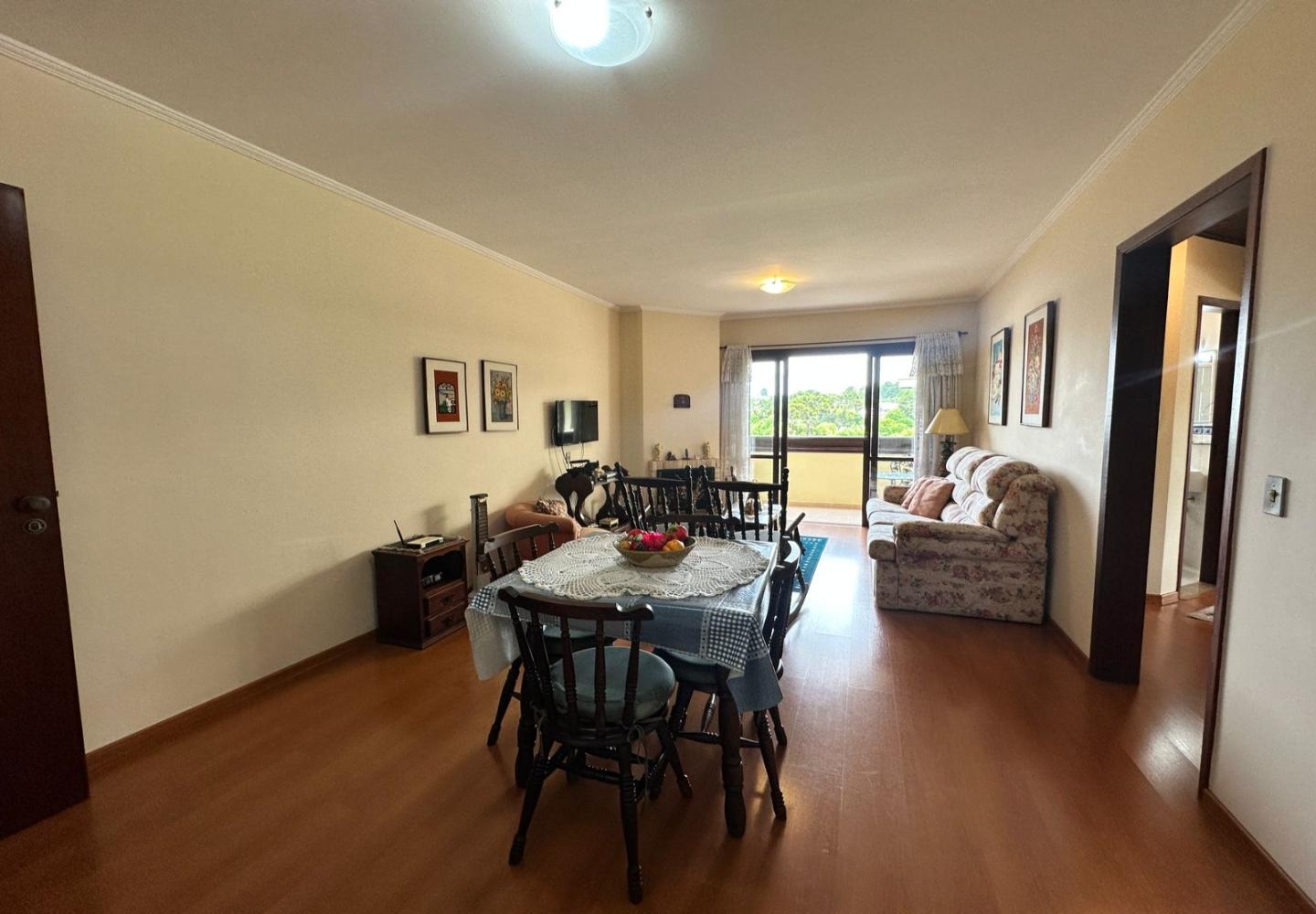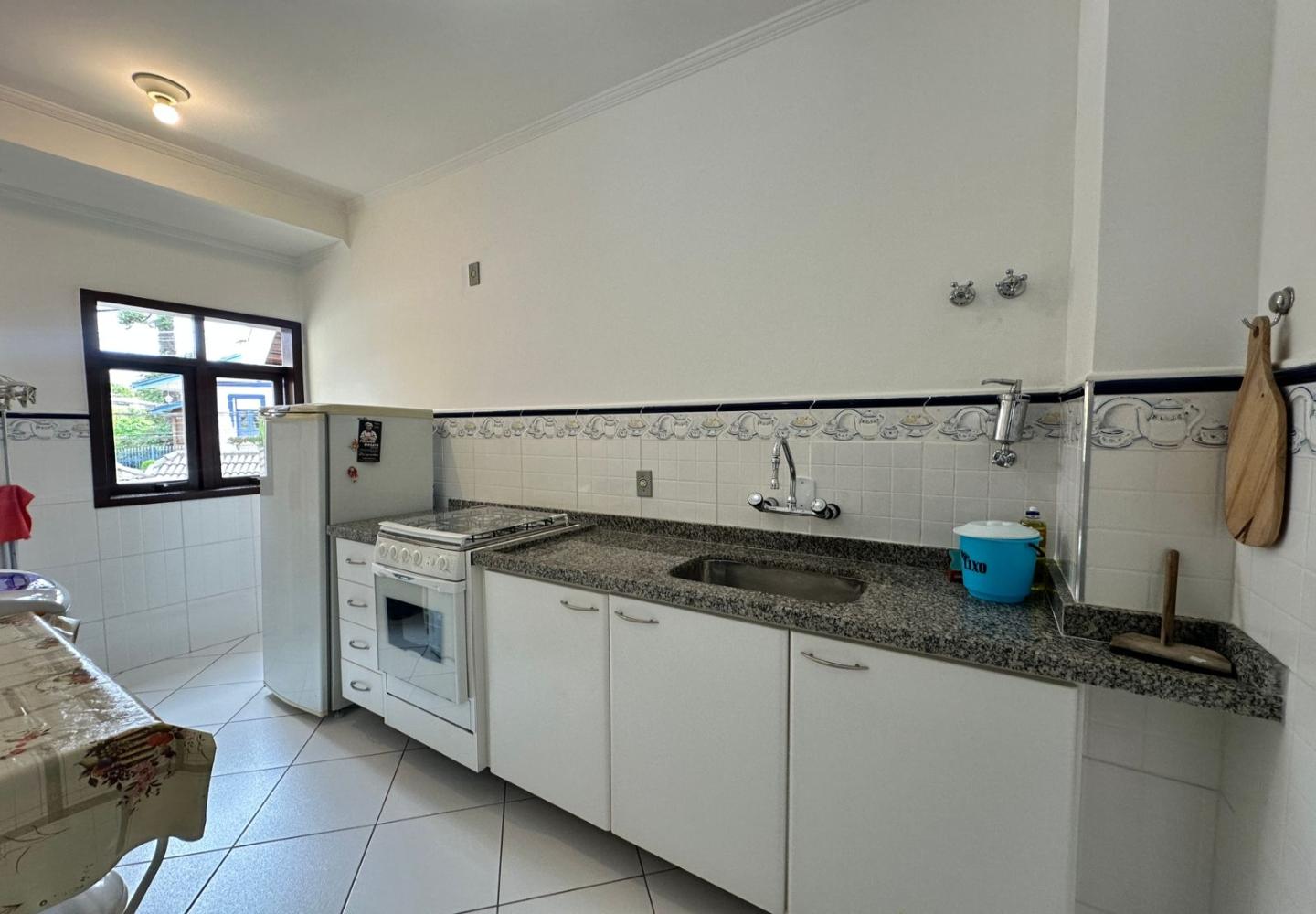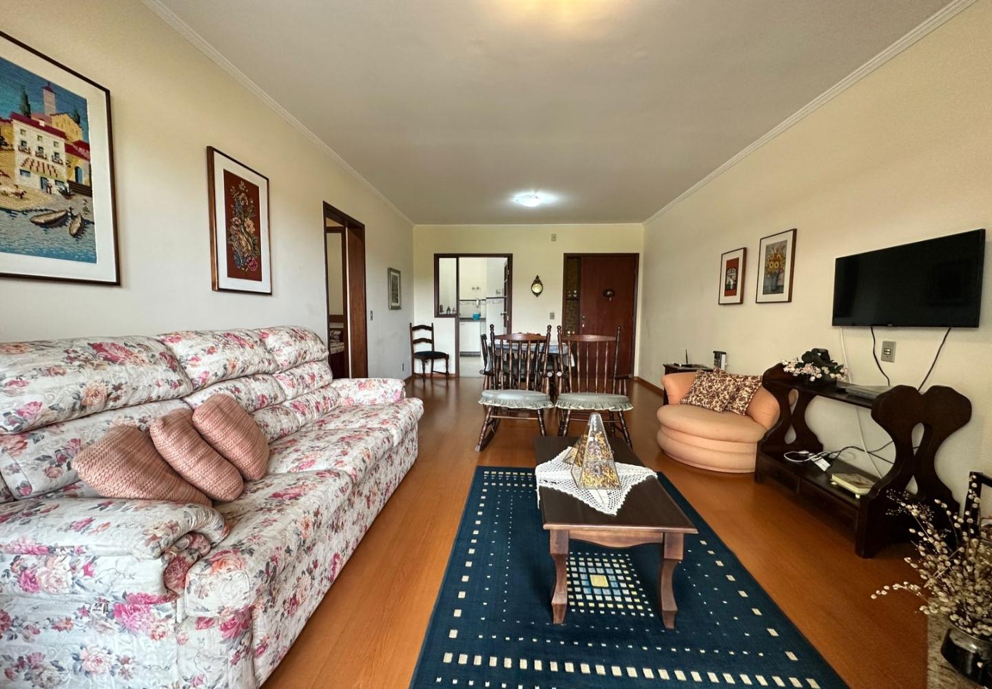 São três dormitórios, sendo uma suíte, além de banheiro social. Um dos quartos possui pequena varanda, trazendo ventilação e luz natural adicionais. A cozinha é planejada, com área de serviço separada, e o imóvel dispõe de uma vaga de garagem. Será vendido mobiliado, pronto para uso imediato.