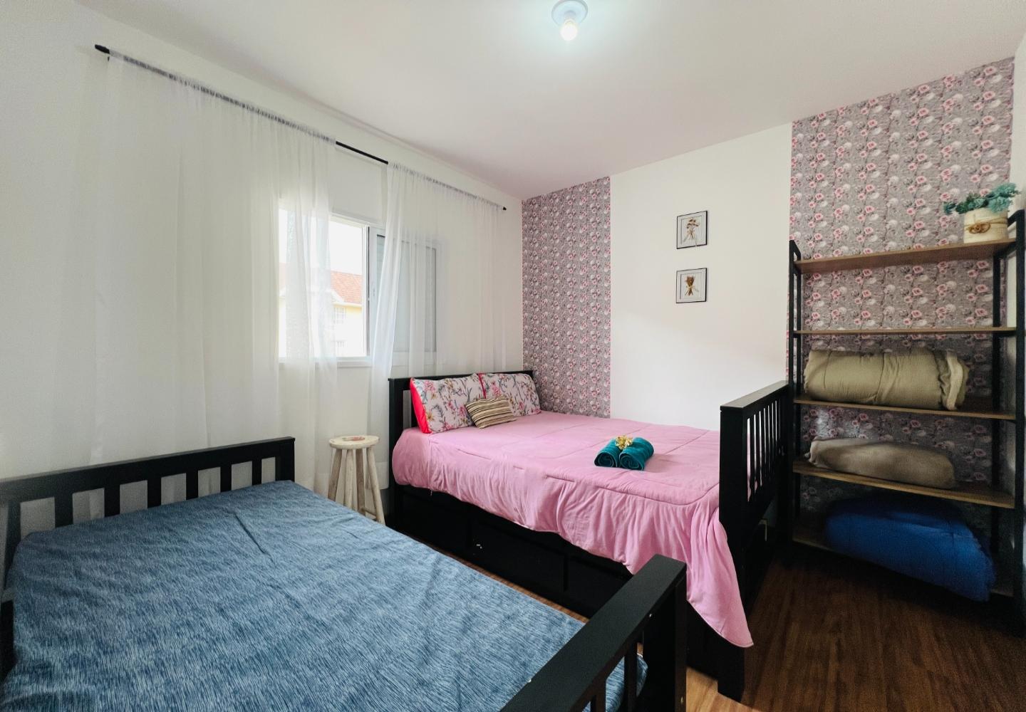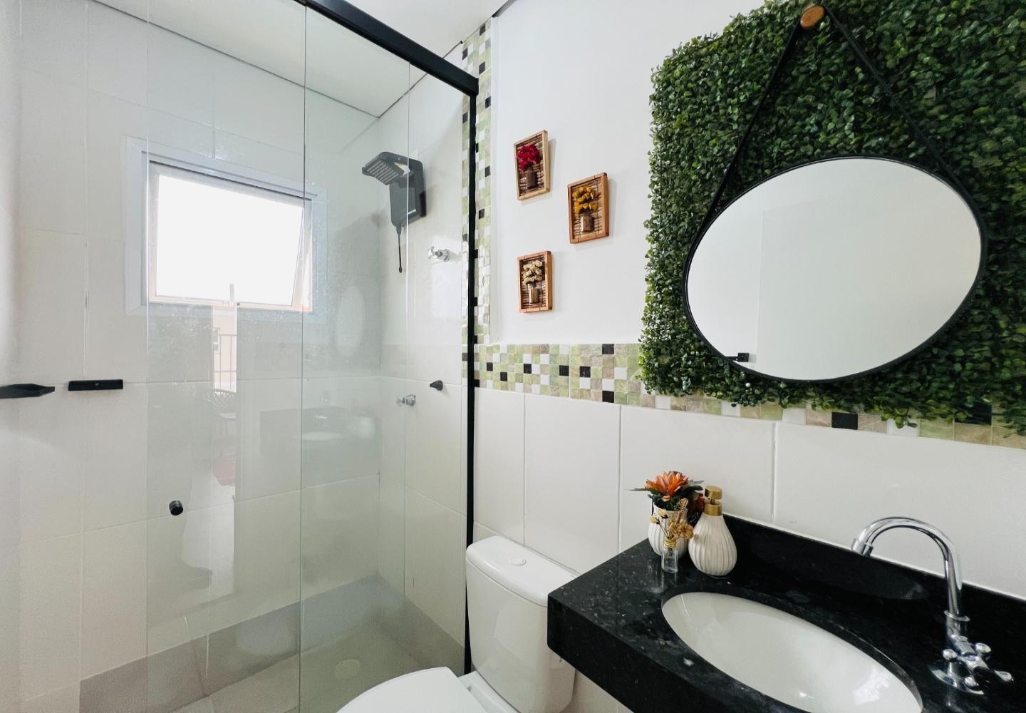 A área íntima conta com dois dormitórios proporcionais e um banheiro social com box em vidro e revestimentos neutros. Os espaços recebem iluminação uniforme ao longo do dia, mantendo bom conforto interno.