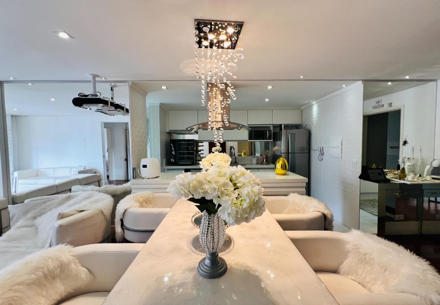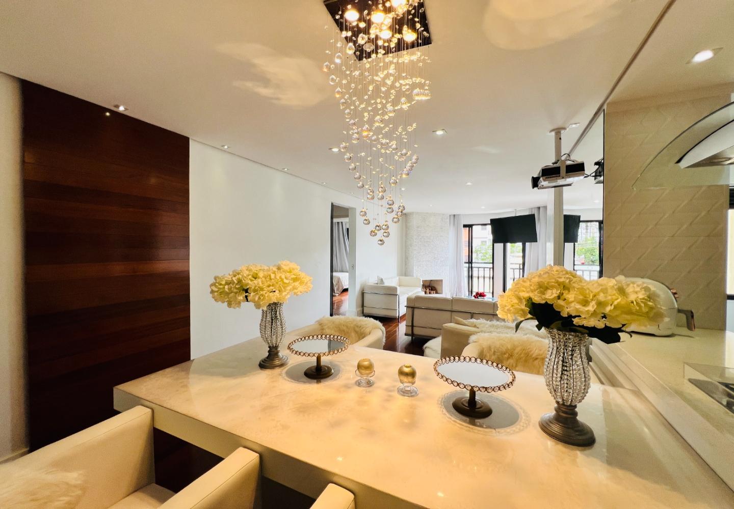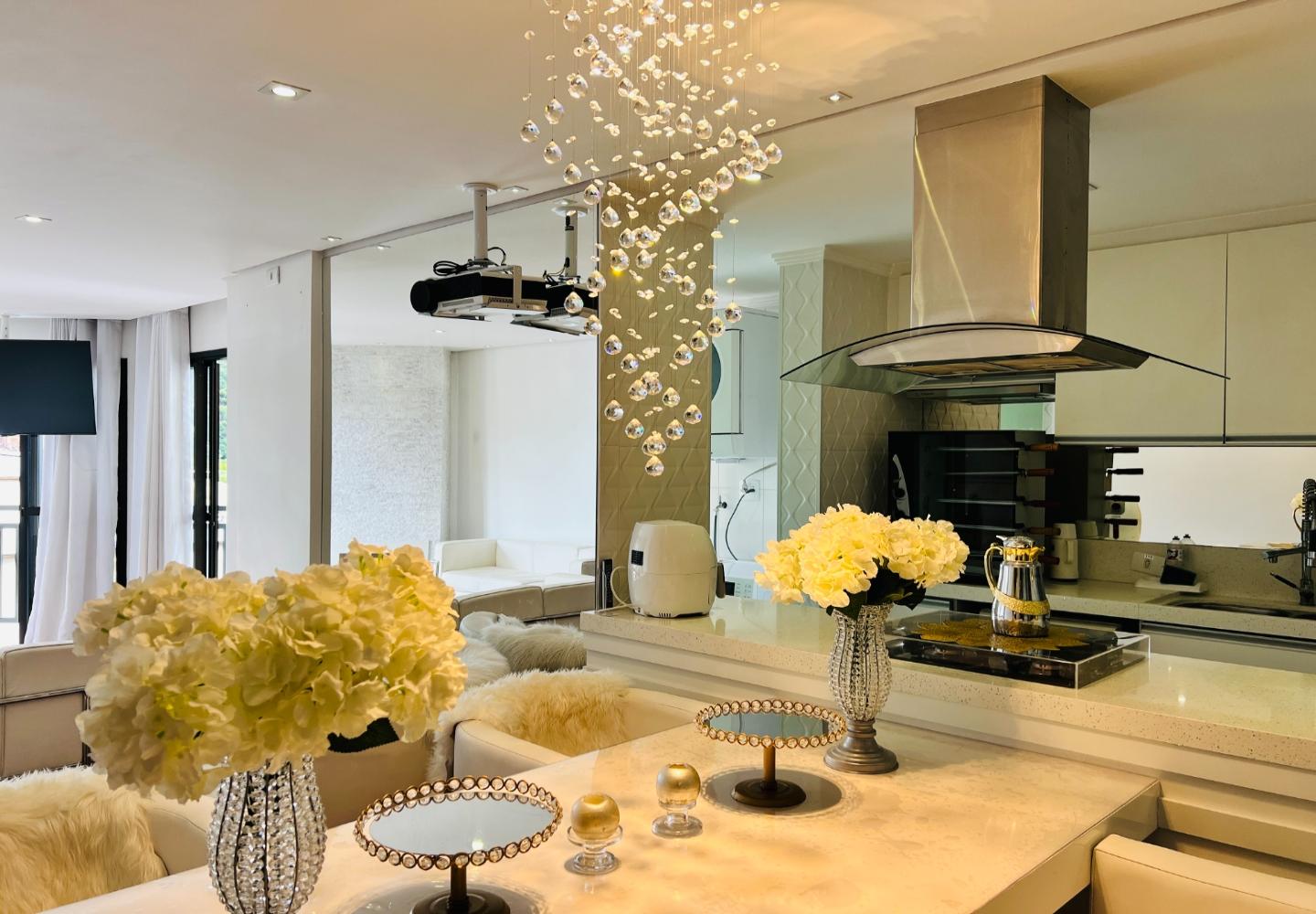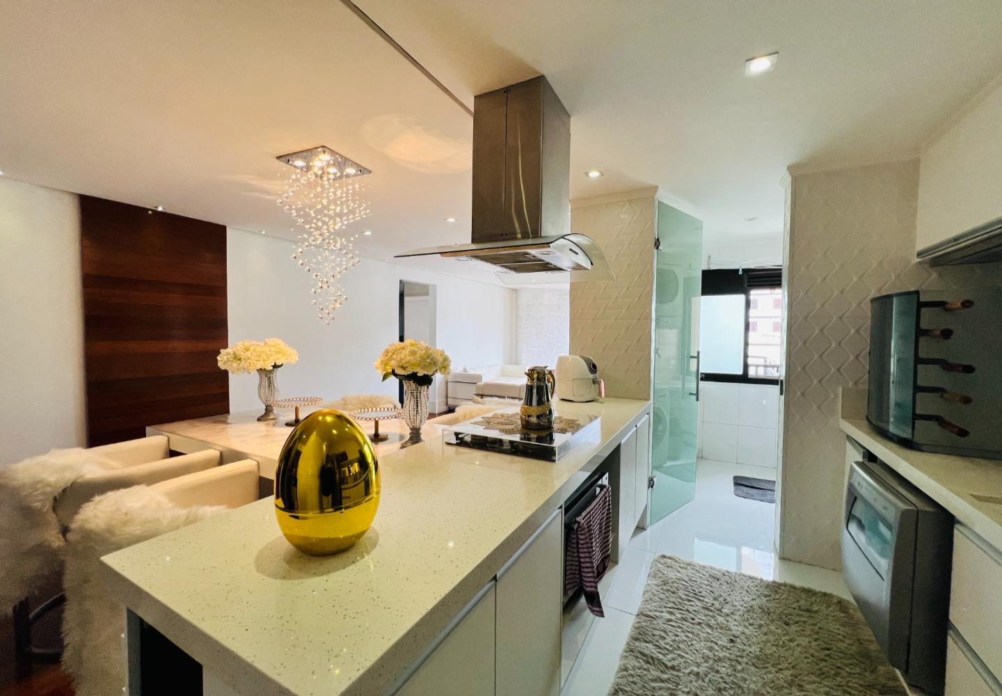 O imóvel será vendido mobiliado, com decoração em tons claros, iluminação embutida e detalhes que valorizam o conjunto, como o lustre em cristais sobre a bancada. São 3 dormitórios, sendo 1 suíte, todos com armários e boa ventilação, além de dois banheiros com acabamento em pedra e box em vidro.