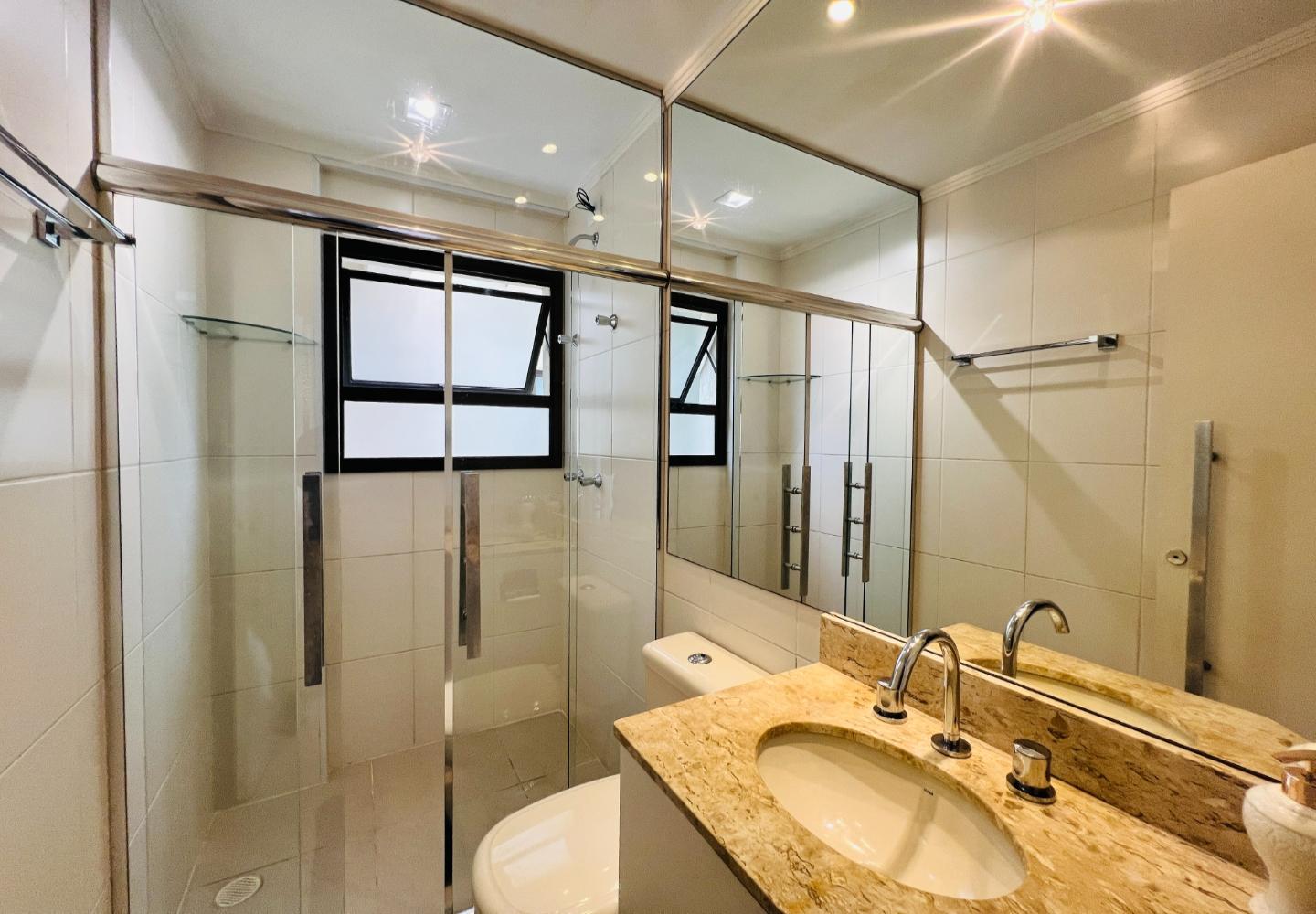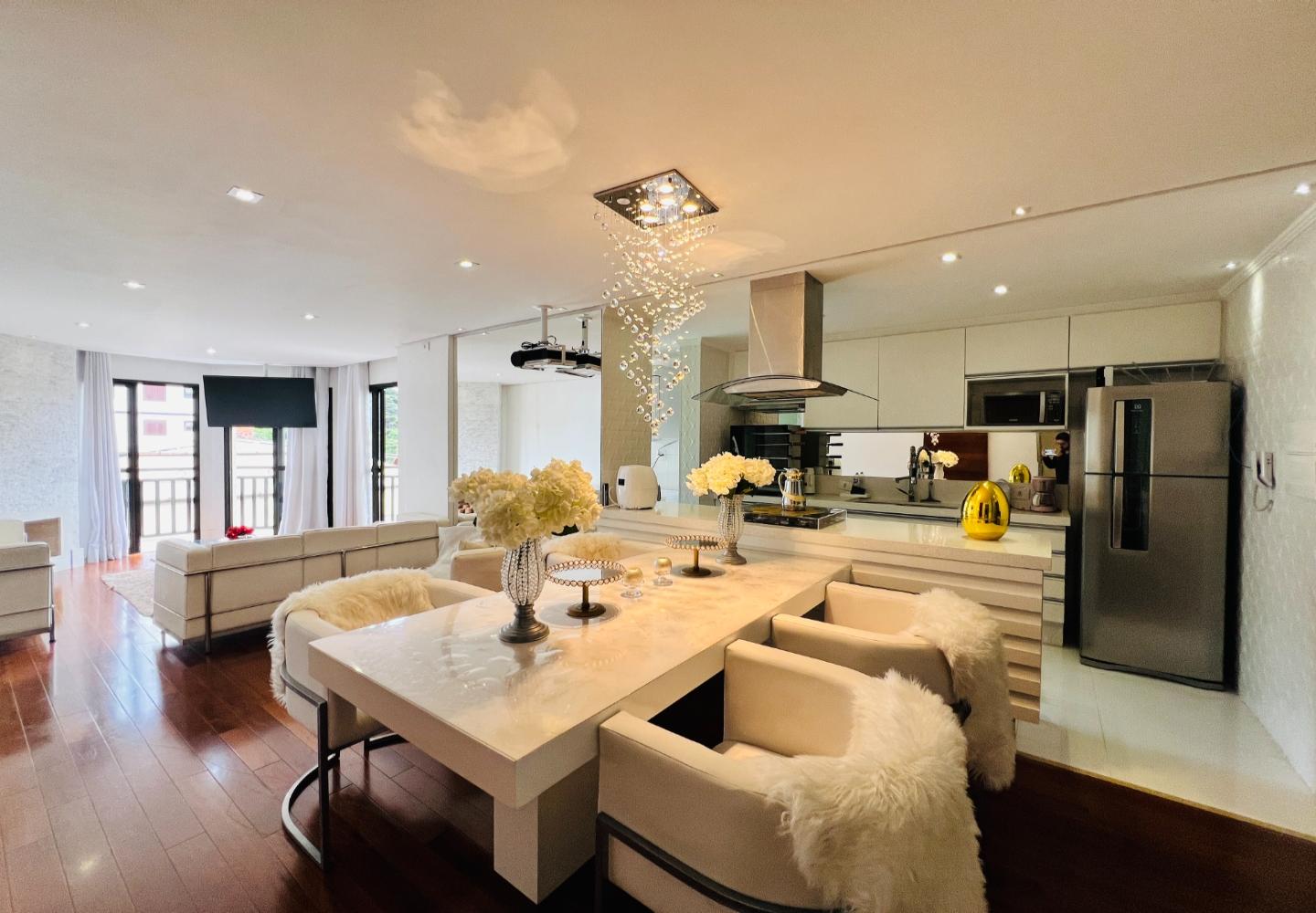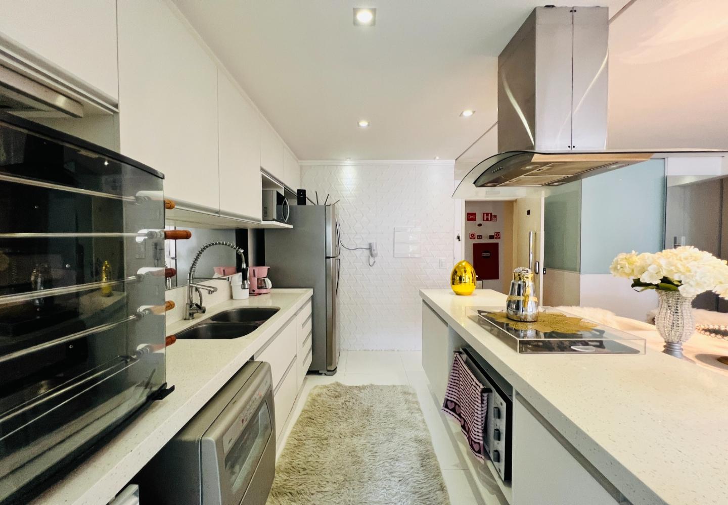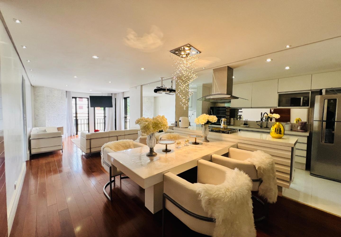 O imóvel será vendido mobiliado, com decoração em tons claros, iluminação embutida e detalhes que valorizam o conjunto, como o lustre em cristais sobre a bancada. São 3 dormitórios, sendo 1 suíte, todos com armários e boa ventilação, além de dois banheiros com acabamento em pedra e box em vidro.
