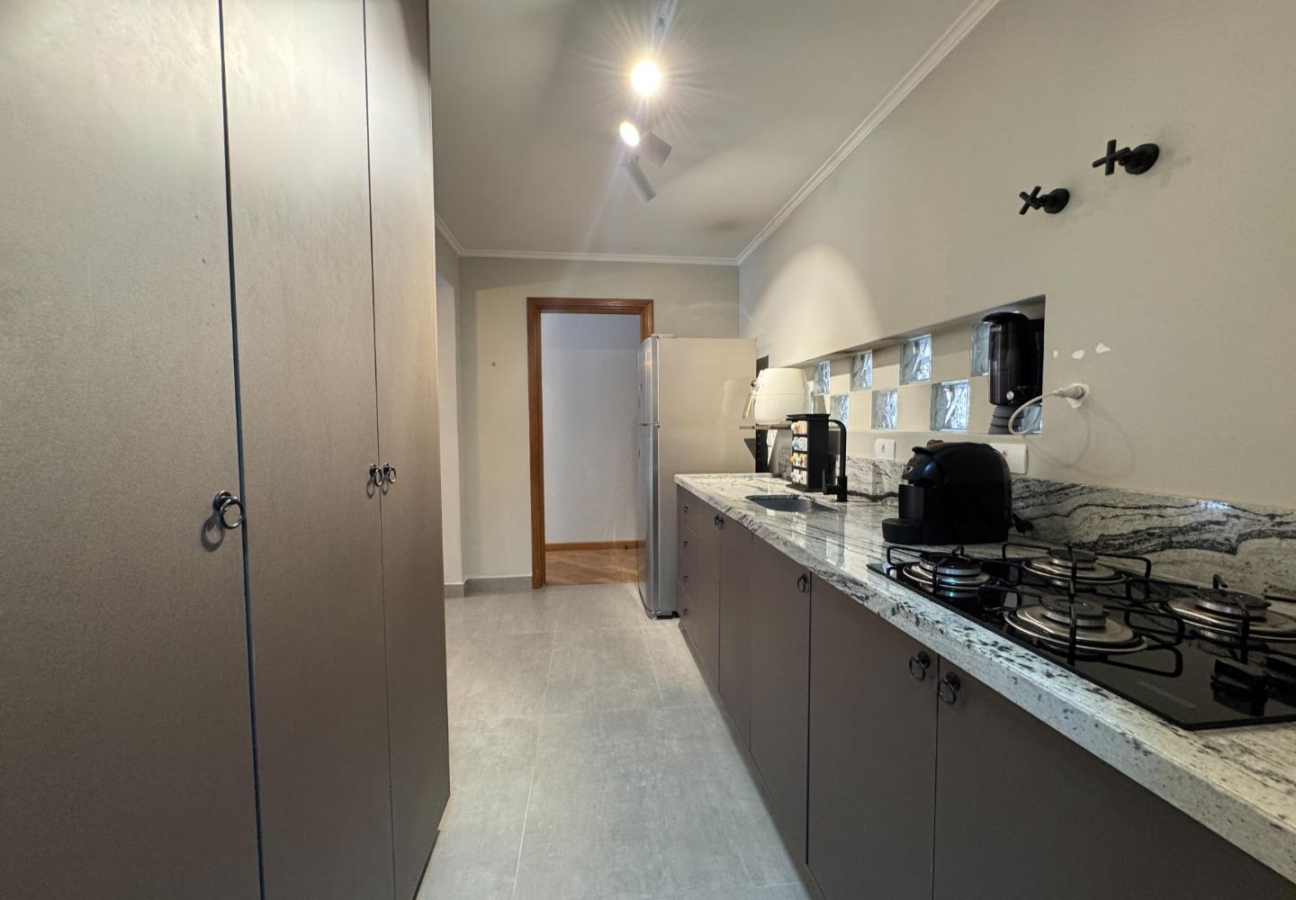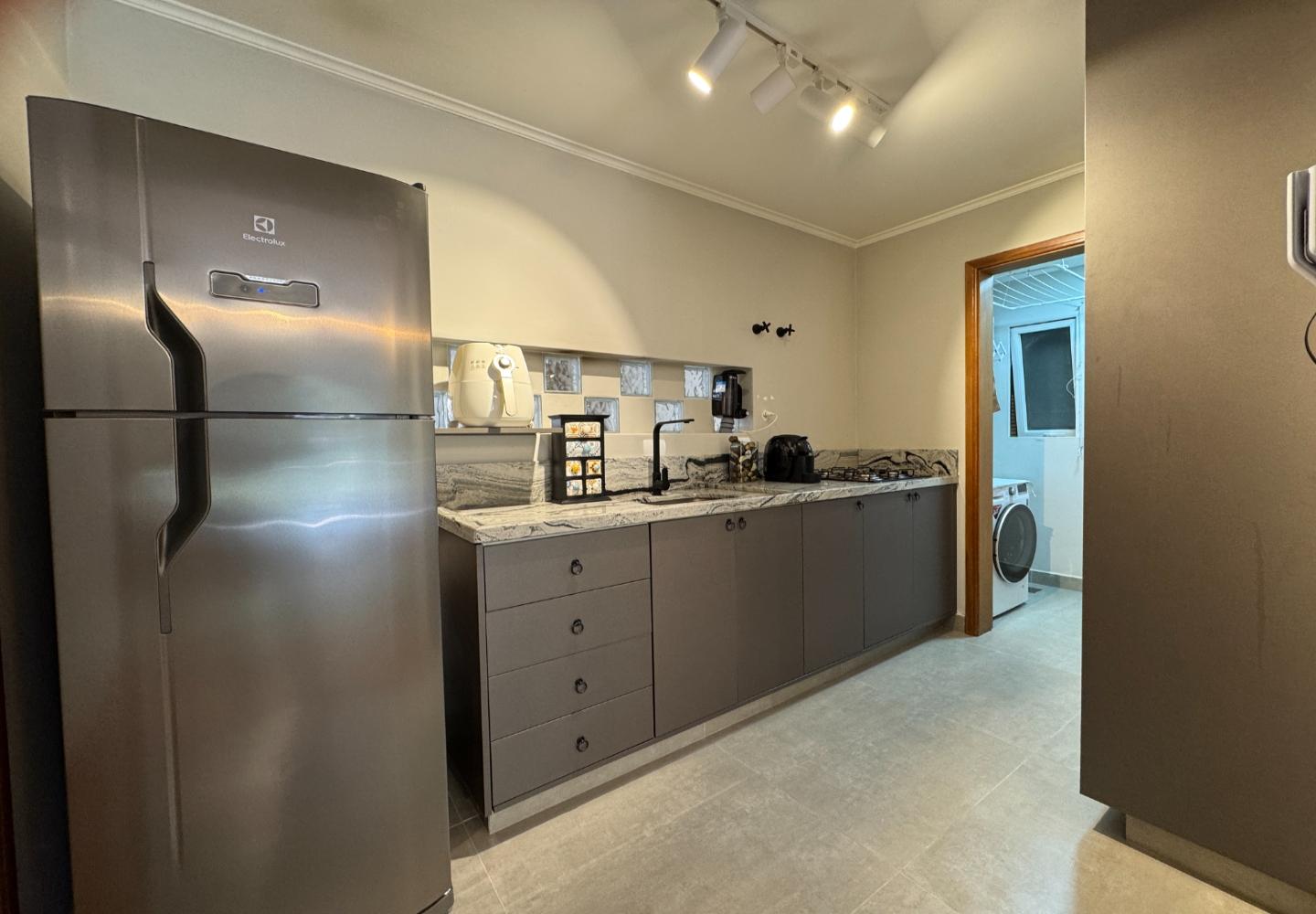 Este apartamento de 94 m² apresenta uma configuração funcional e muito confortável, com uma sala ampla integrada à varanda, iluminação natural abundante e lareira em destaque — um conjunto que valoriza o dia a dia e deixa o ambiente mais agradável em qualquer época do ano. A cozinha foi modernizada, trazendo linhas clean, planejados em tom cinza e bancada em pedra, com acesso direto à área de serviço. A área social tem um bom fluxo entre cozinha, sala de jantar e sala de estar, criando um espaço contínuo e fácil de aproveitar.