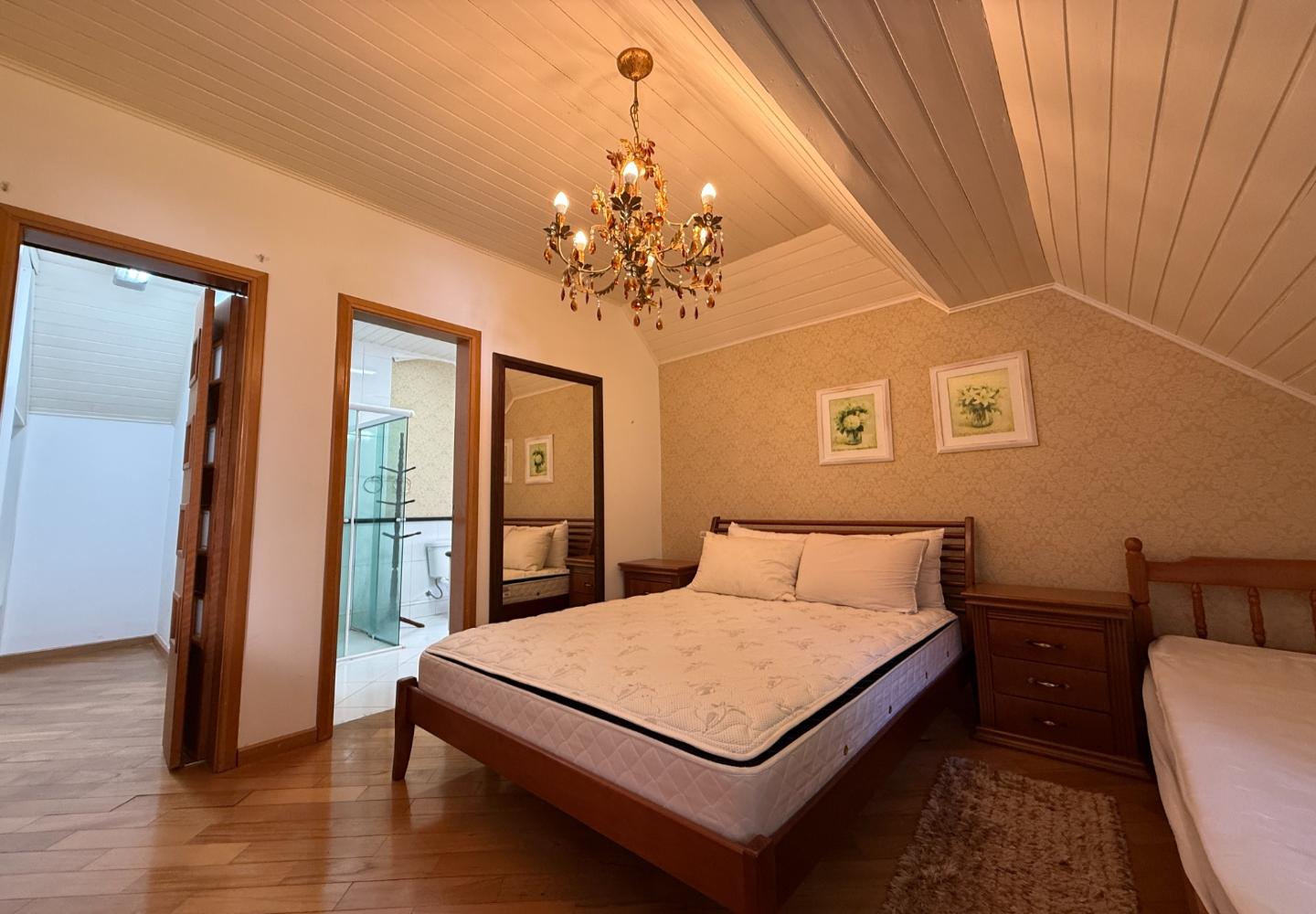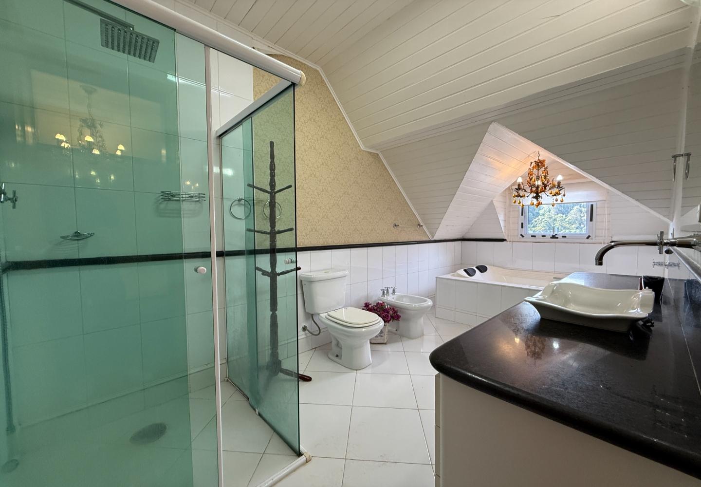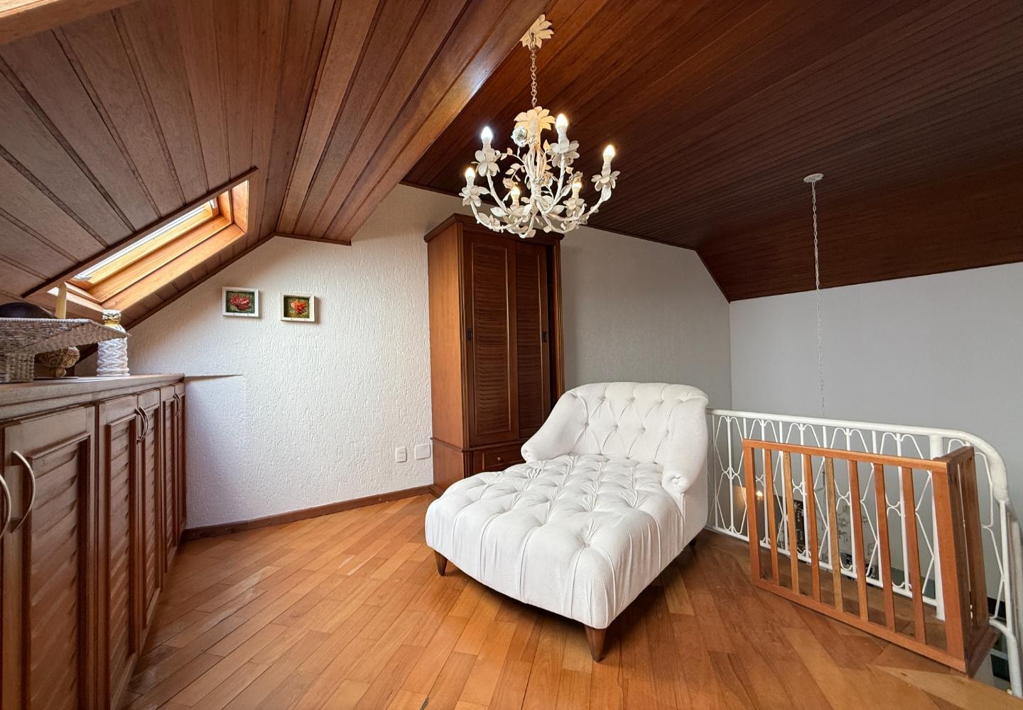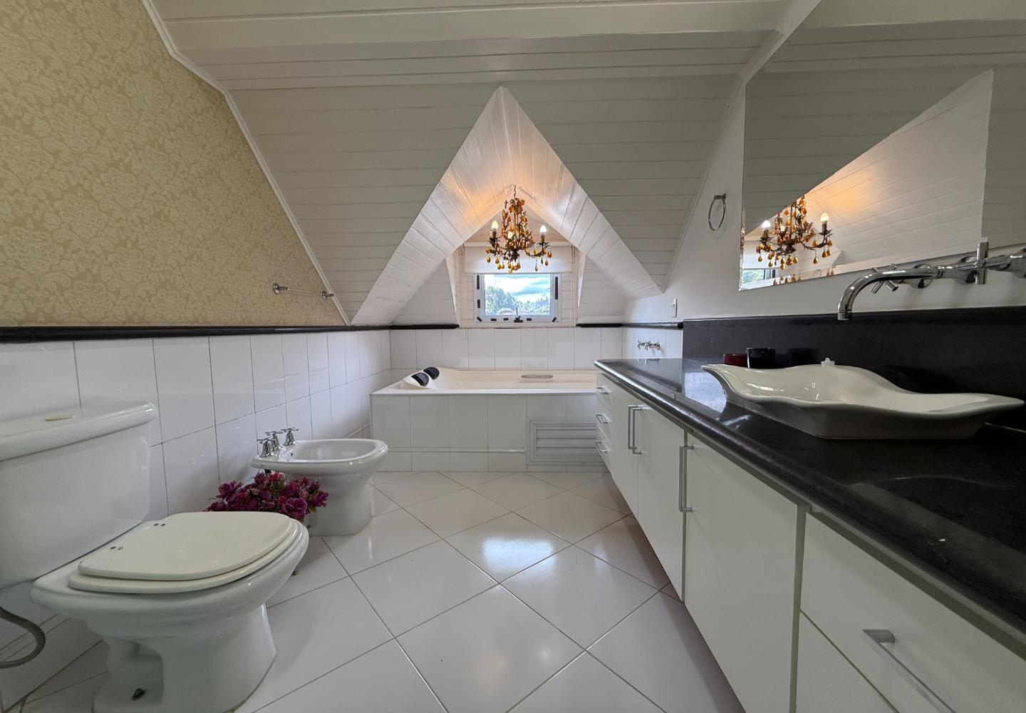 Na área íntima, são quatro dormitórios, sendo duas suítes. A suíte principal ocupa o pavimento superior e dispõe de banheiro amplo com banheira e iluminação natural, aproveitando o desenho inclinado da cobertura. O imóvel possui três banheiros no total e três vagas de garagem, inserido em um condomínio tradicional e bem consolidado.