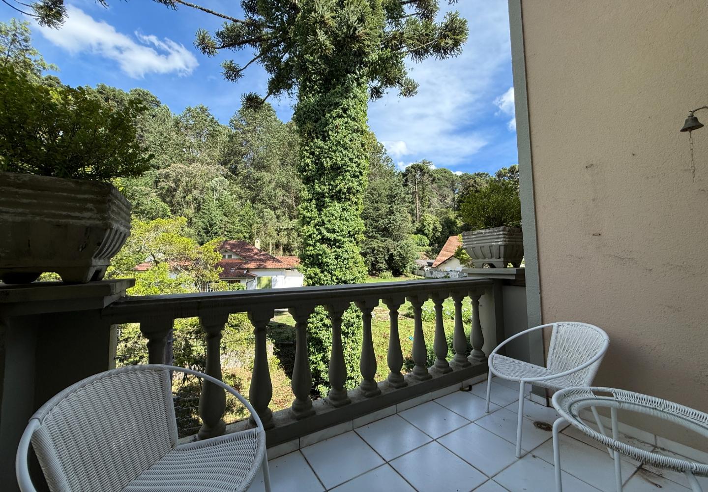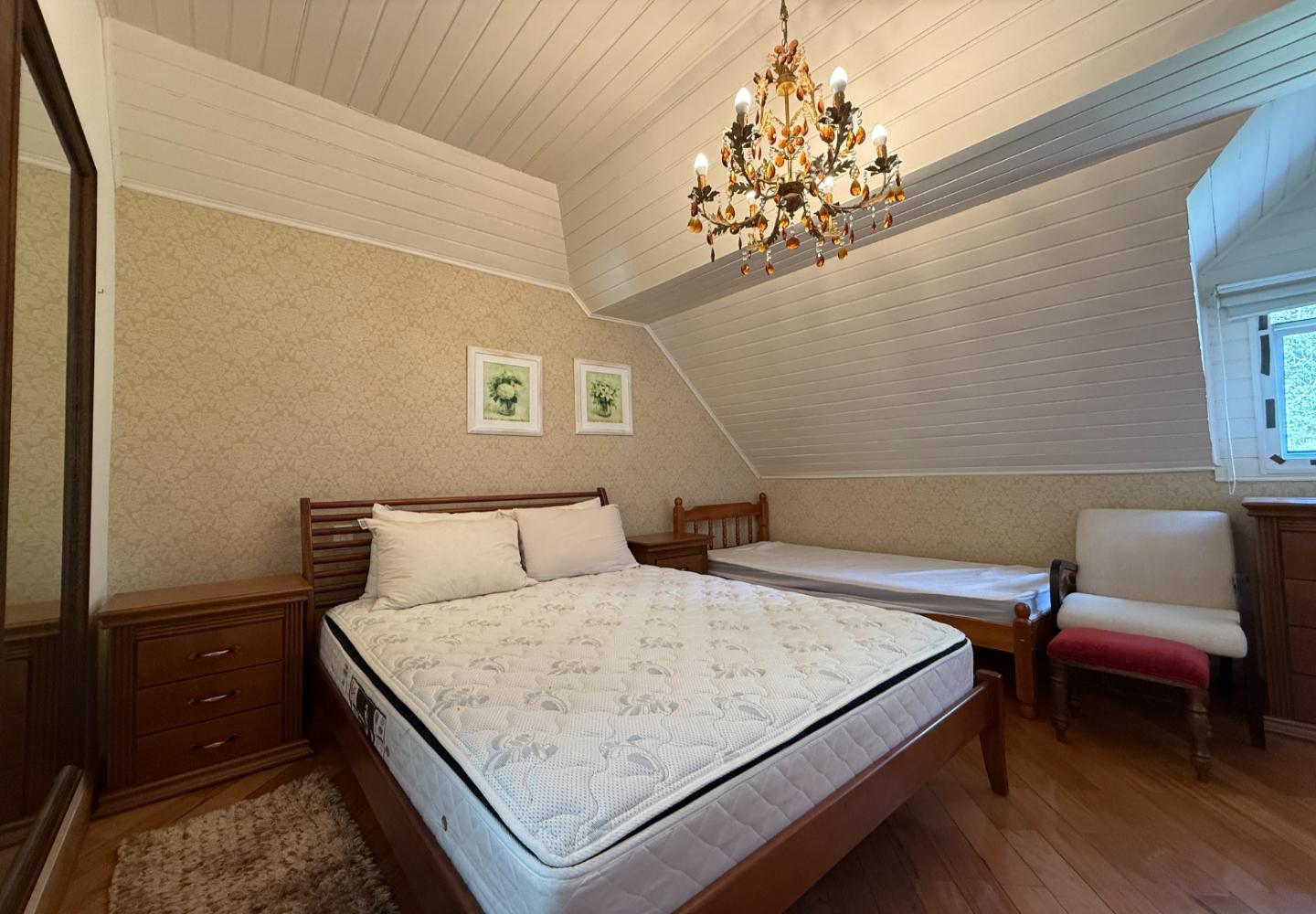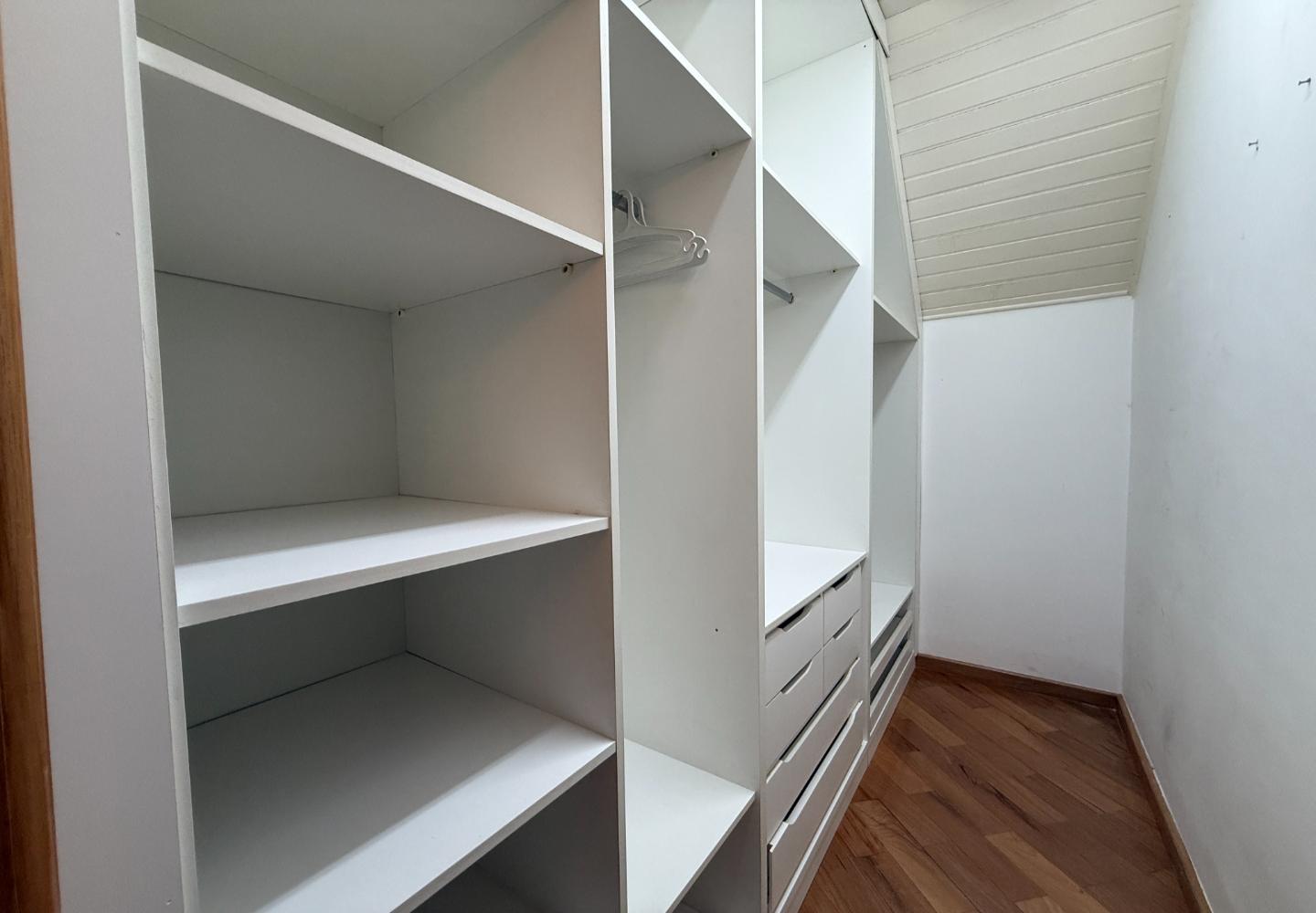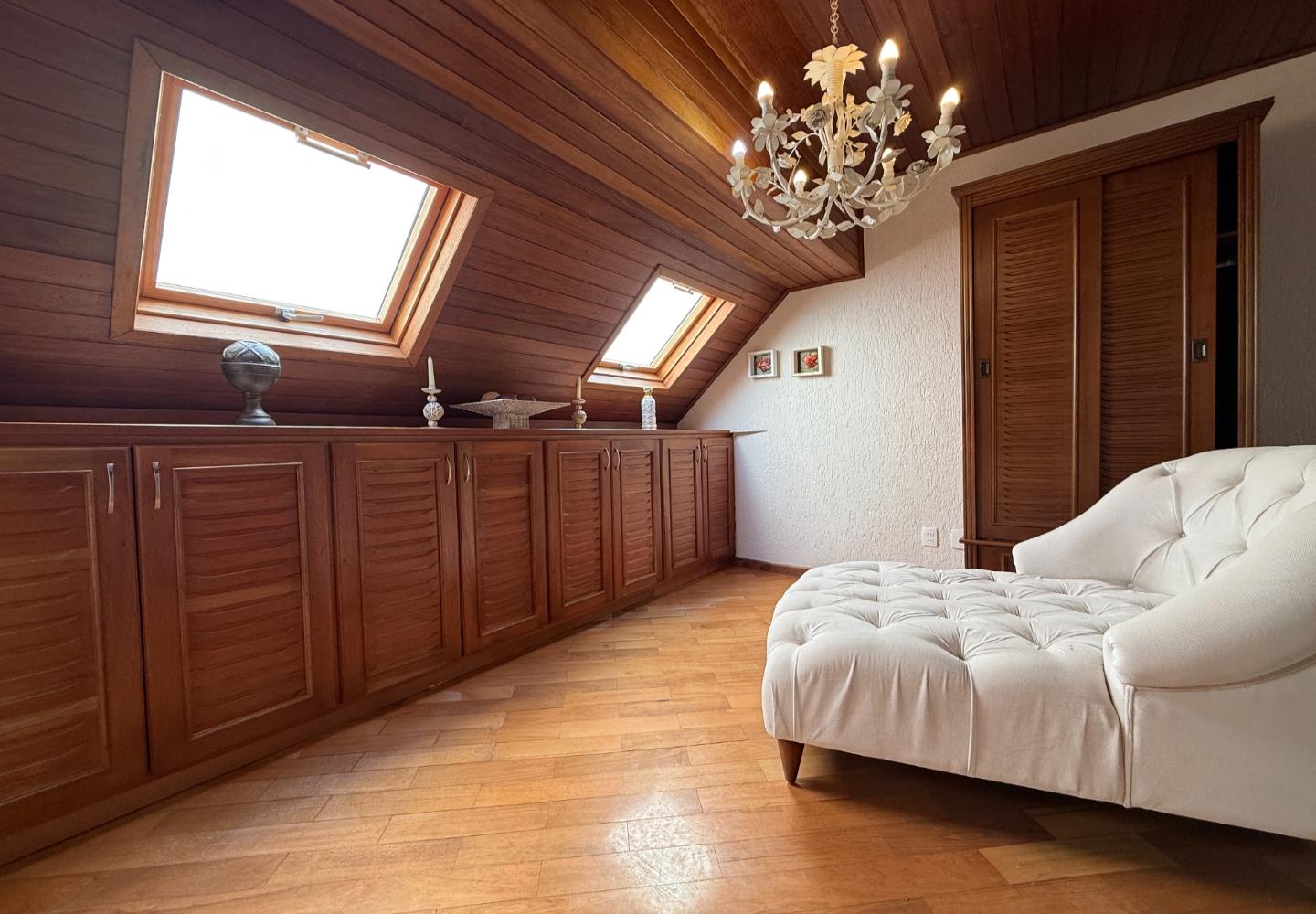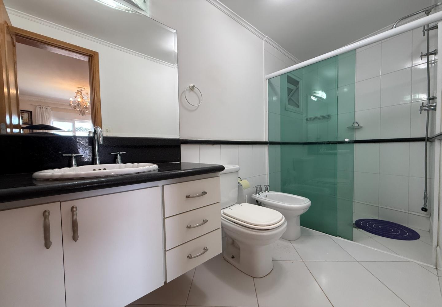 Na área íntima, são quatro dormitórios, sendo duas suítes. A suíte principal ocupa o pavimento superior e dispõe de banheiro amplo com banheira e iluminação natural, aproveitando o desenho inclinado da cobertura. O imóvel possui três banheiros no total e três vagas de garagem, inserido em um condomínio tradicional e bem consolidado.