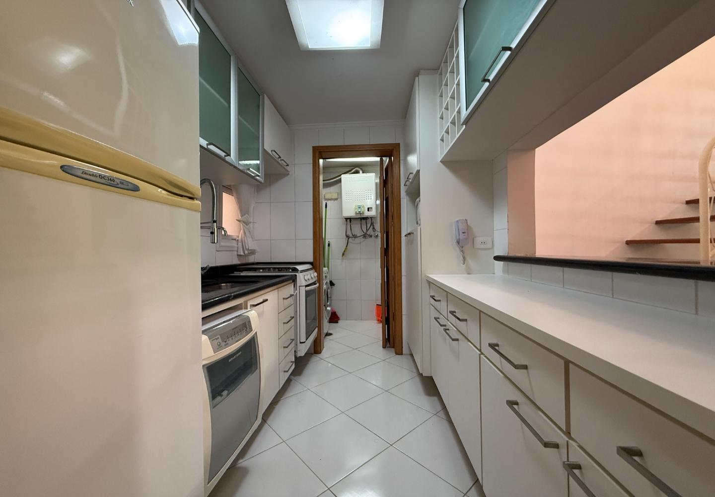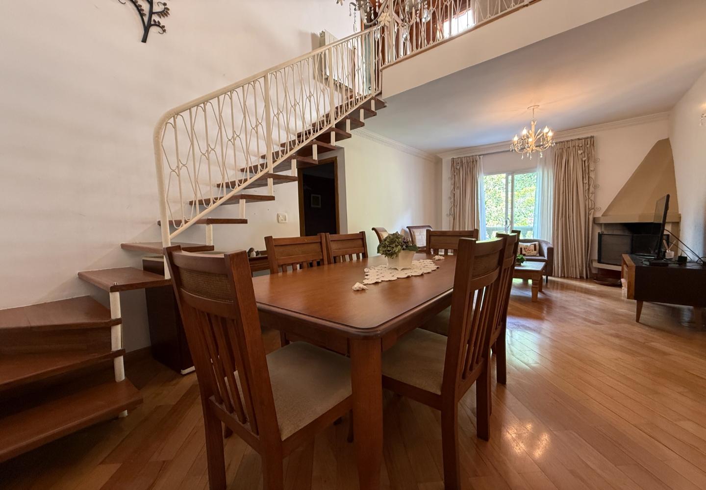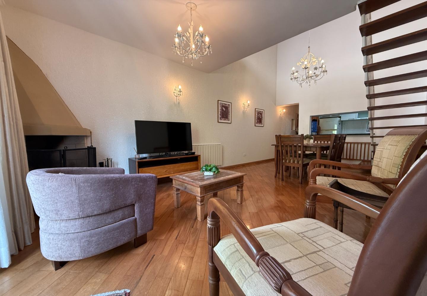 Cobertura duplex com 130 m² de área útil, distribuída de forma clara e funcional. O pavimento social conta com sala ampla, pé-direito elevado, lareira e integração com a varanda voltada para a área verde, garantindo boa iluminação natural e privacidade. A cozinha é independente, bem dimensionada e atende com eficiência à rotina do imóvel.