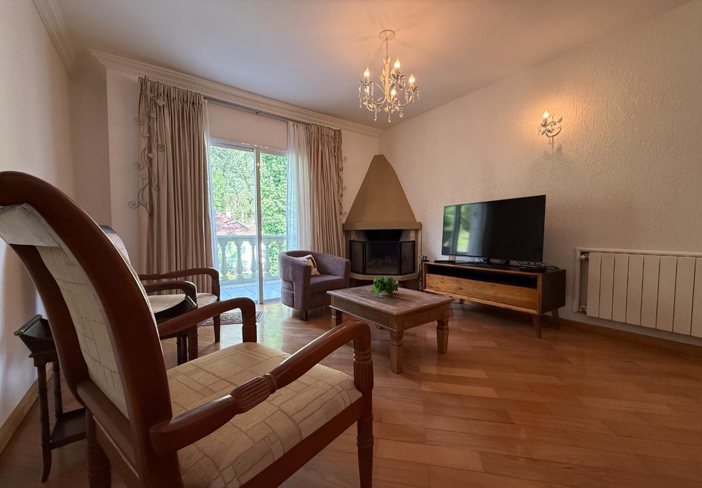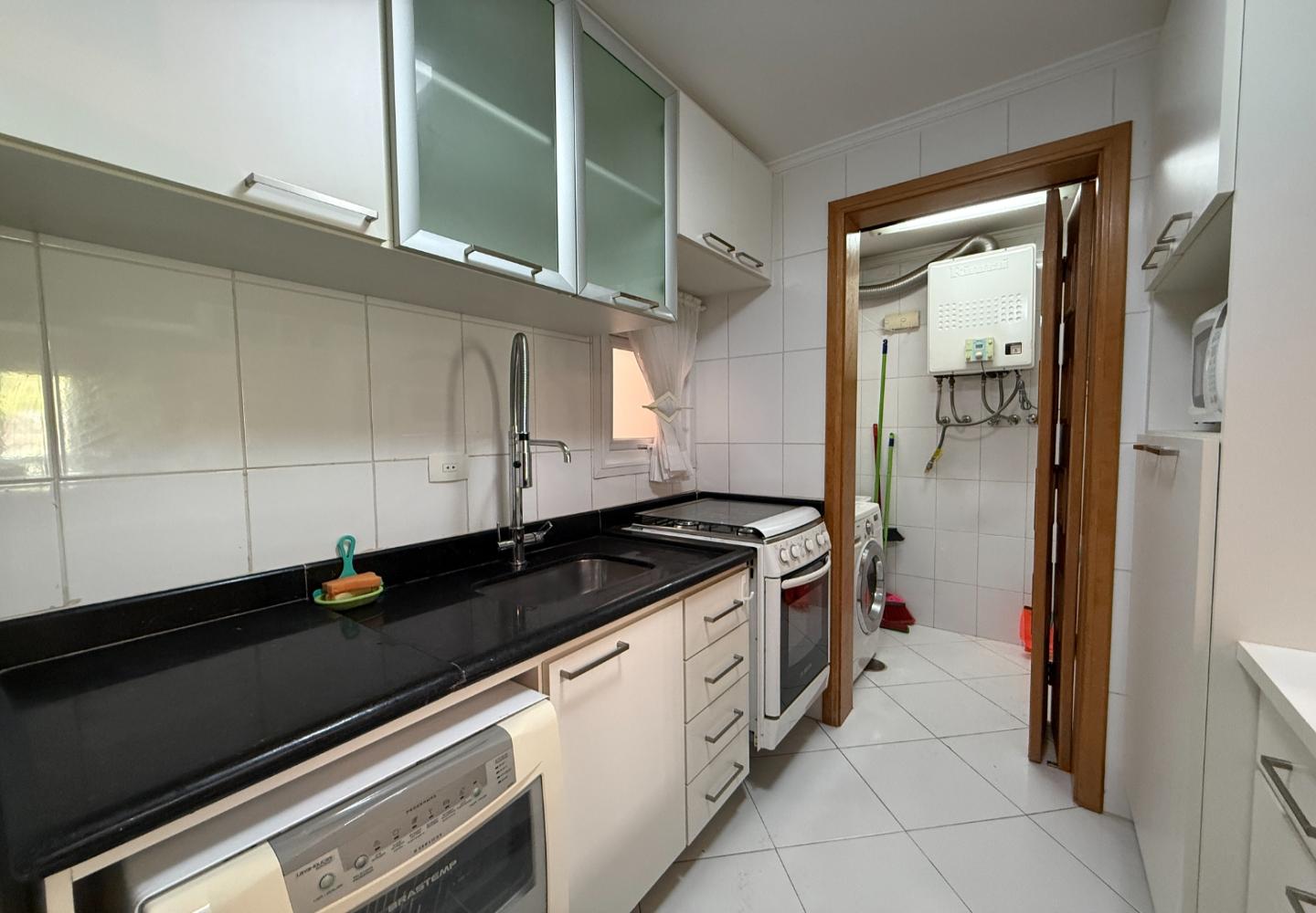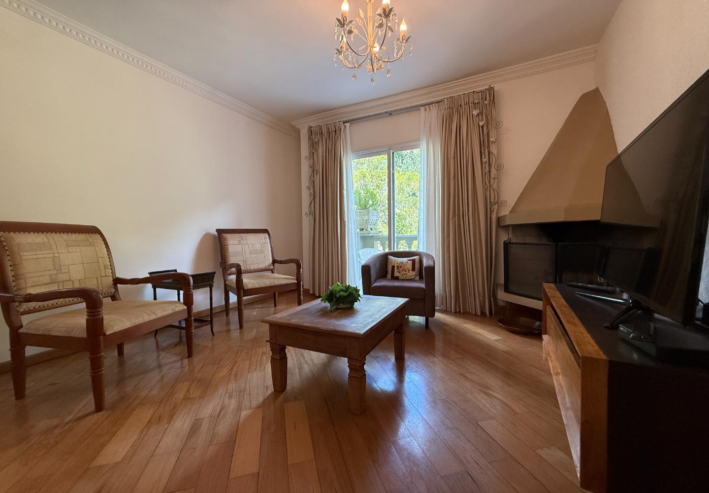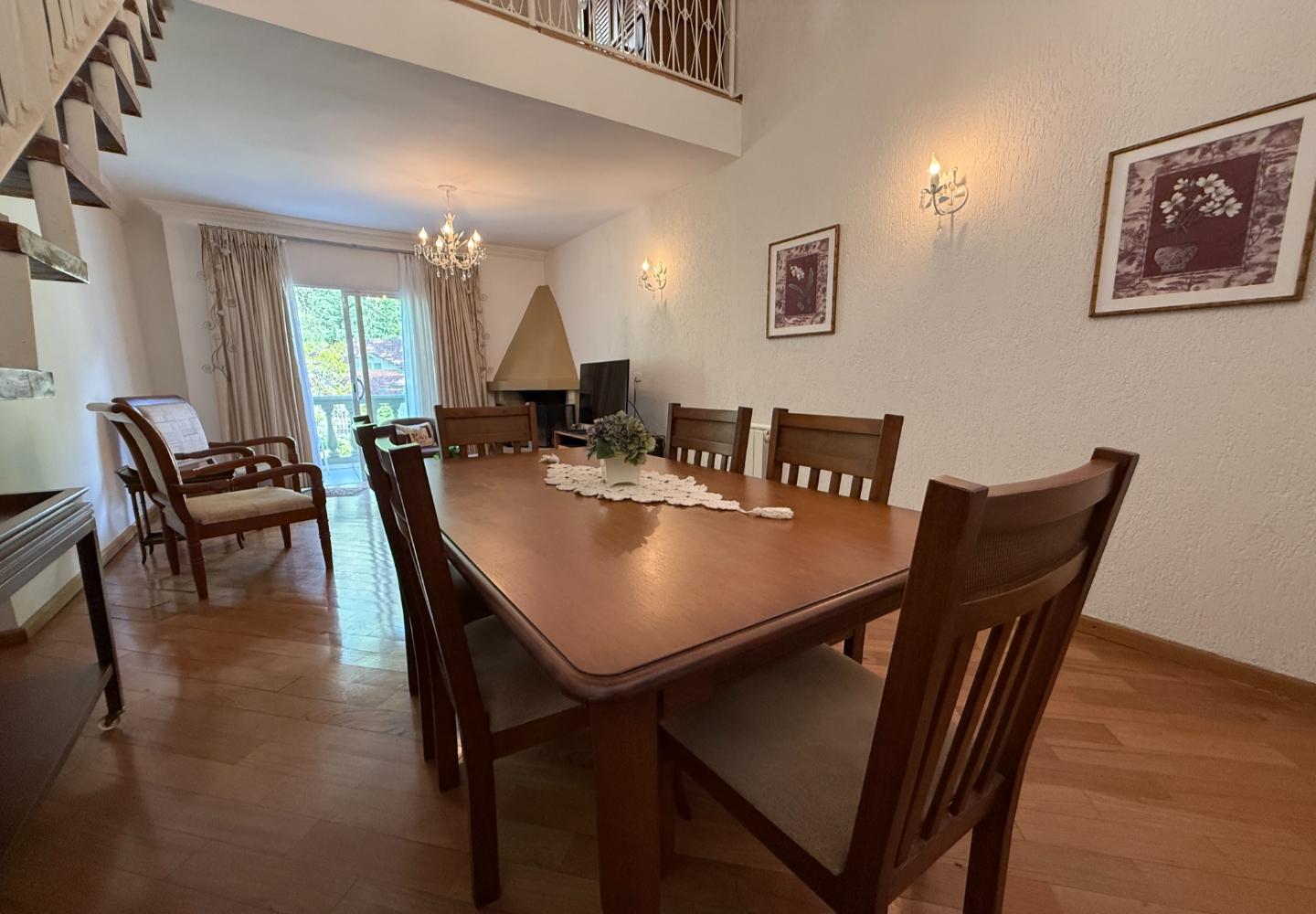 Cobertura duplex com 130 m² de área útil, distribuída de forma clara e funcional. O pavimento social conta com sala ampla, pé-direito elevado, lareira e integração com a varanda voltada para a área verde, garantindo boa iluminação natural e privacidade. A cozinha é independente, bem dimensionada e atende com eficiência à rotina do imóvel.