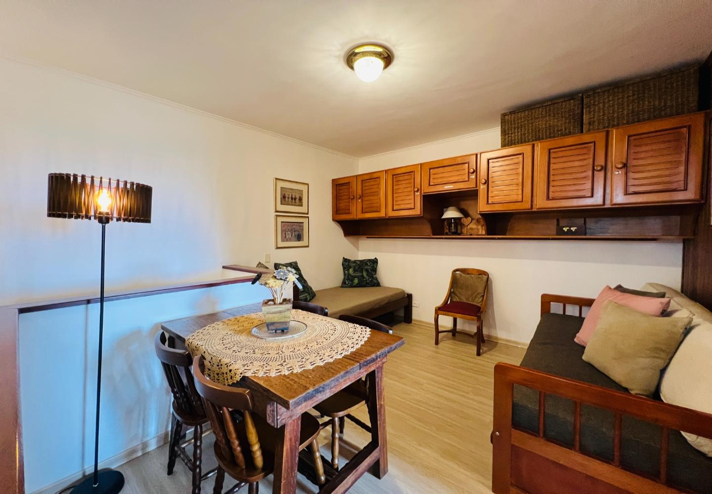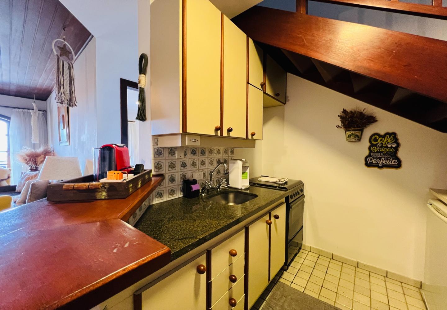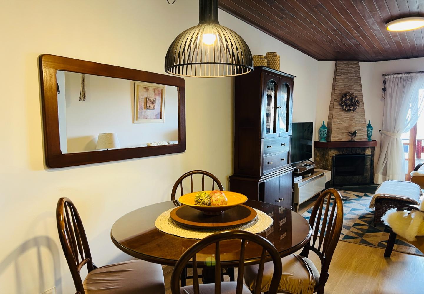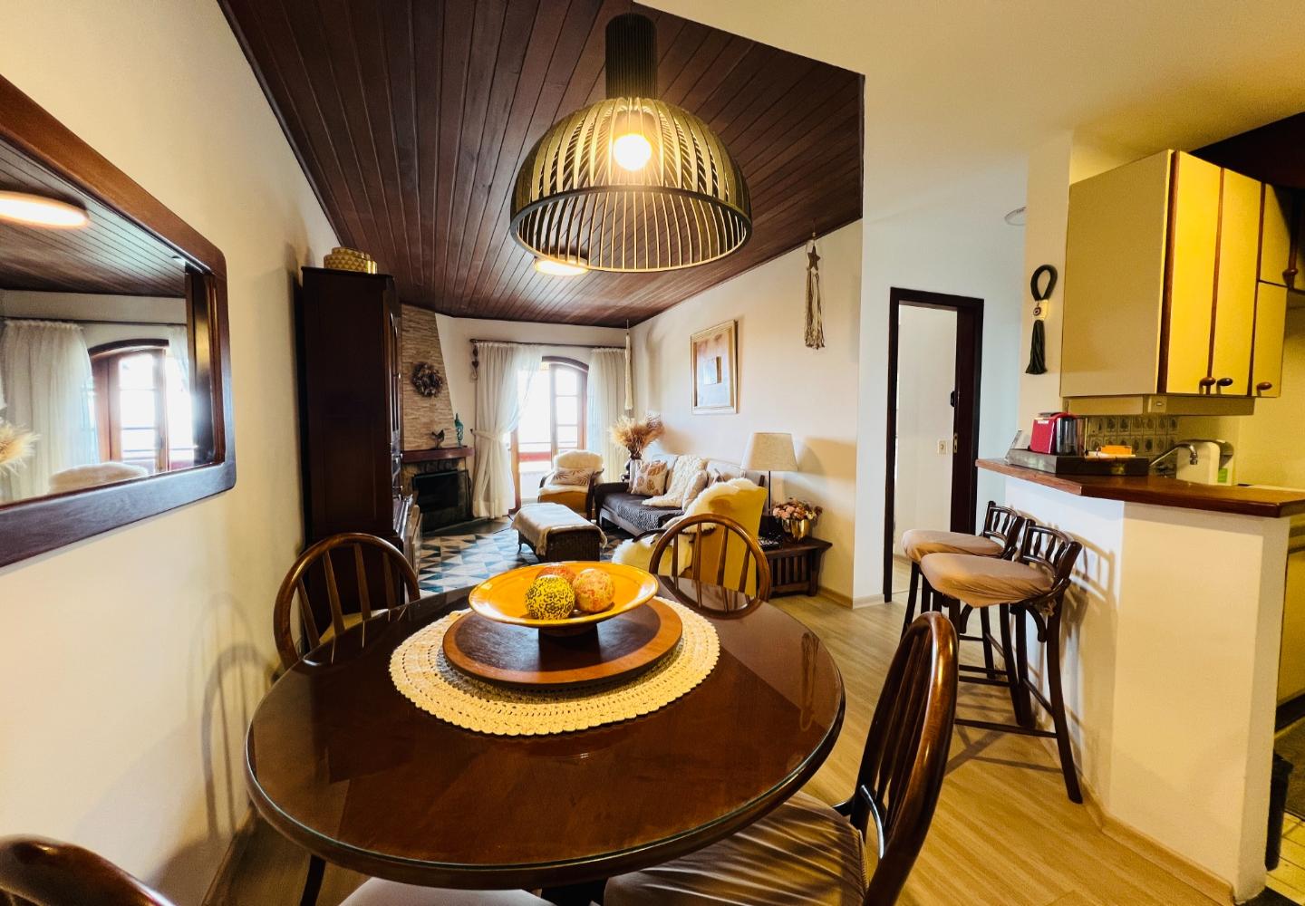 Este duplex de 115 m² no Quatre Saisons apresenta uma distribuição funcional e bem integrada entre os dois pavimentos. No piso térreo, a sala recebe boa iluminação natural e se conecta à varanda, enquanto a lareira compõe o espaço de estar ao lado da cozinha americana, que foi organizada para oferecer praticidade no dia a dia. Ainda no térreo, há um dormitório e um banheiro.