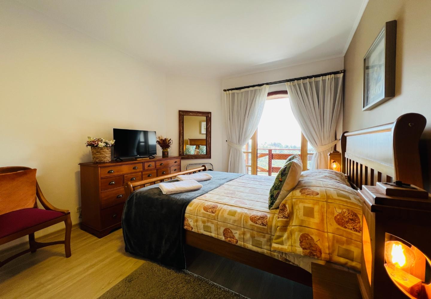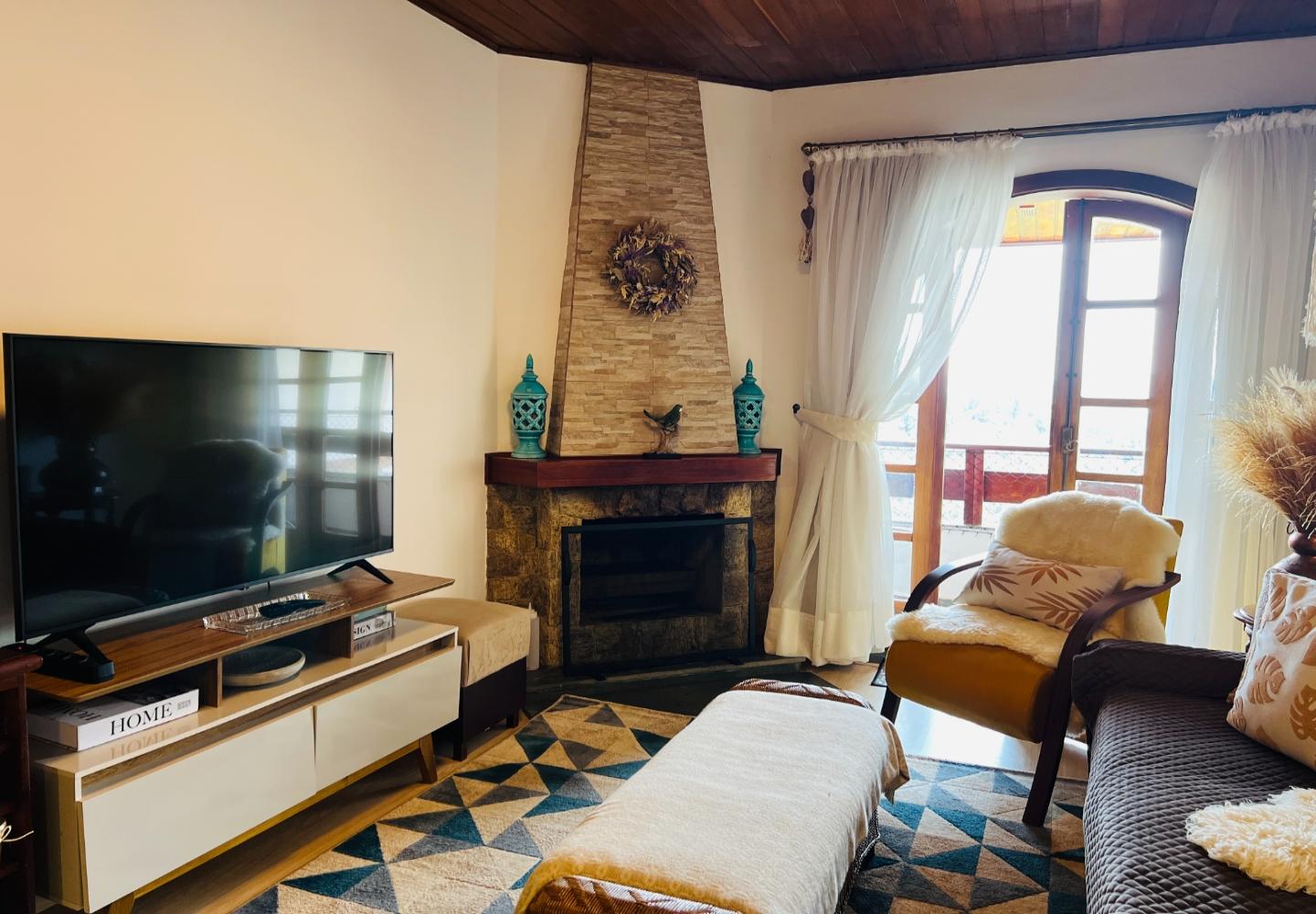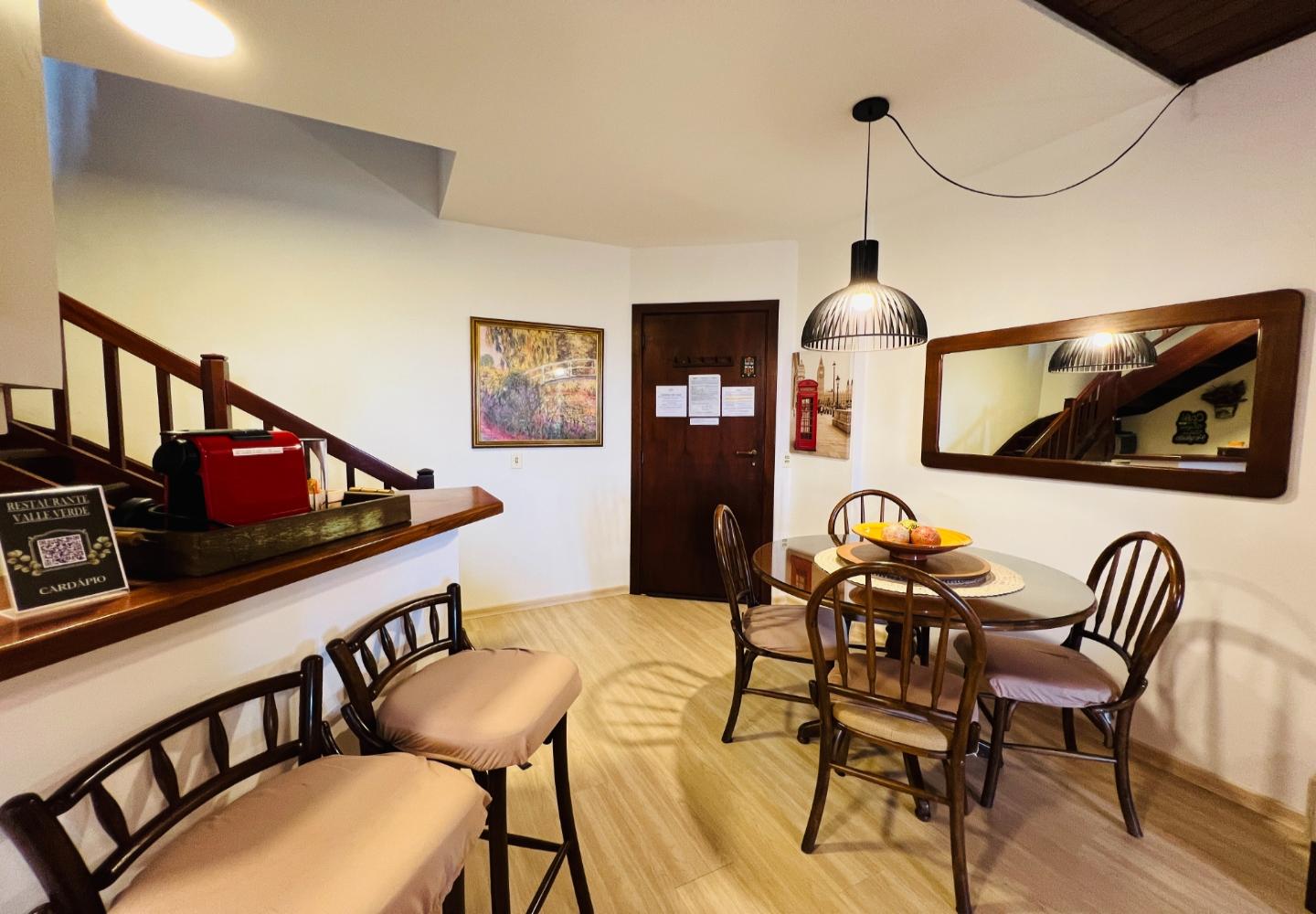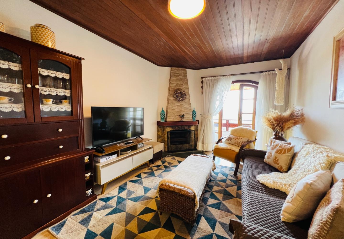 Este duplex de 115 m² no Quatre Saisons apresenta uma distribuição funcional e bem integrada entre os dois pavimentos. No piso térreo, a sala recebe boa iluminação natural e se conecta à varanda, enquanto a lareira compõe o espaço de estar ao lado da cozinha americana, que foi organizada para oferecer praticidade no dia a dia. Ainda no térreo, há um dormitório e um banheiro.