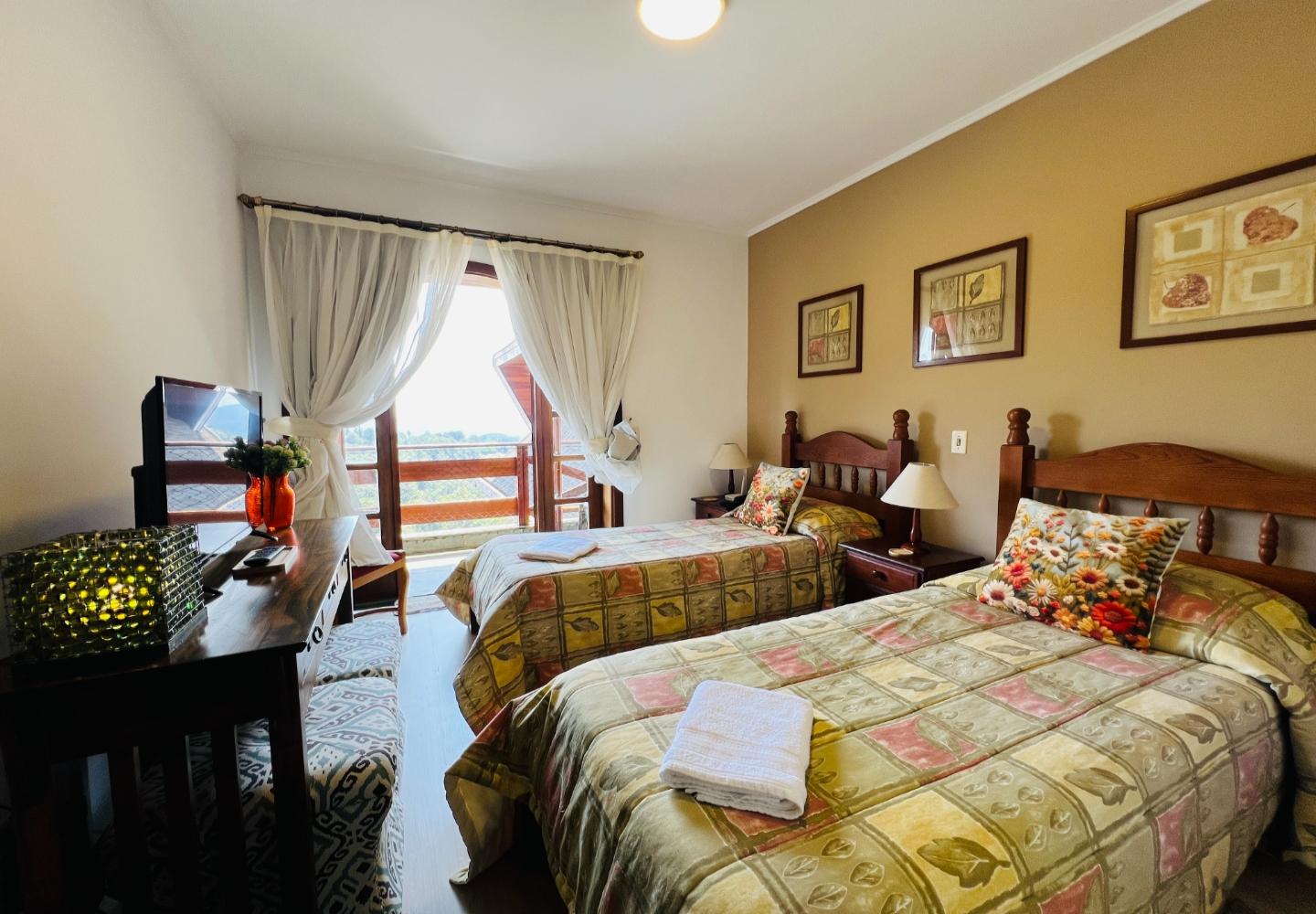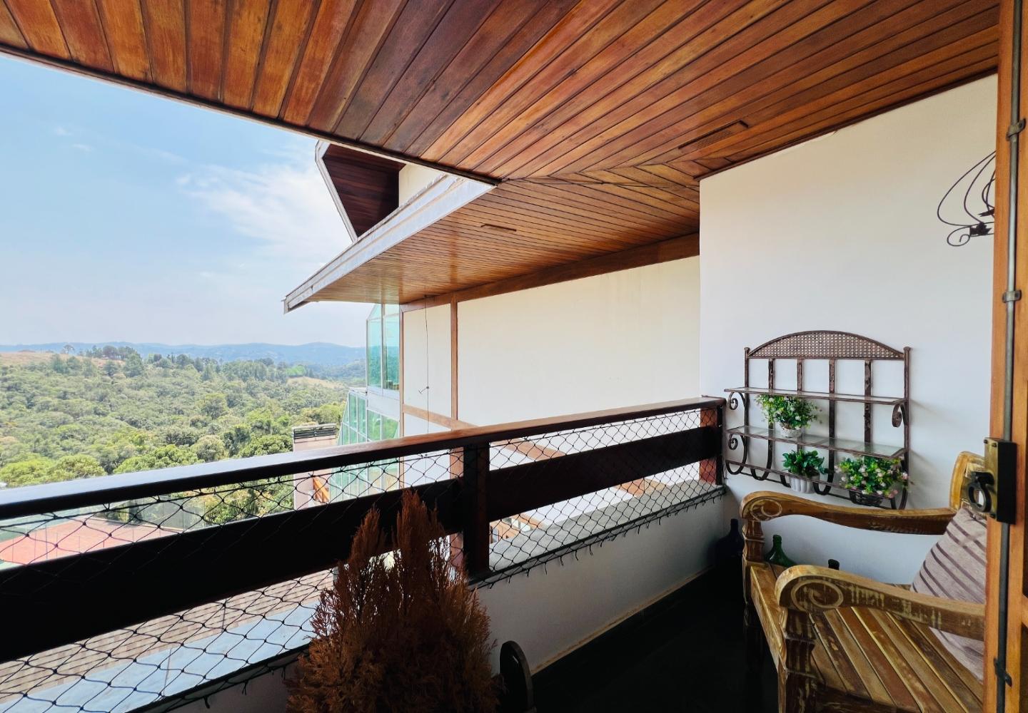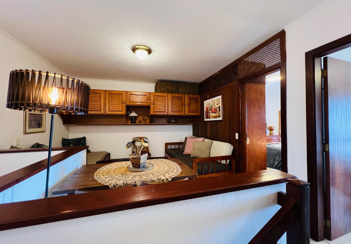 No andar superior, a segunda sala funciona como área de TV e convivência, acompanhada por dois dormitórios e mais um banheiro. Os ambientes são confortáveis, com móveis em madeira e bom aproveitamento do espaço, mantendo um padrão coerente em todo o apartamento.