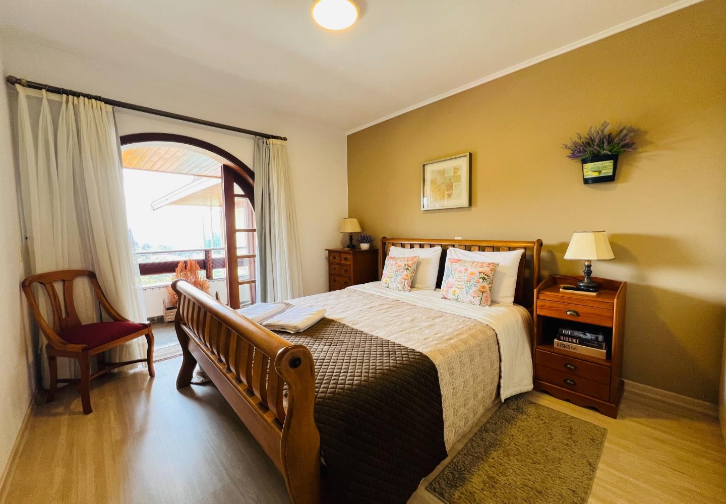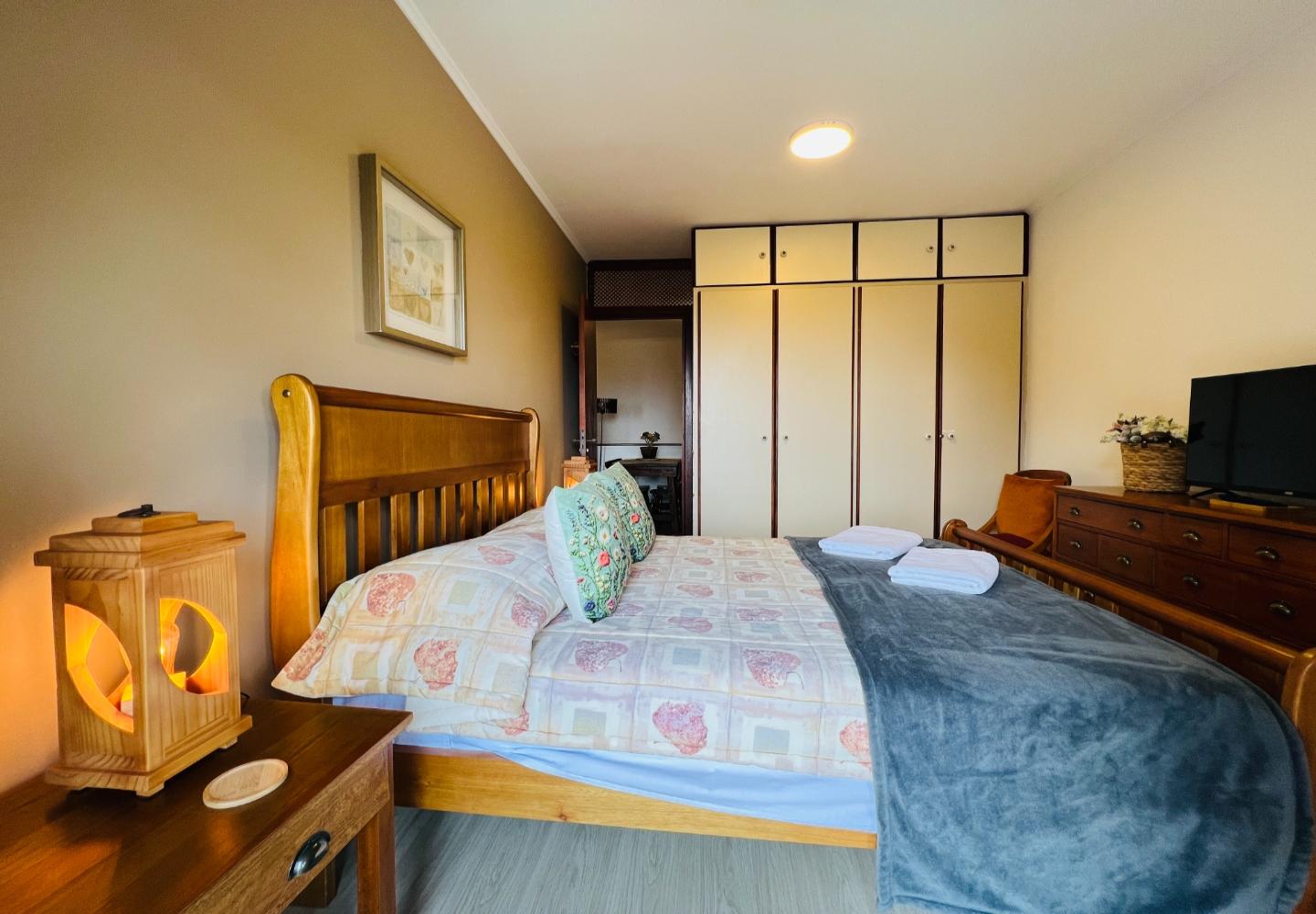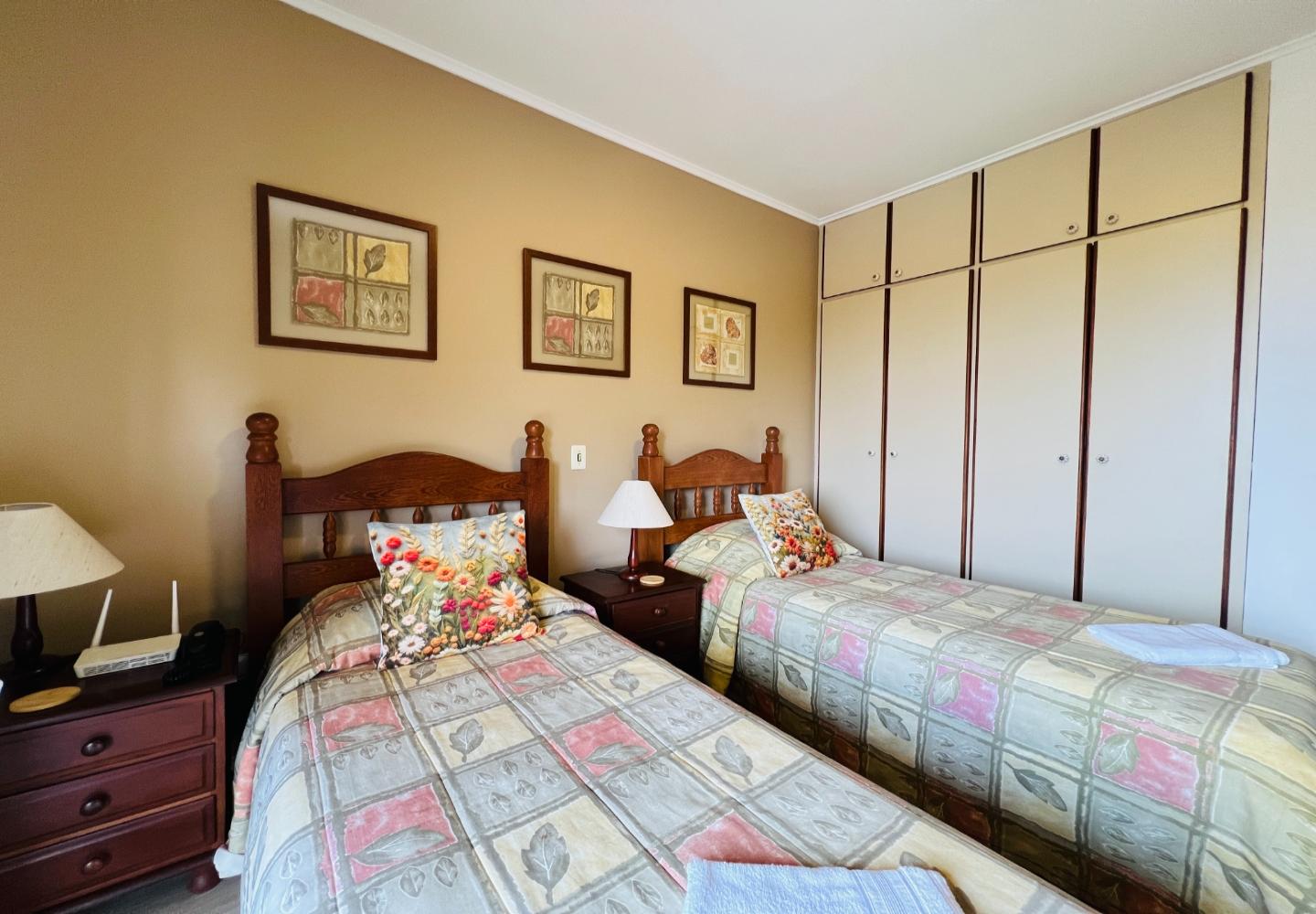 No andar superior, a segunda sala funciona como área de TV e convivência, acompanhada por dois dormitórios e mais um banheiro. Os ambientes são confortáveis, com móveis em madeira e bom aproveitamento do espaço, mantendo um padrão coerente em todo o apartamento.