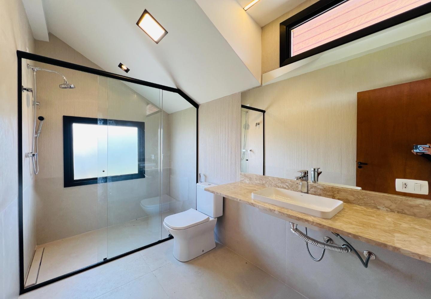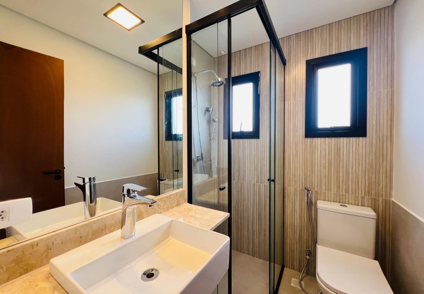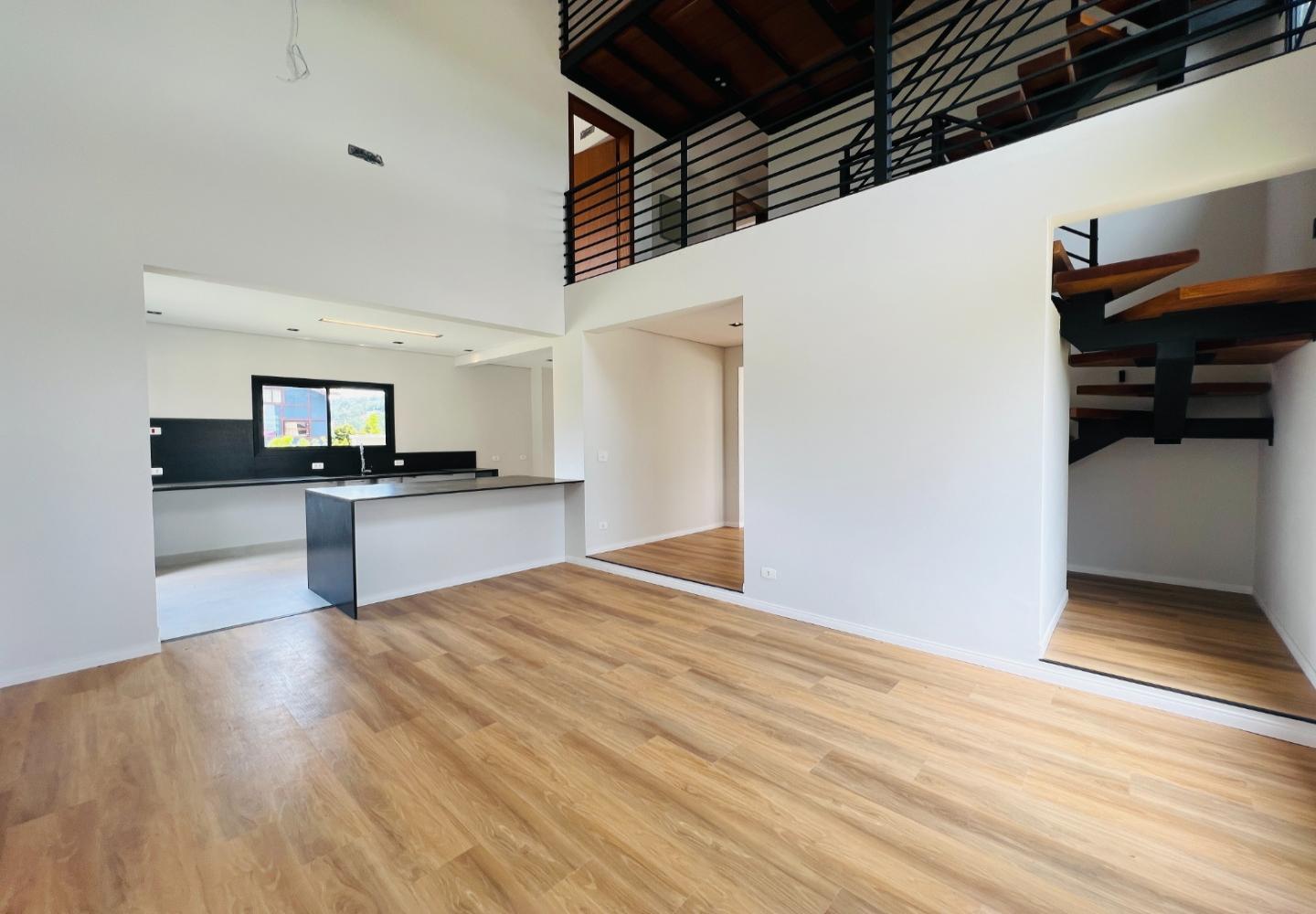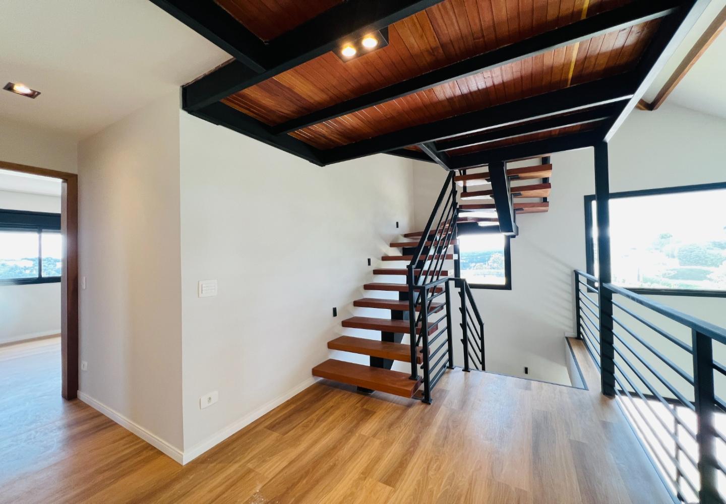 A escada metálica com degraus em madeira conecta os ambientes e reforça a identidade arquitetônica do projeto. A cozinha possui bancada em pedra escura e área envidraçada voltada para o jardim. Os banheiros têm acabamento atual, com box em vidro e revestimentos neutros.