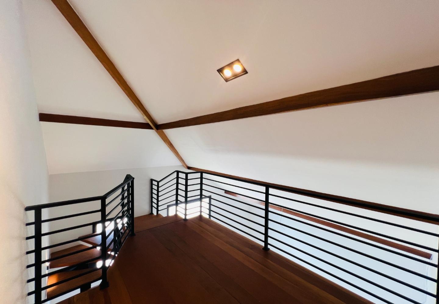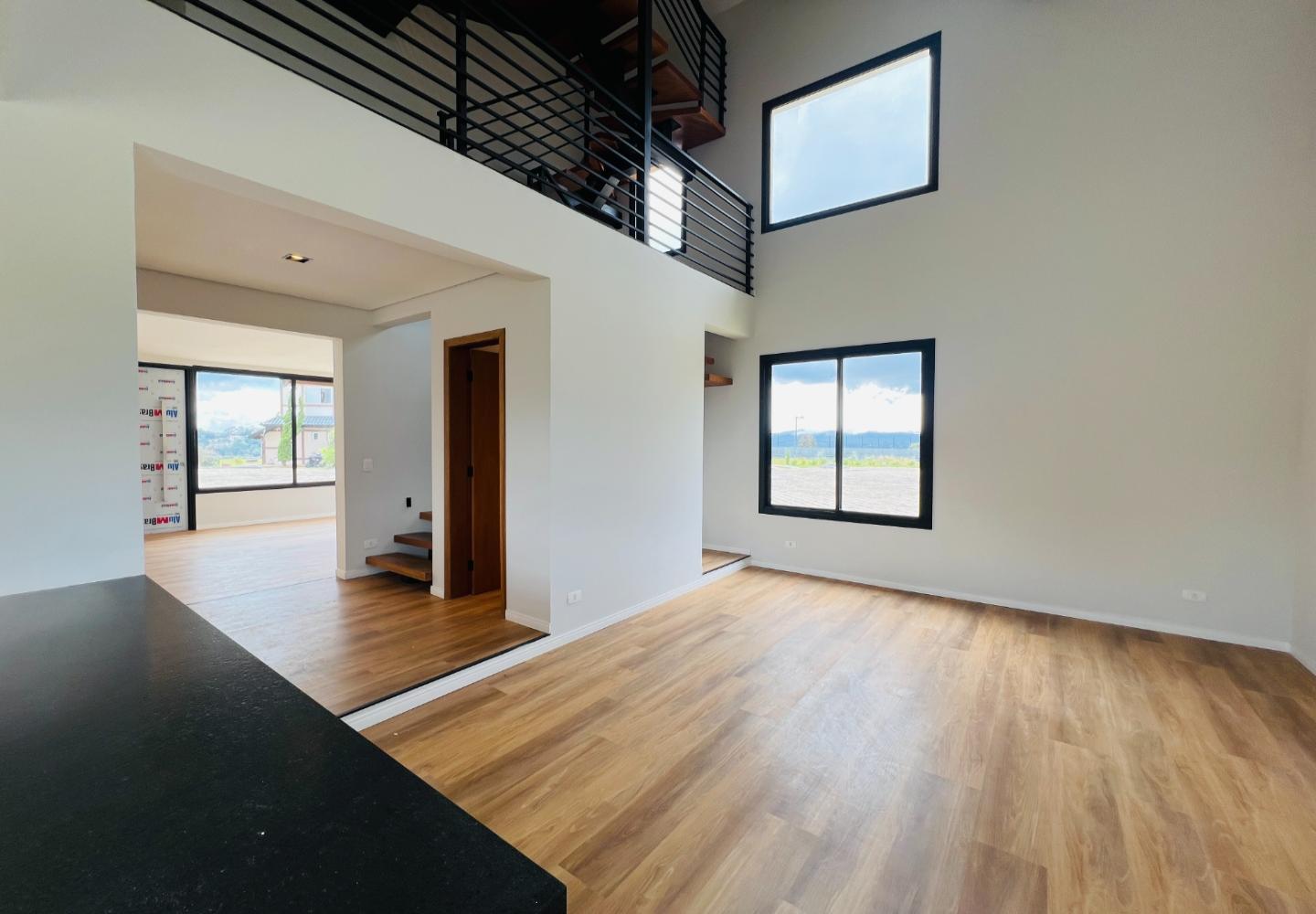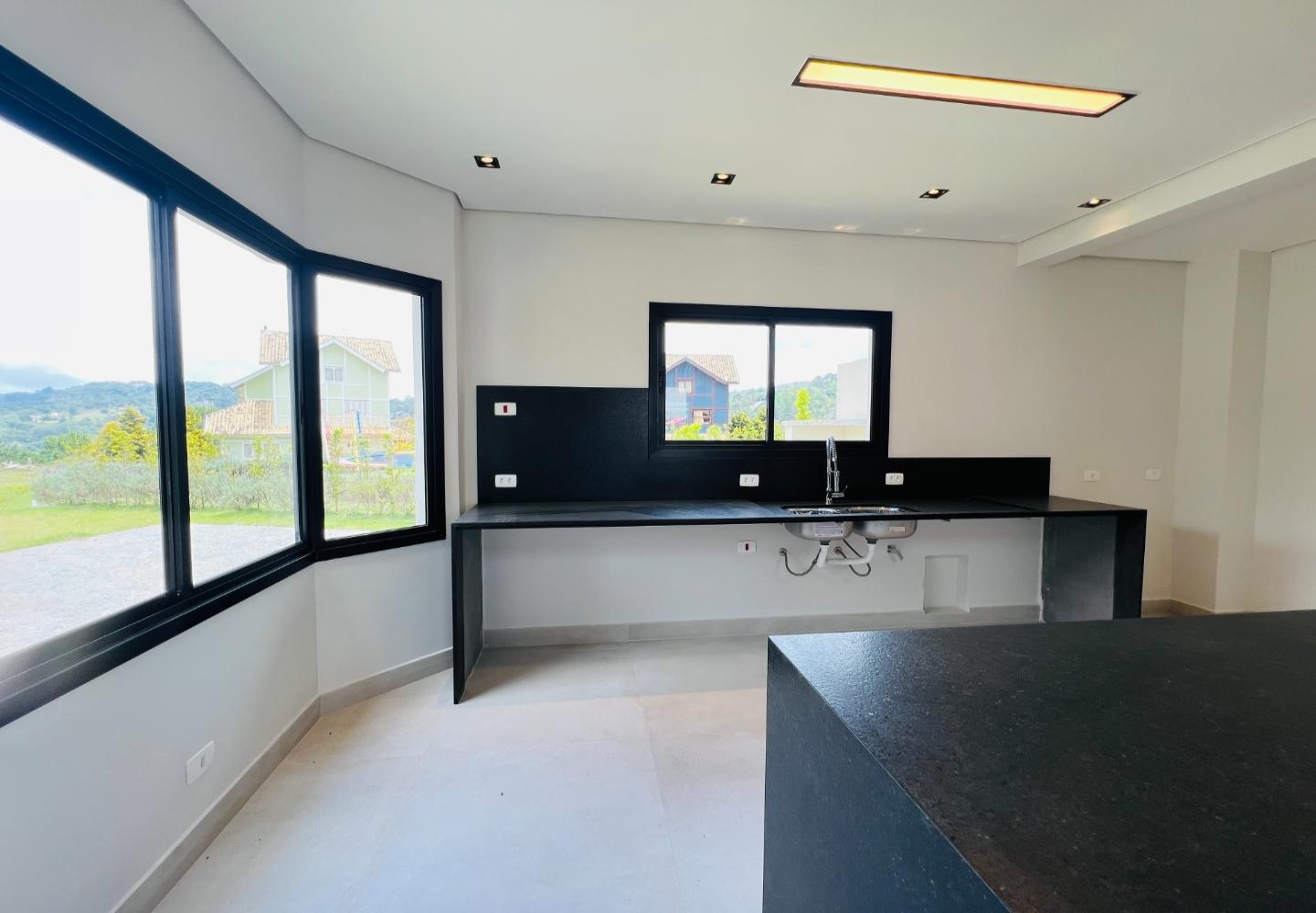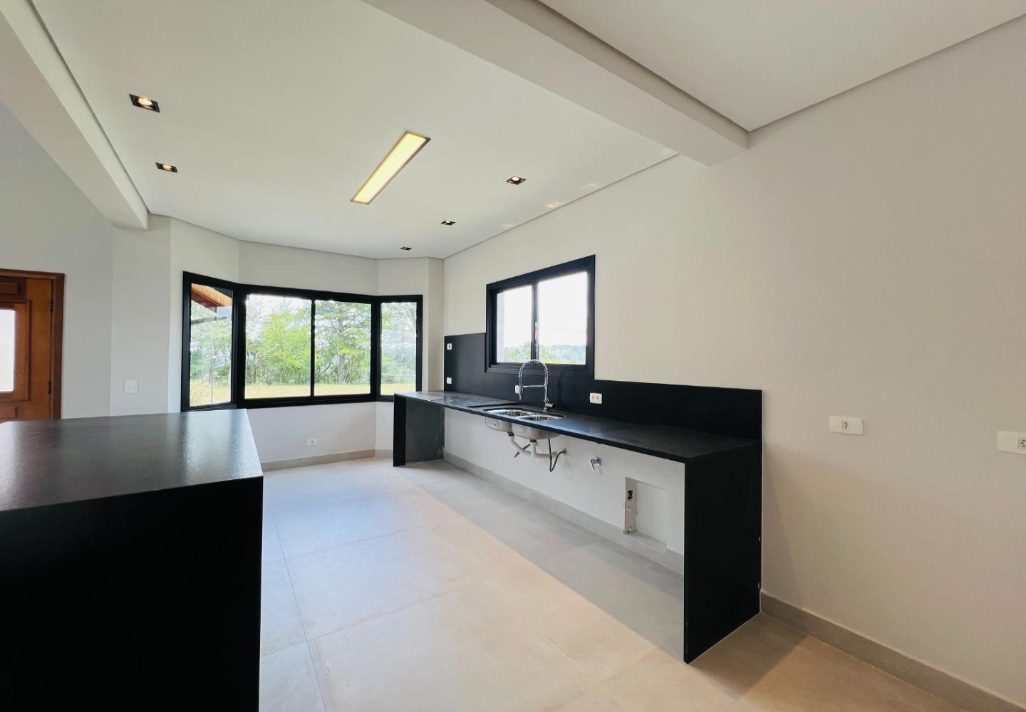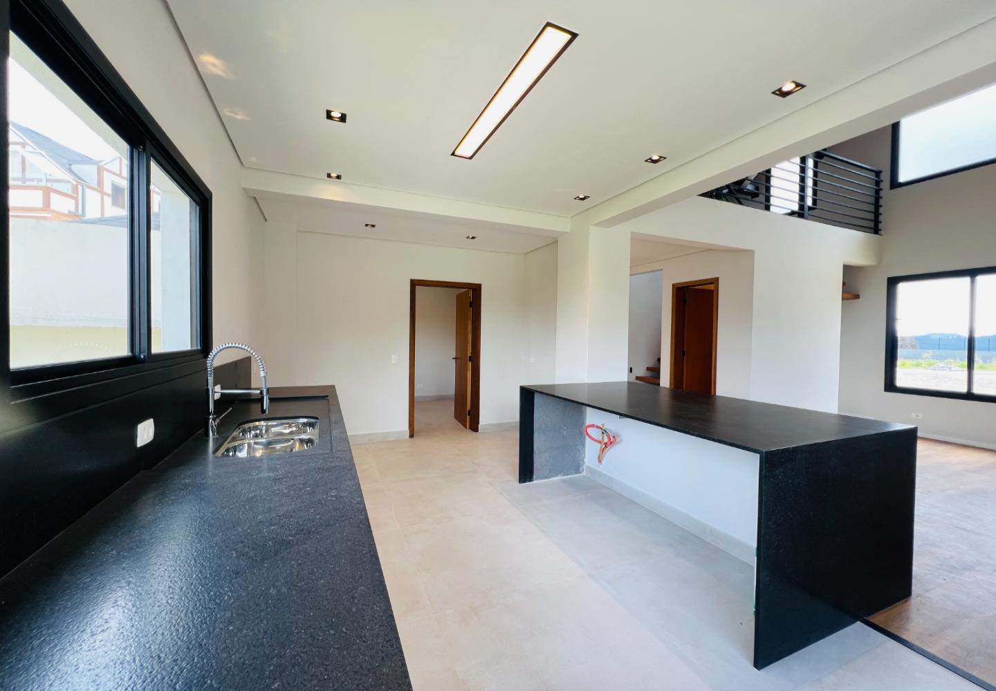 A escada metálica com degraus em madeira conecta os ambientes e reforça a identidade arquitetônica do projeto. A cozinha possui bancada em pedra escura e área envidraçada voltada para o jardim. Os banheiros têm acabamento atual, com box em vidro e revestimentos neutros.