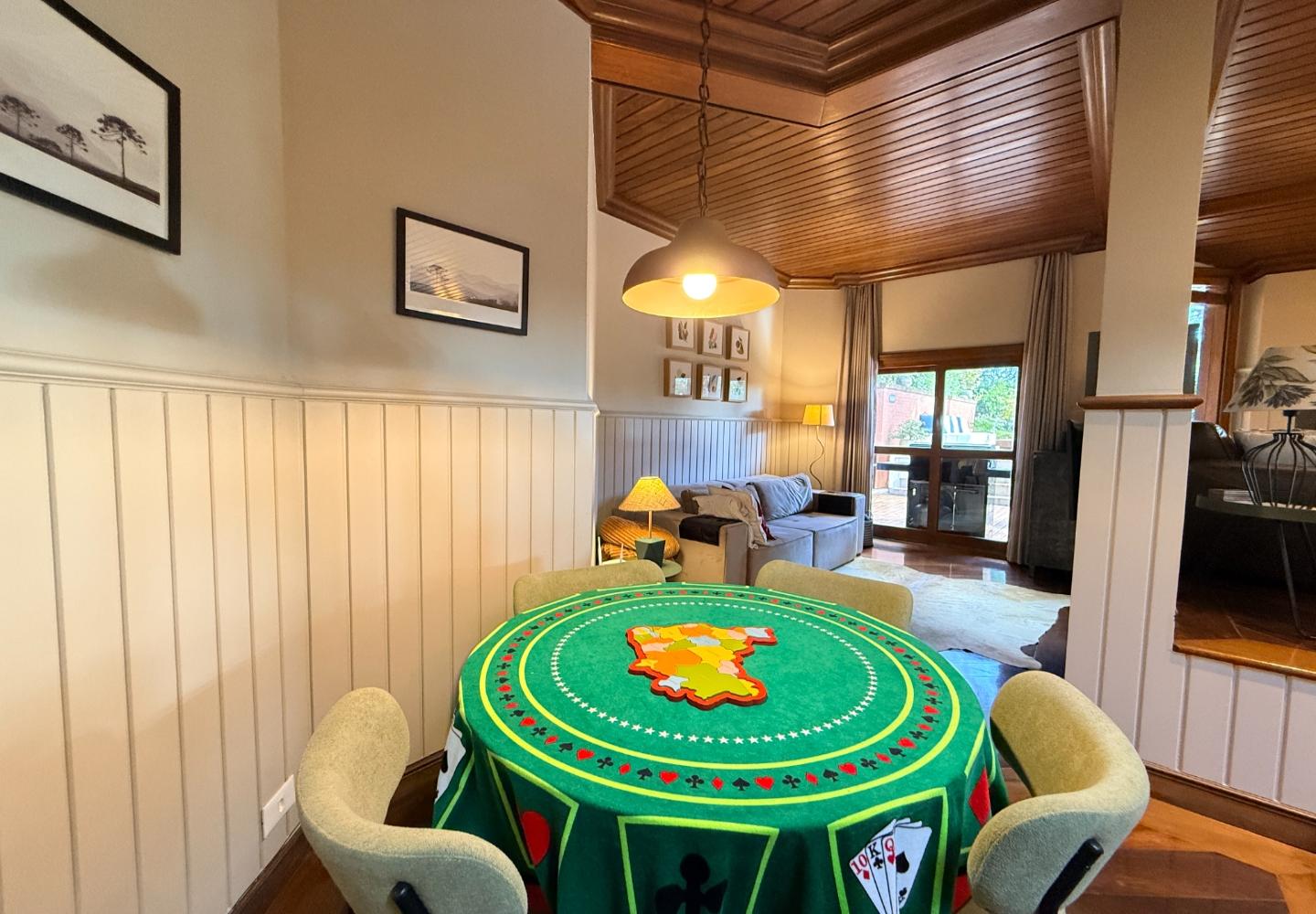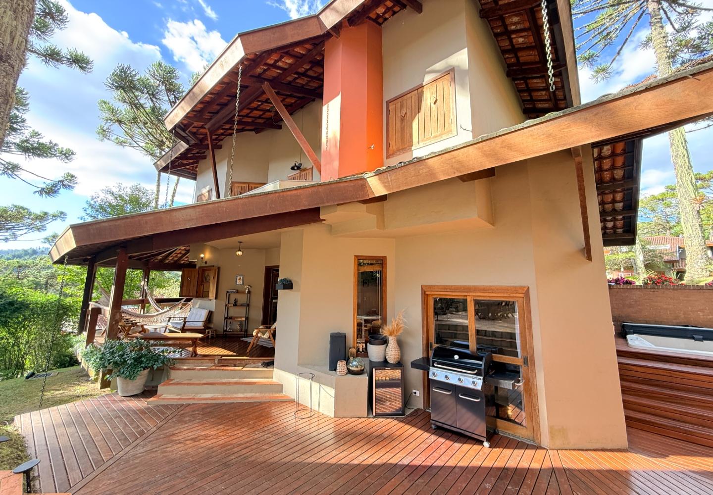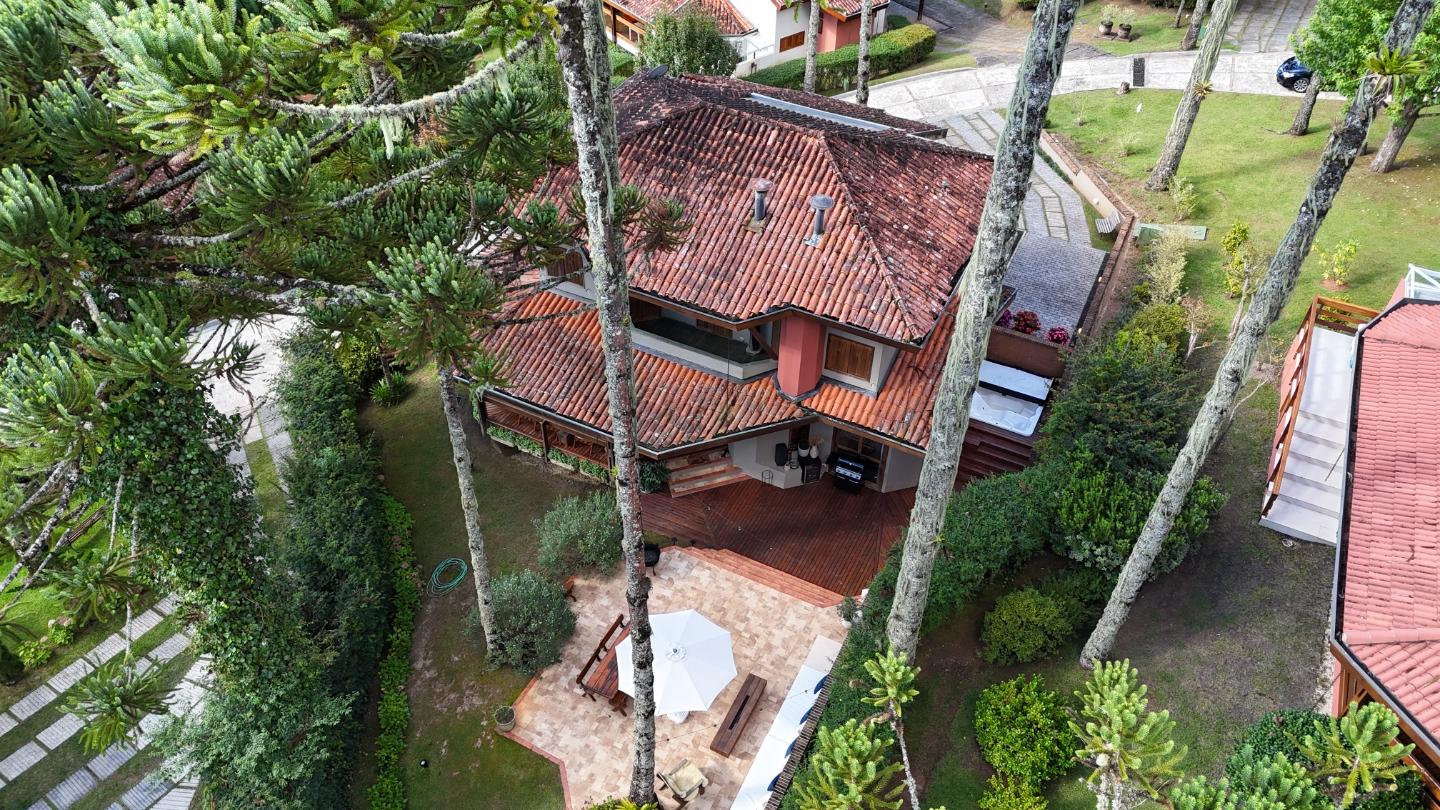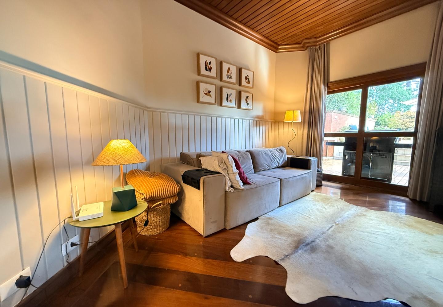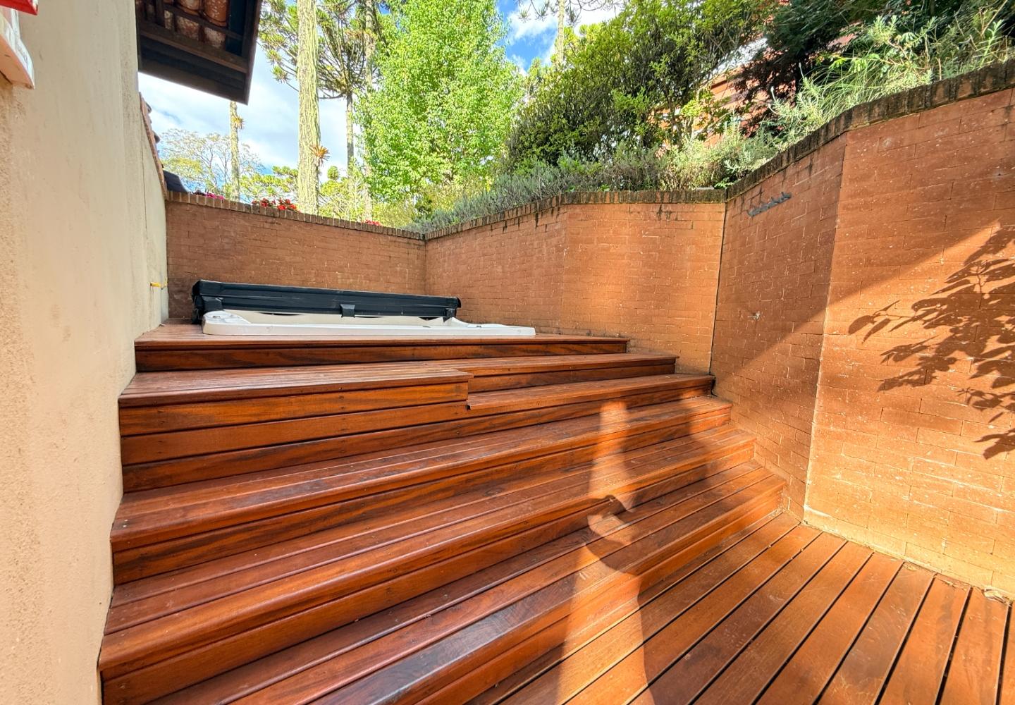 A área externa é um dos destaques, com hidromassagem para oito pessoas, espaço de convivência com fogo de chão e diferentes pontos para uso ao longo do dia. O imóvel conta com 240 m² de área privativa e vagas para até quatro veículos, em um condomínio reservado e arborizado.