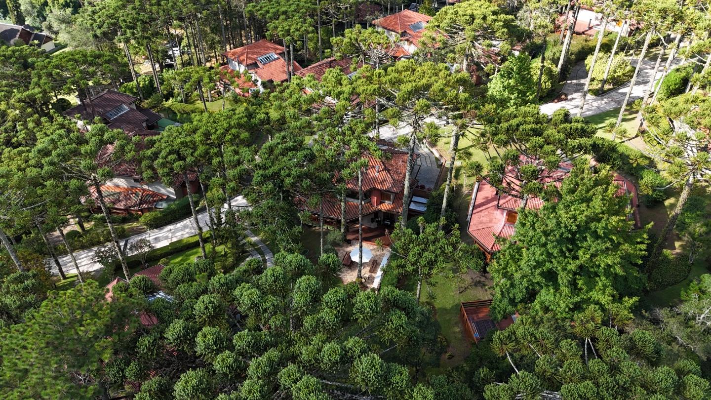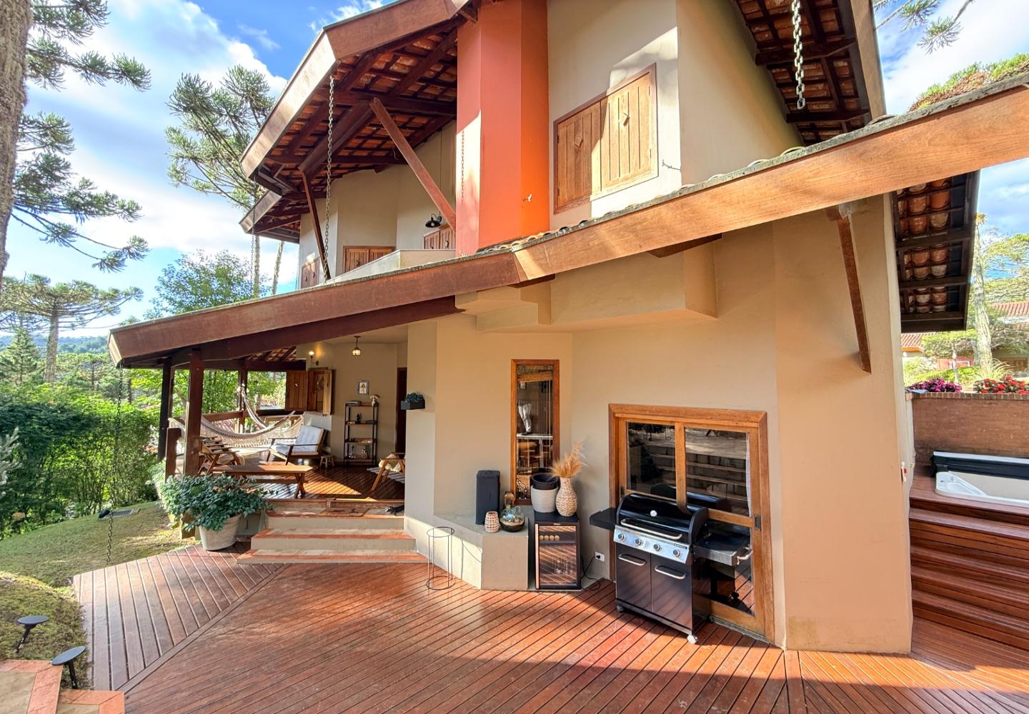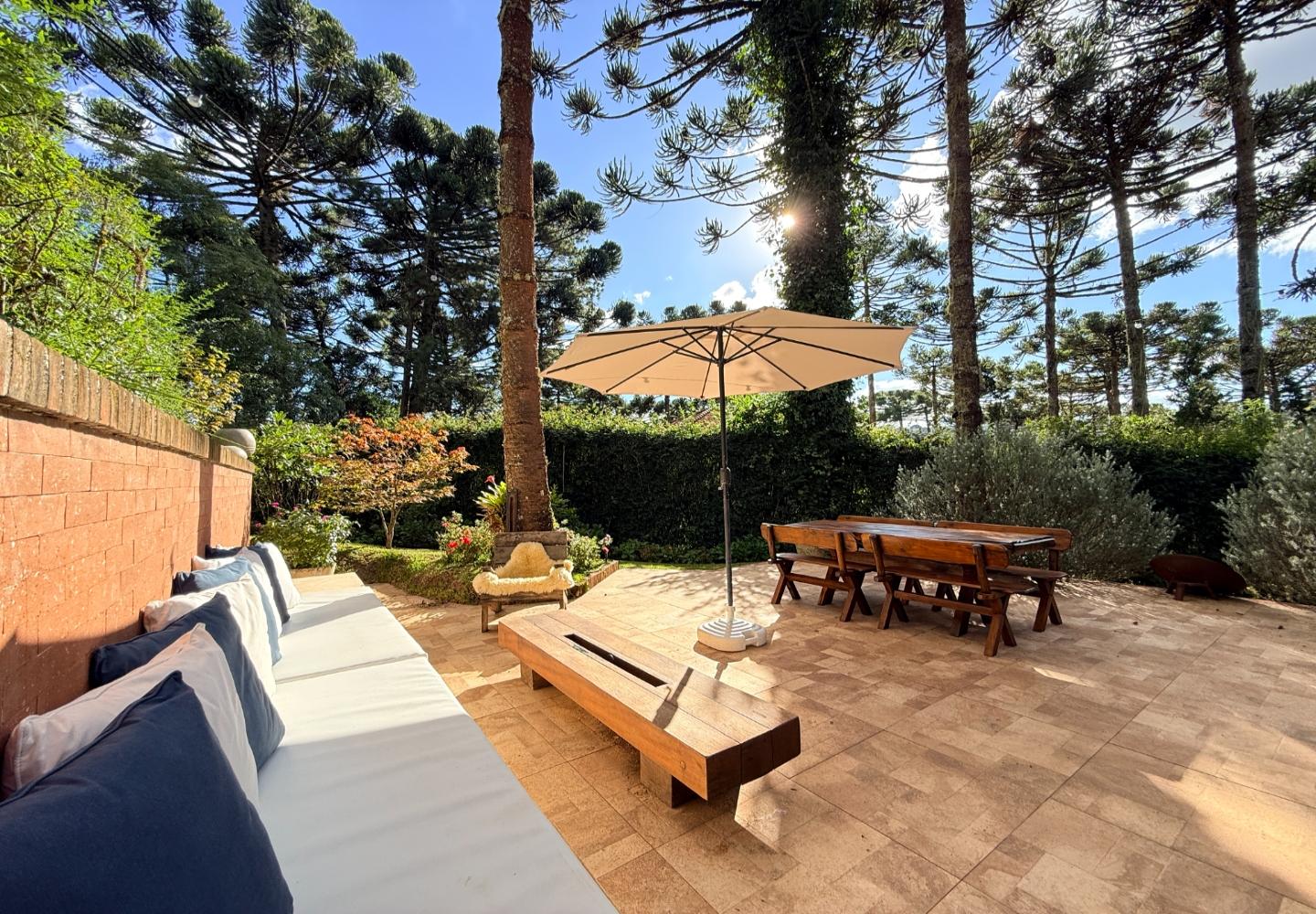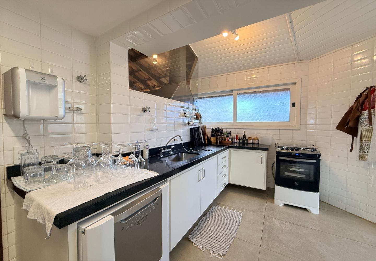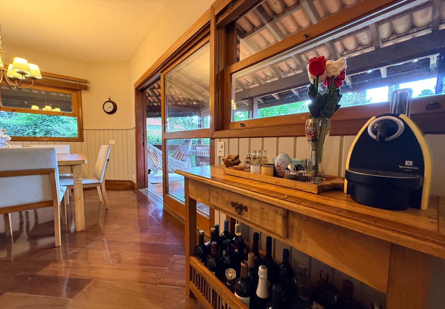 A área externa é um dos destaques, com hidromassagem para oito pessoas, espaço de convivência com fogo de chão e diferentes pontos para uso ao longo do dia. O imóvel conta com 240 m² de área privativa e vagas para até quatro veículos, em um condomínio reservado e arborizado.
