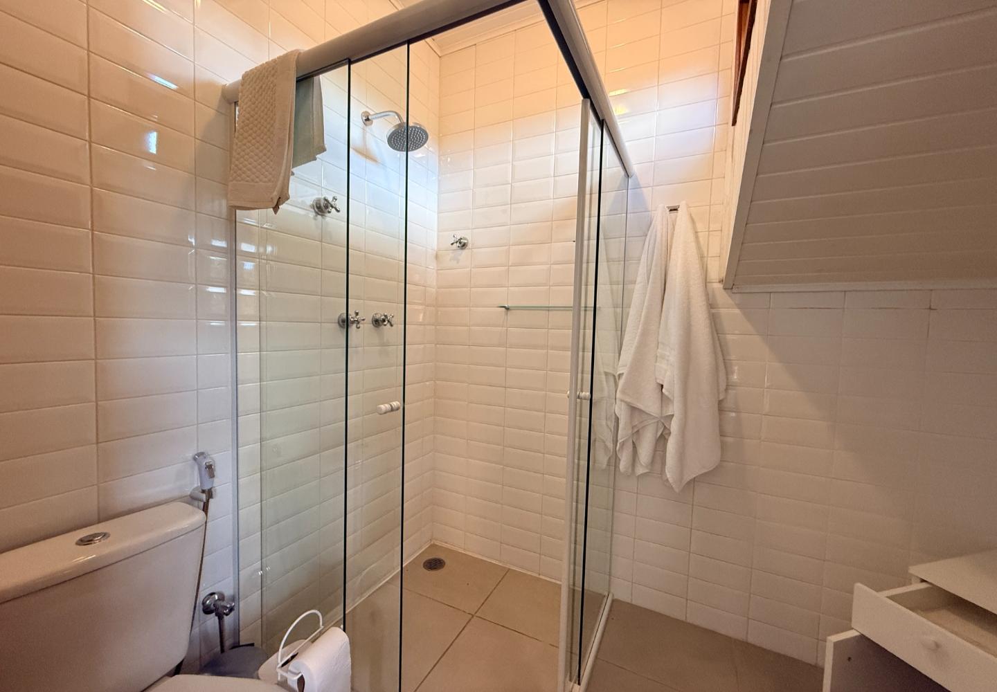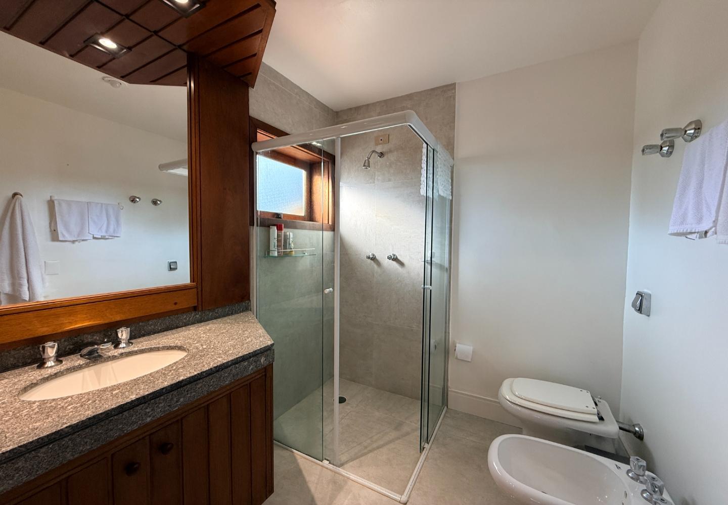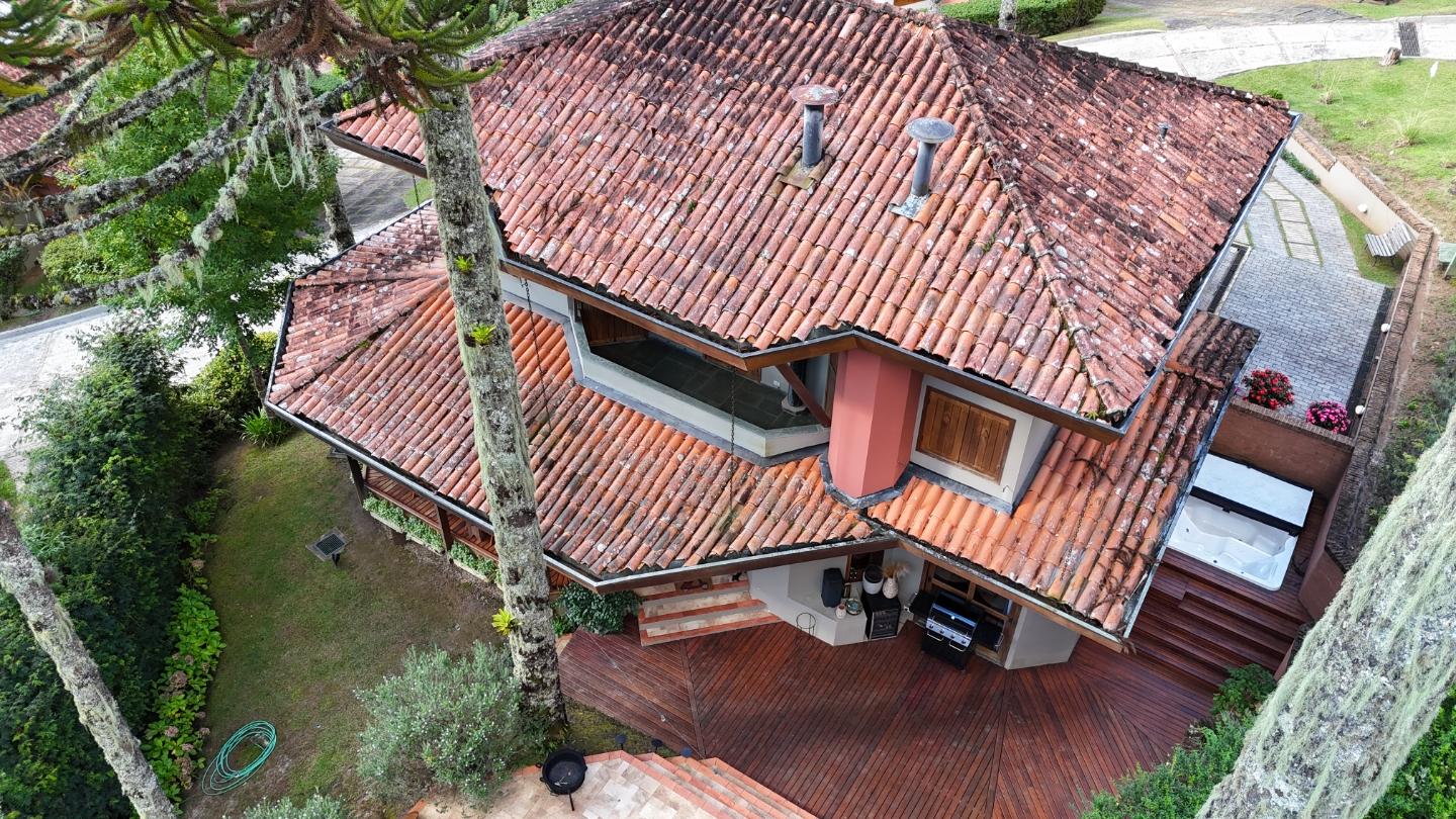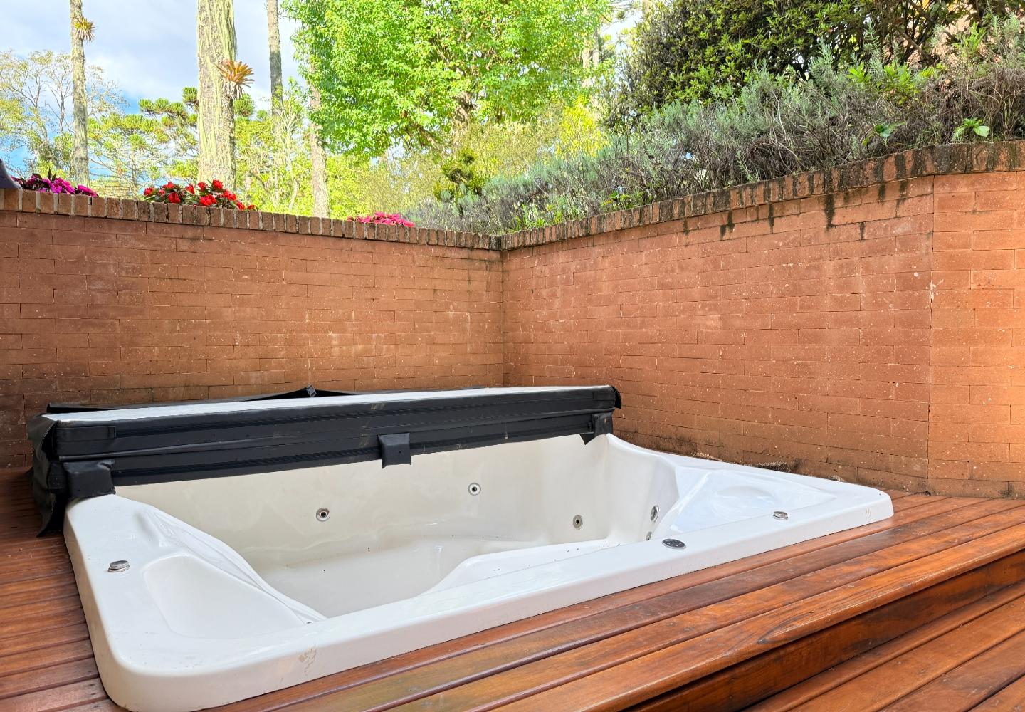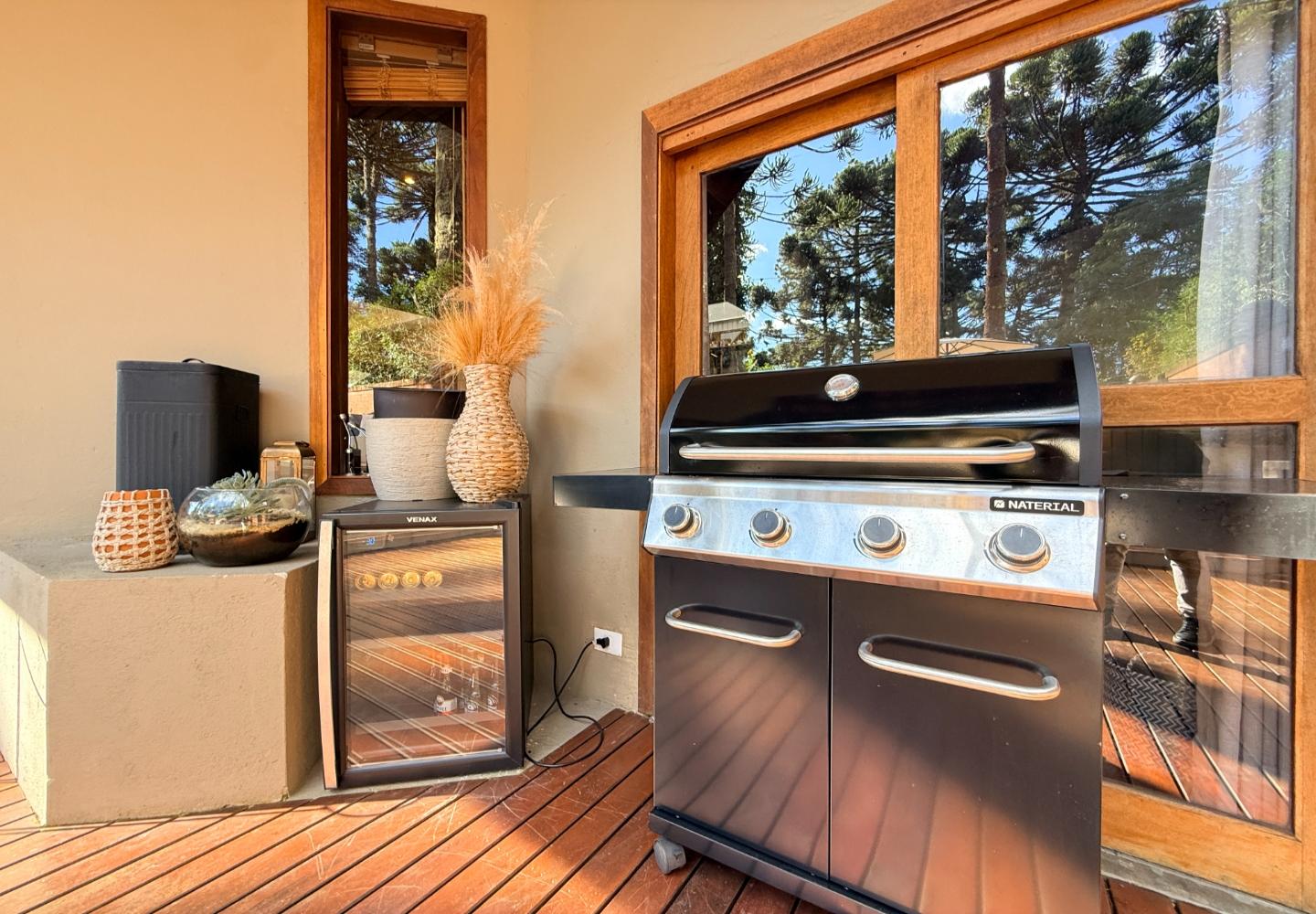 A área externa é um dos destaques, com hidromassagem para oito pessoas, espaço de convivência com fogo de chão e diferentes pontos para uso ao longo do dia. O imóvel conta com 240 m² de área privativa e vagas para até quatro veículos, em um condomínio reservado e arborizado.