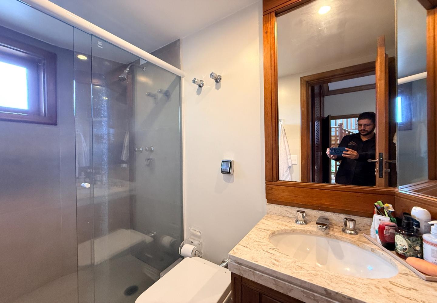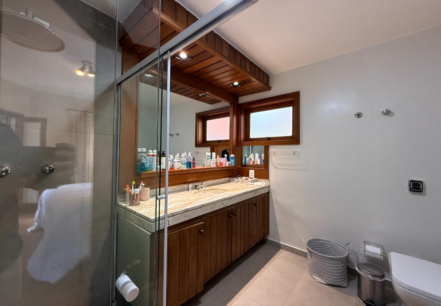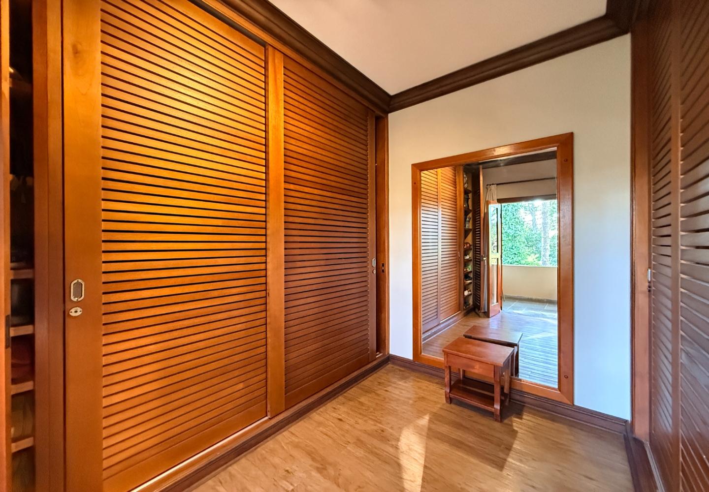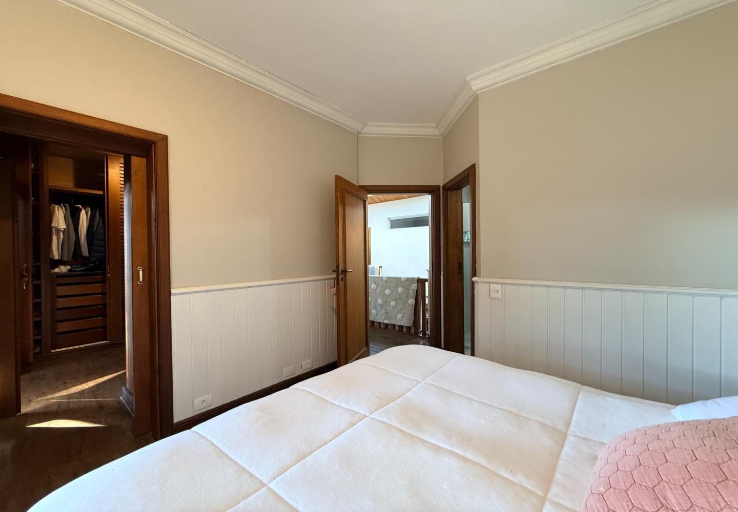 No pavimento superior, ficam mais três suítes, incluindo a principal com closet e sacada voltada para o verde. Os ambientes são bem distribuídos, com boa entrada de luz natural.