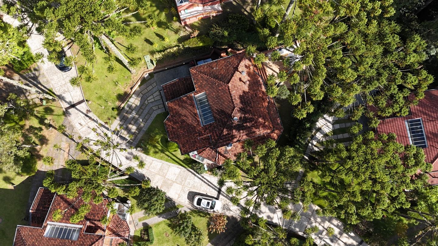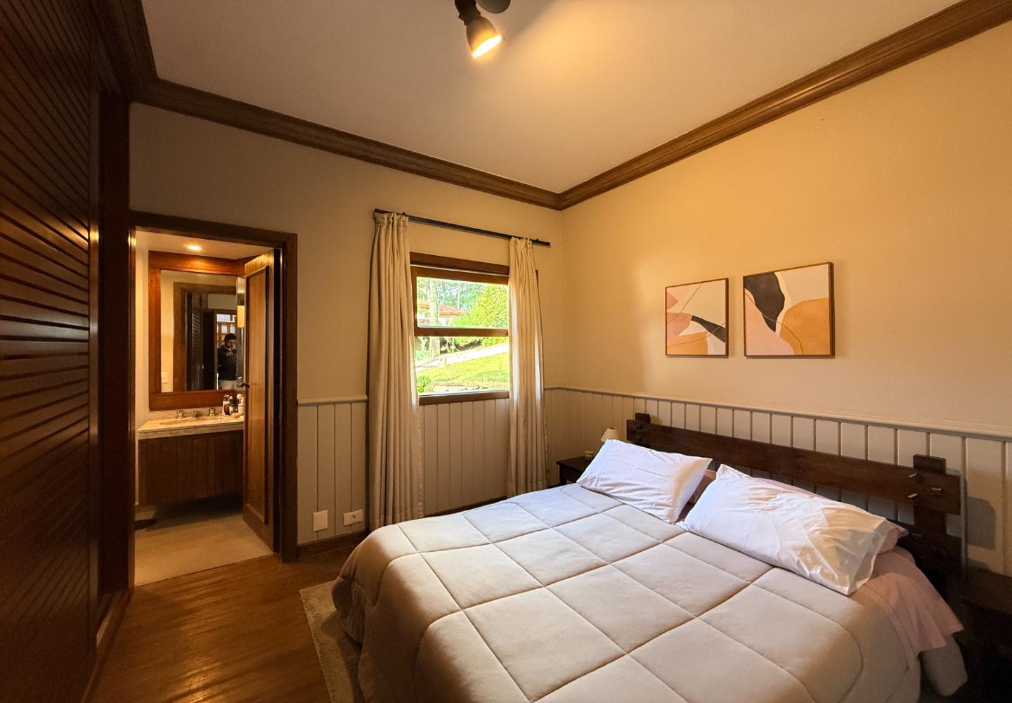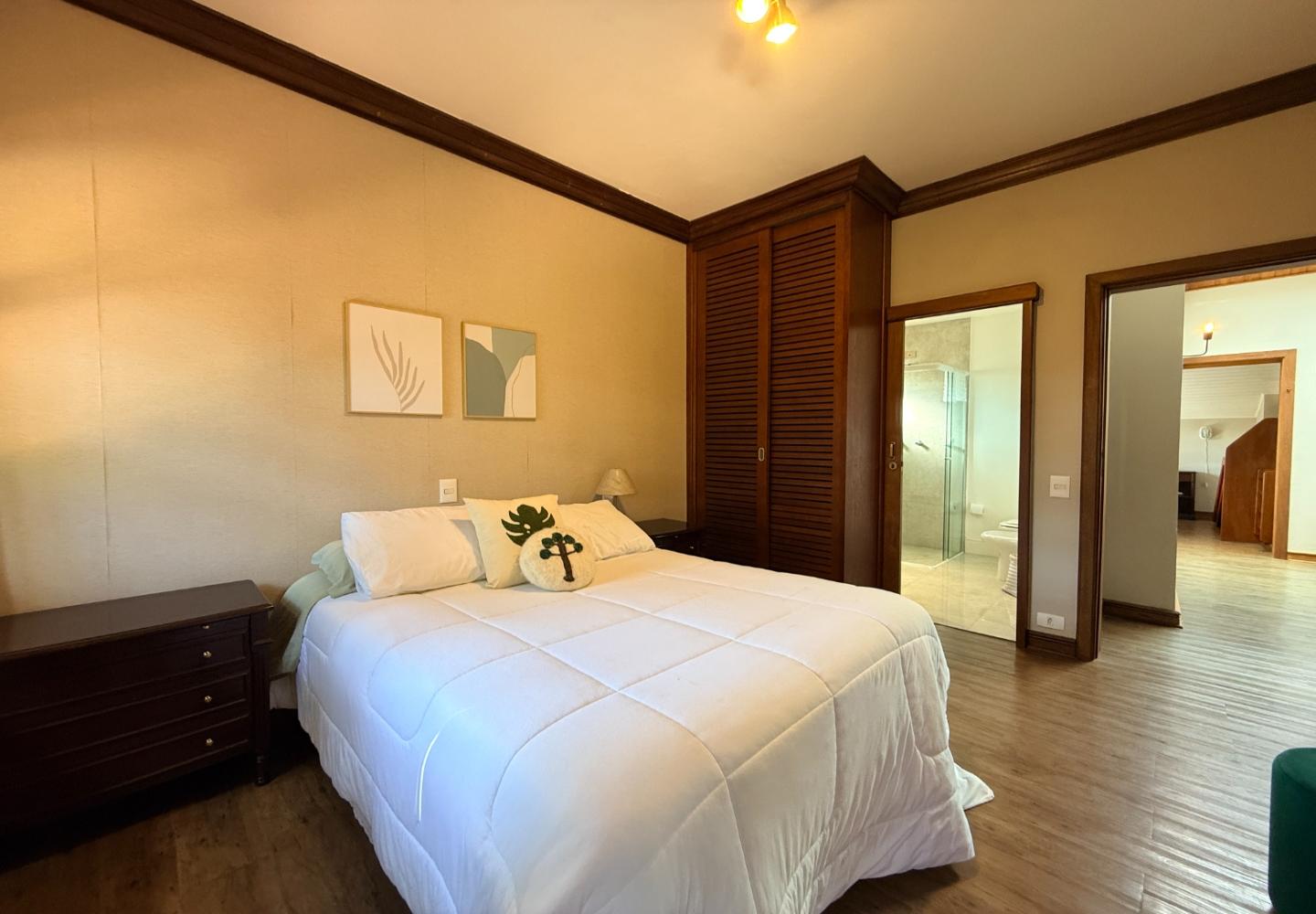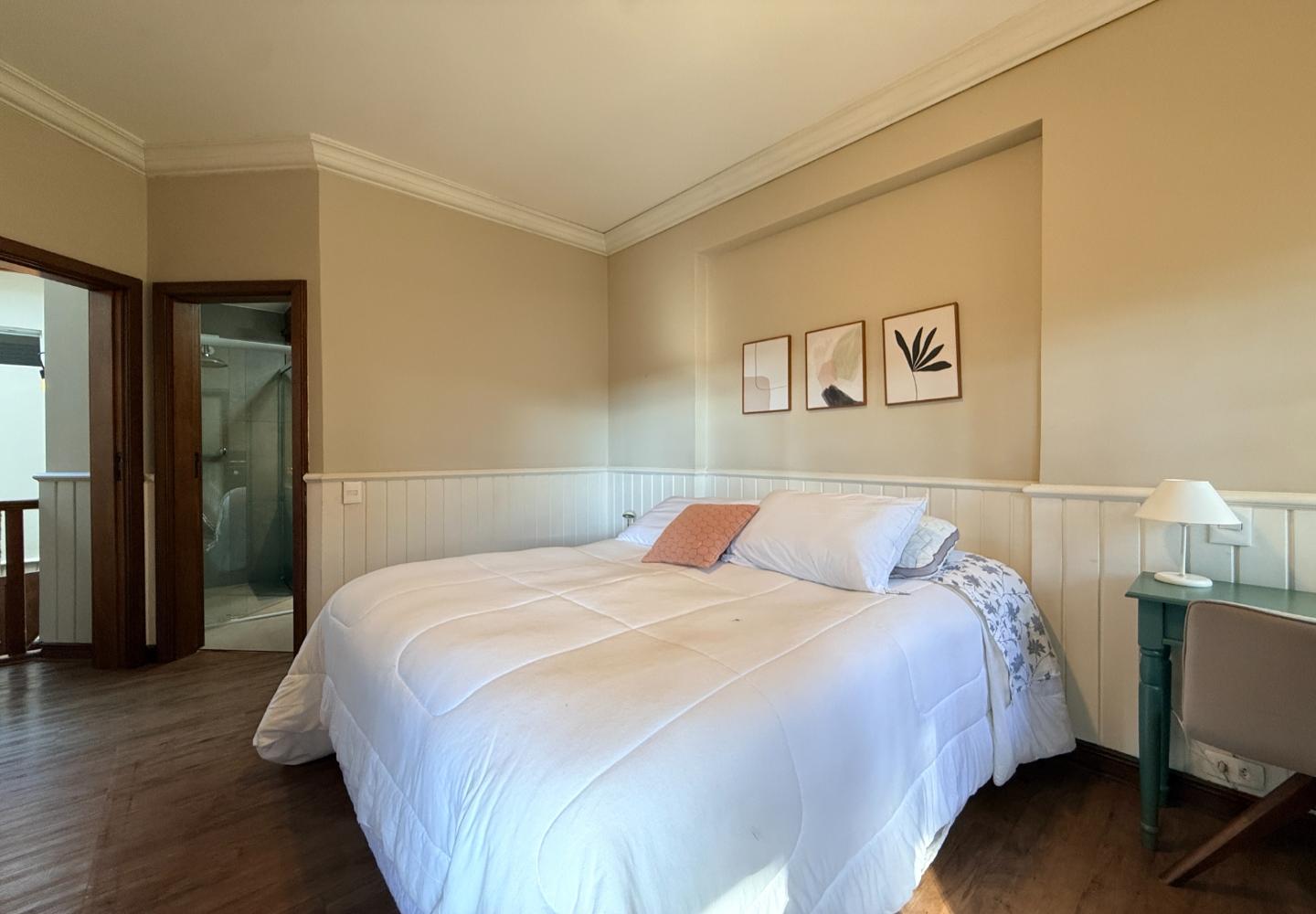 No pavimento superior, ficam mais três suítes, incluindo a principal com closet e sacada voltada para o verde. Os ambientes são bem distribuídos, com boa entrada de luz natural.