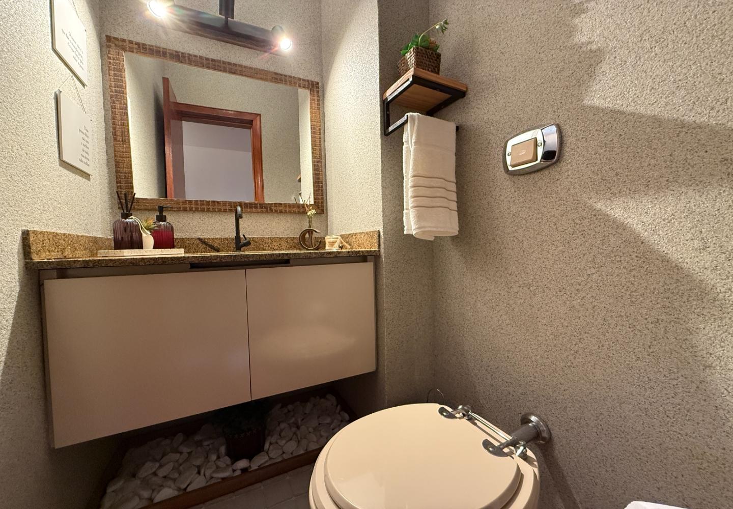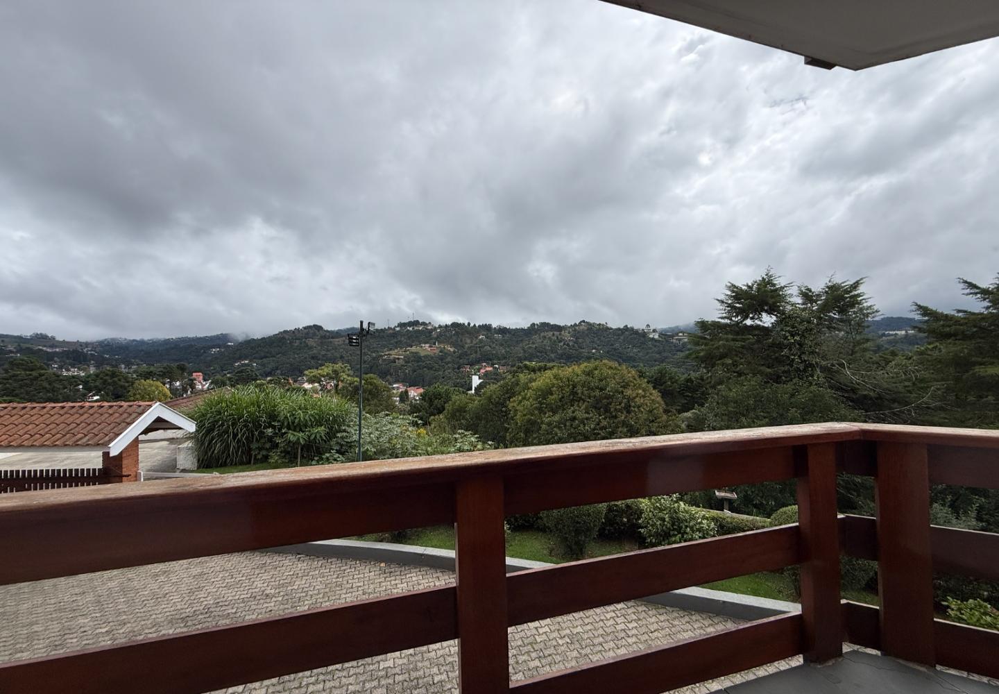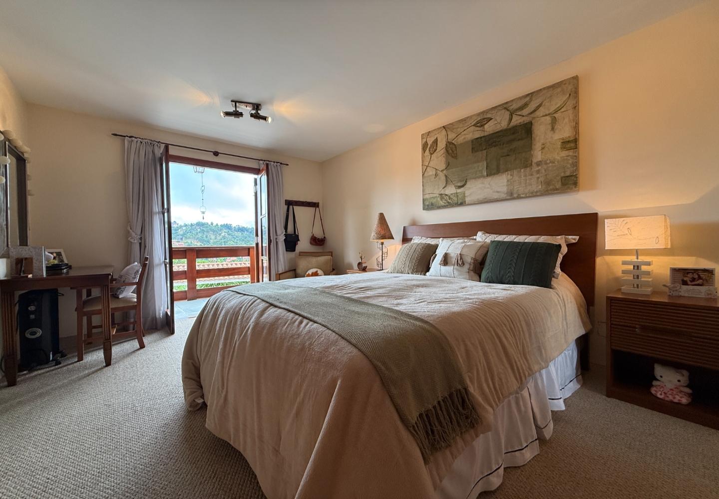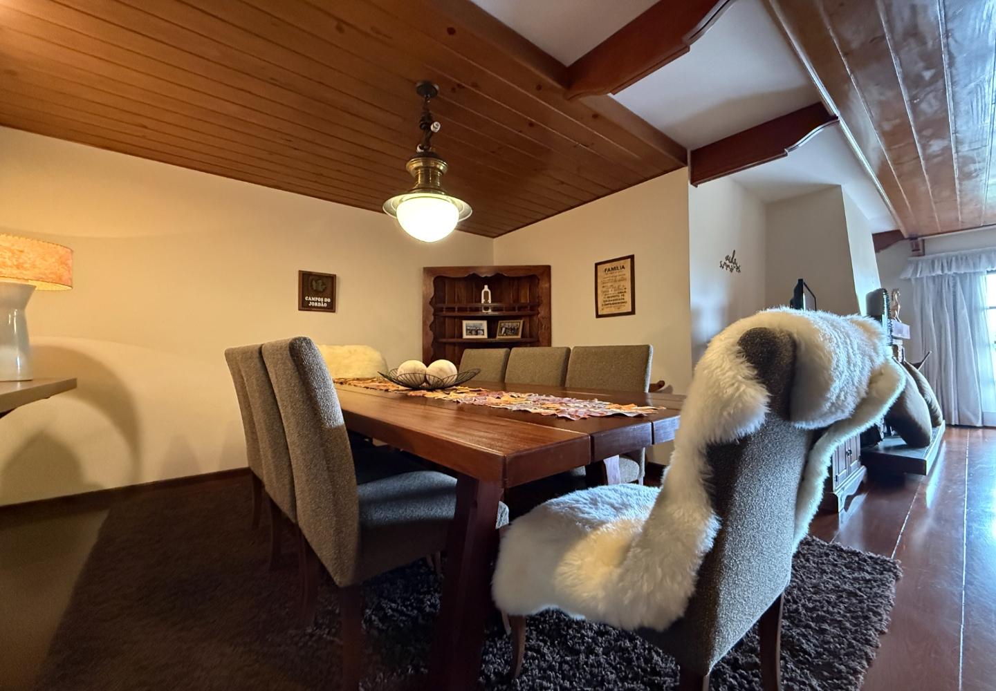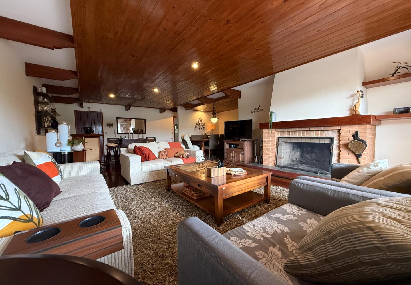 A área social é bem resolvida, com sala de estar integrada à lareira e ao jantar, criando um espaço confortável e funcional. Os acabamentos em madeira no piso e no forro reforçam a proposta serrana, mantendo um padrão consistente em todo o imóvel.
