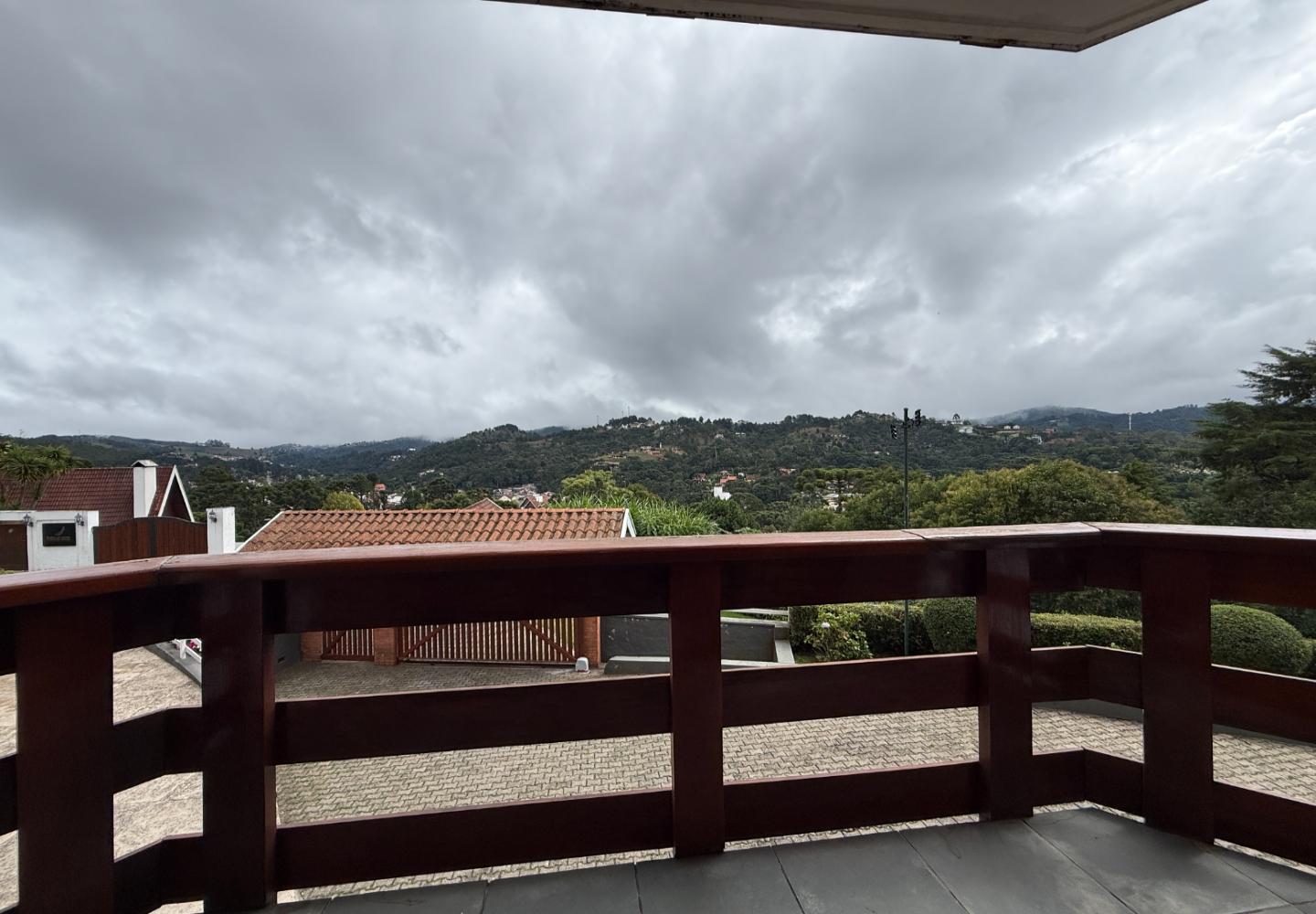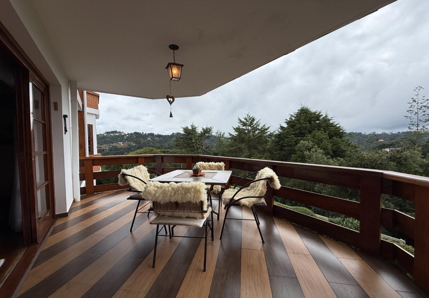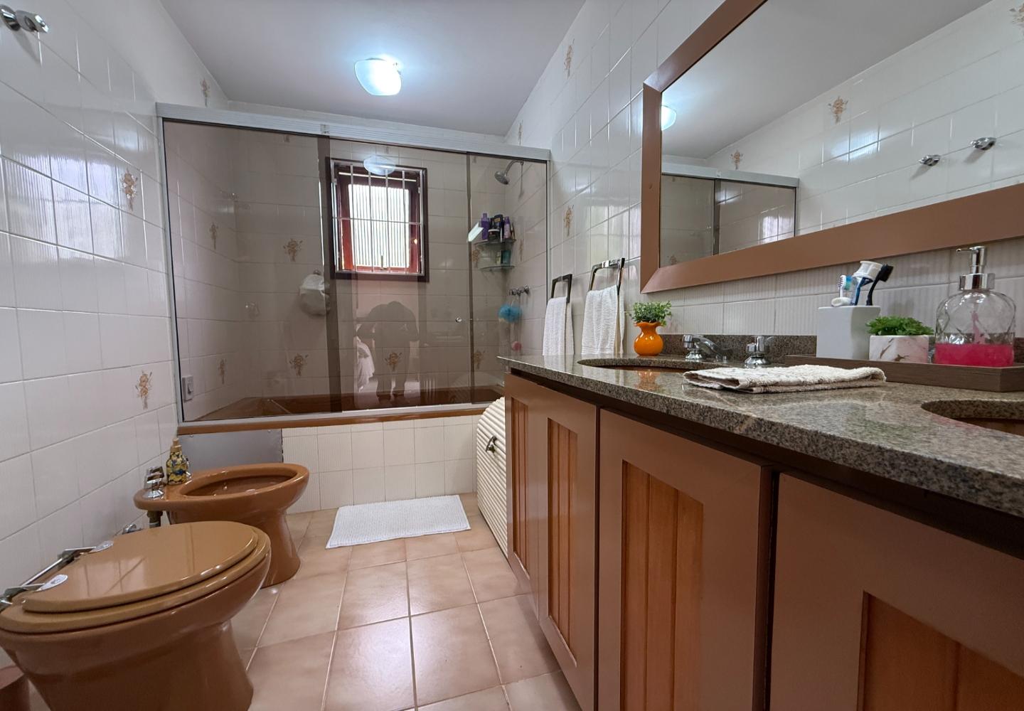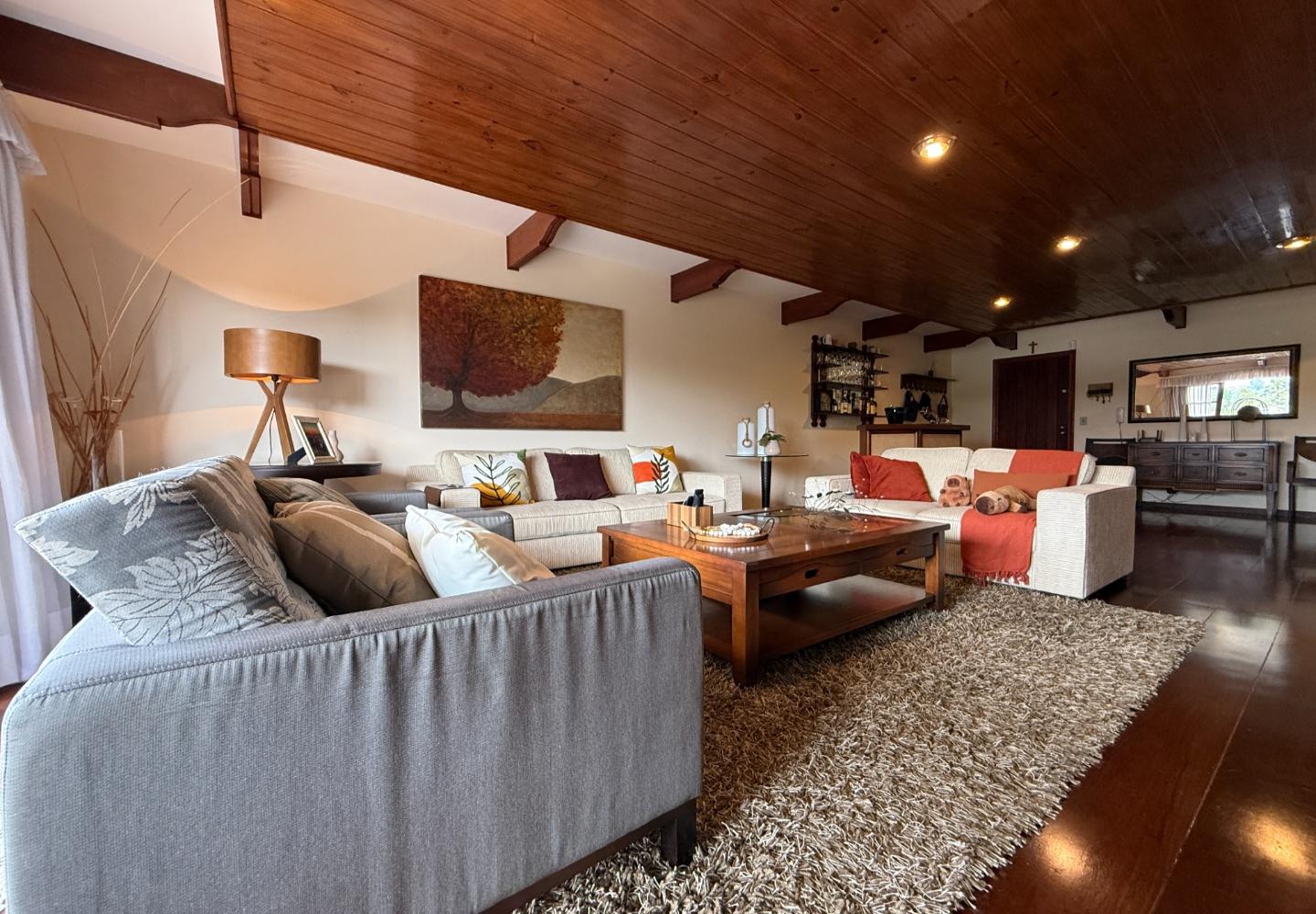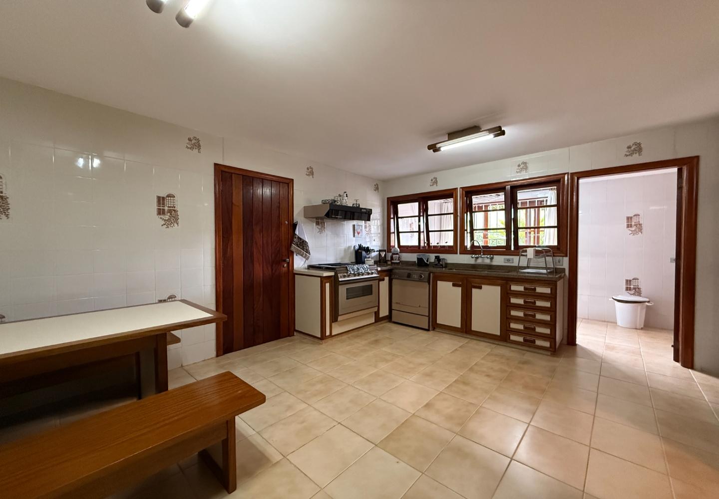 A área social é bem resolvida, com sala de estar integrada à lareira e ao jantar, criando um espaço confortável e funcional. Os acabamentos em madeira no piso e no forro reforçam a proposta serrana, mantendo um padrão consistente em todo o imóvel.