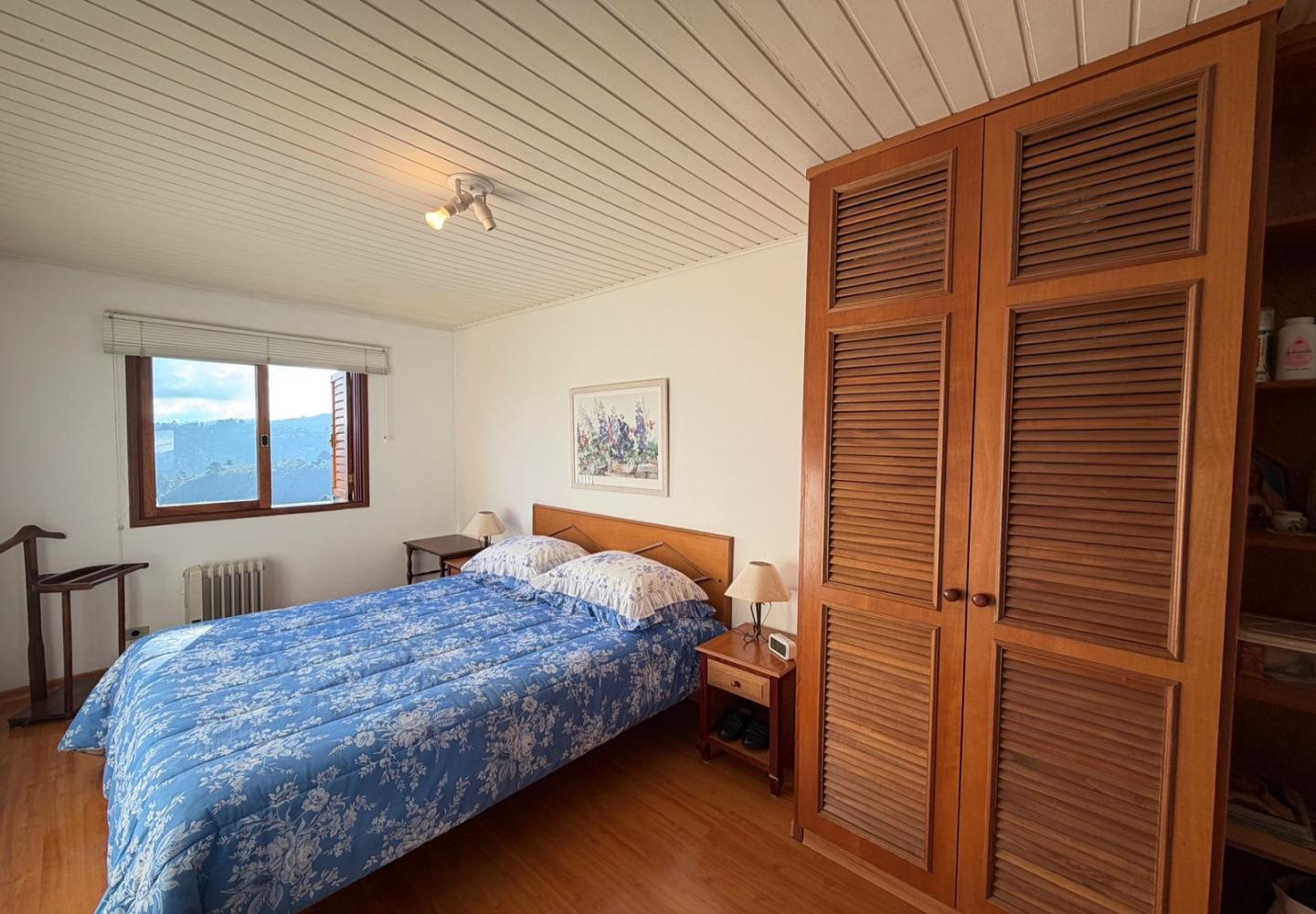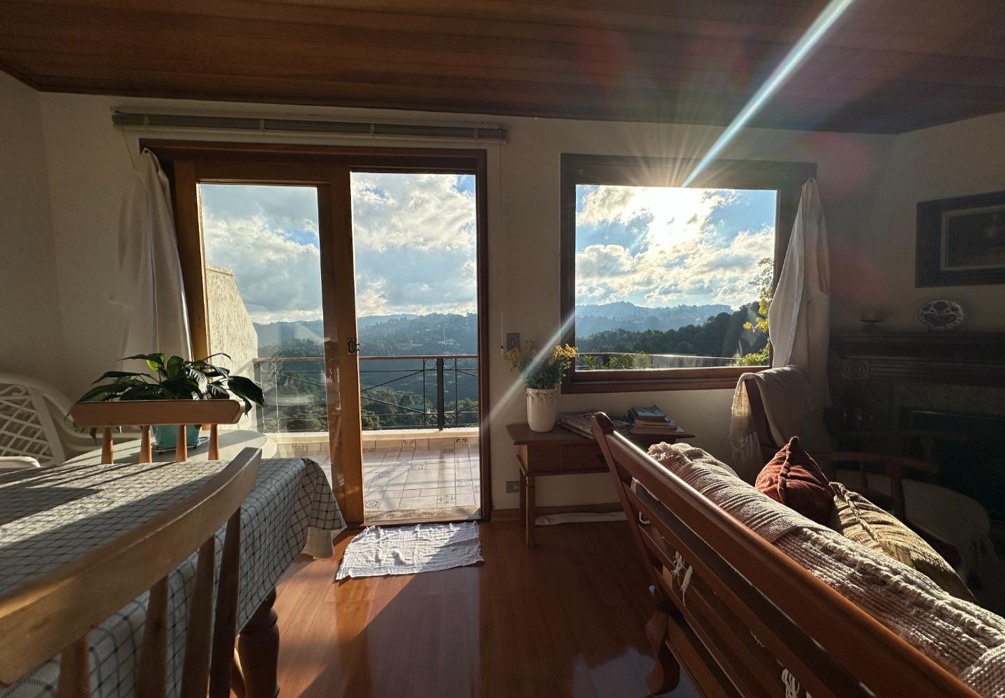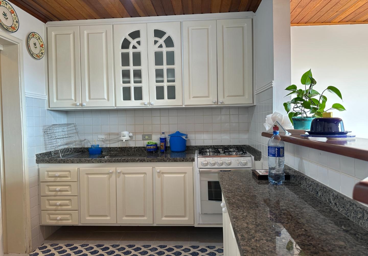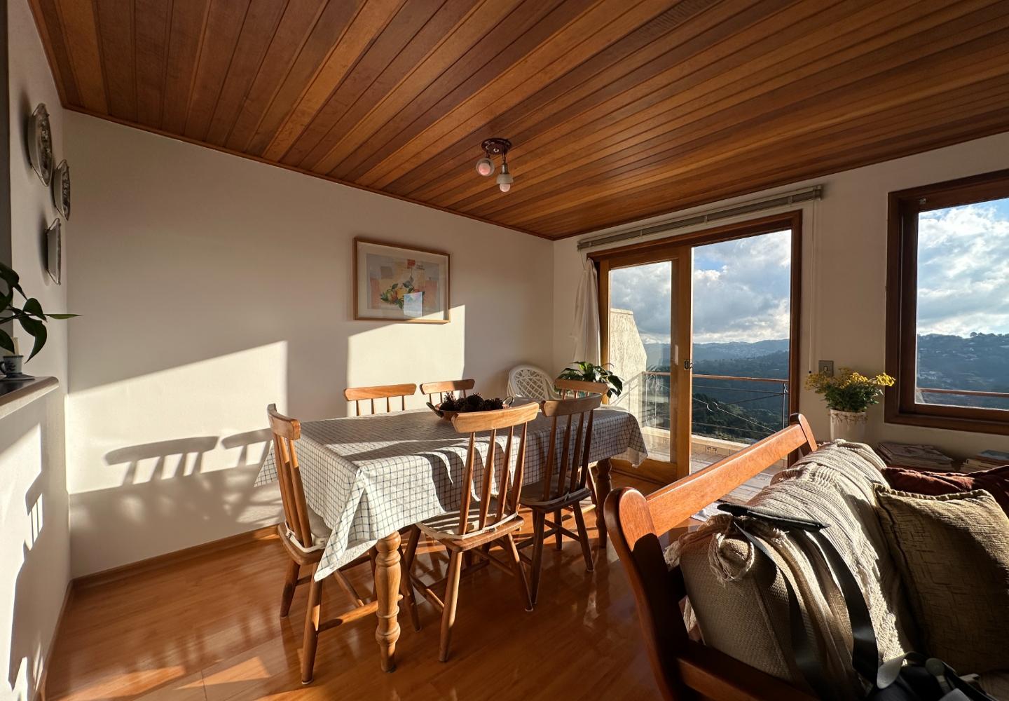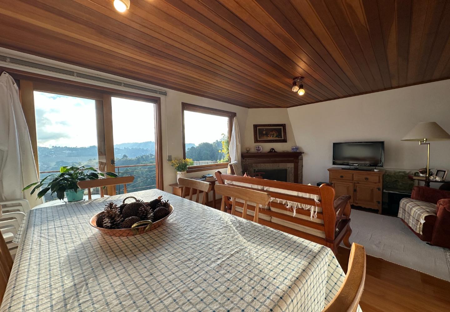 A lareira e o uso de madeira no piso e no forro trazem aquele estilo clássico de Campos do Jordão, bem alinhado com a proposta do imóvel. A cozinha é funcional, com boa área de apoio e ligação prática com o restante do apartamento.