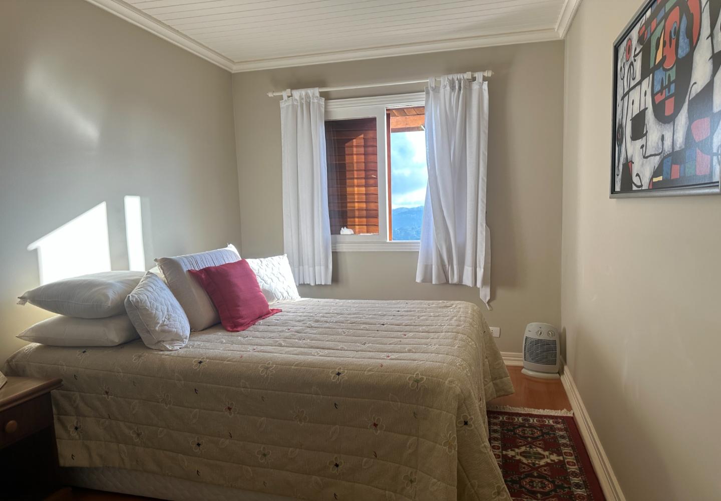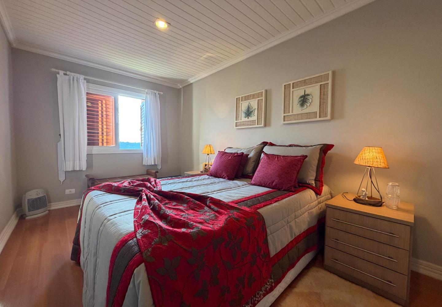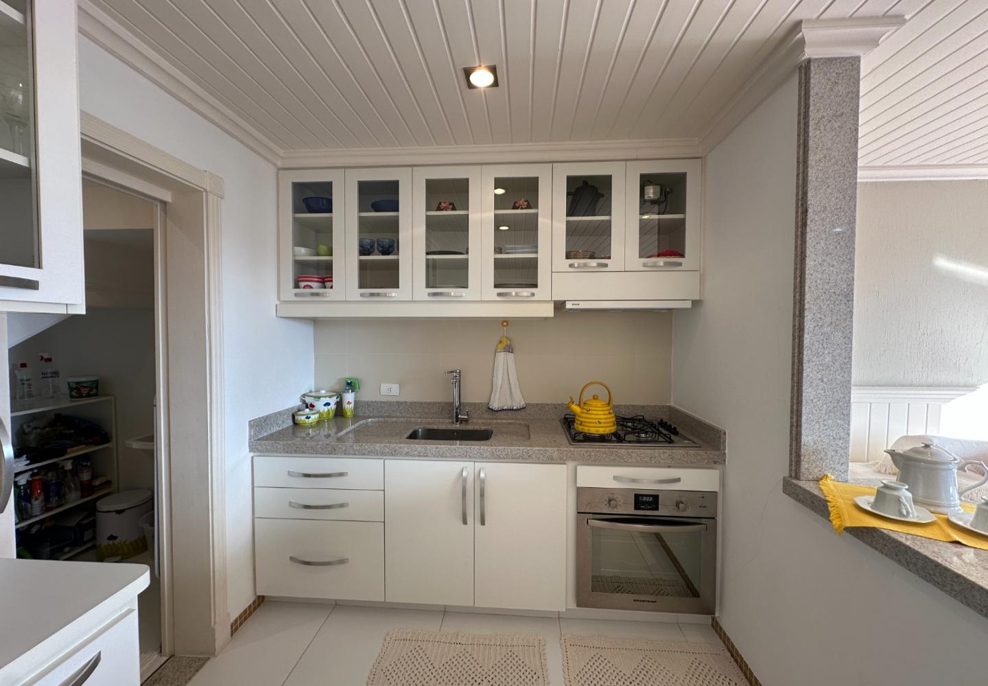A área social é bem distribuída, com sala integrada à varanda e grandes aberturas que trazem luz natural ao longo do dia. A lareira reforça o clima de serra e cria um ponto central agradável para os momentos mais tranquilos. A cozinha, com móveis planejados, se conecta de forma prática ao ambiente, mantendo funcionalidade no dia a dia.