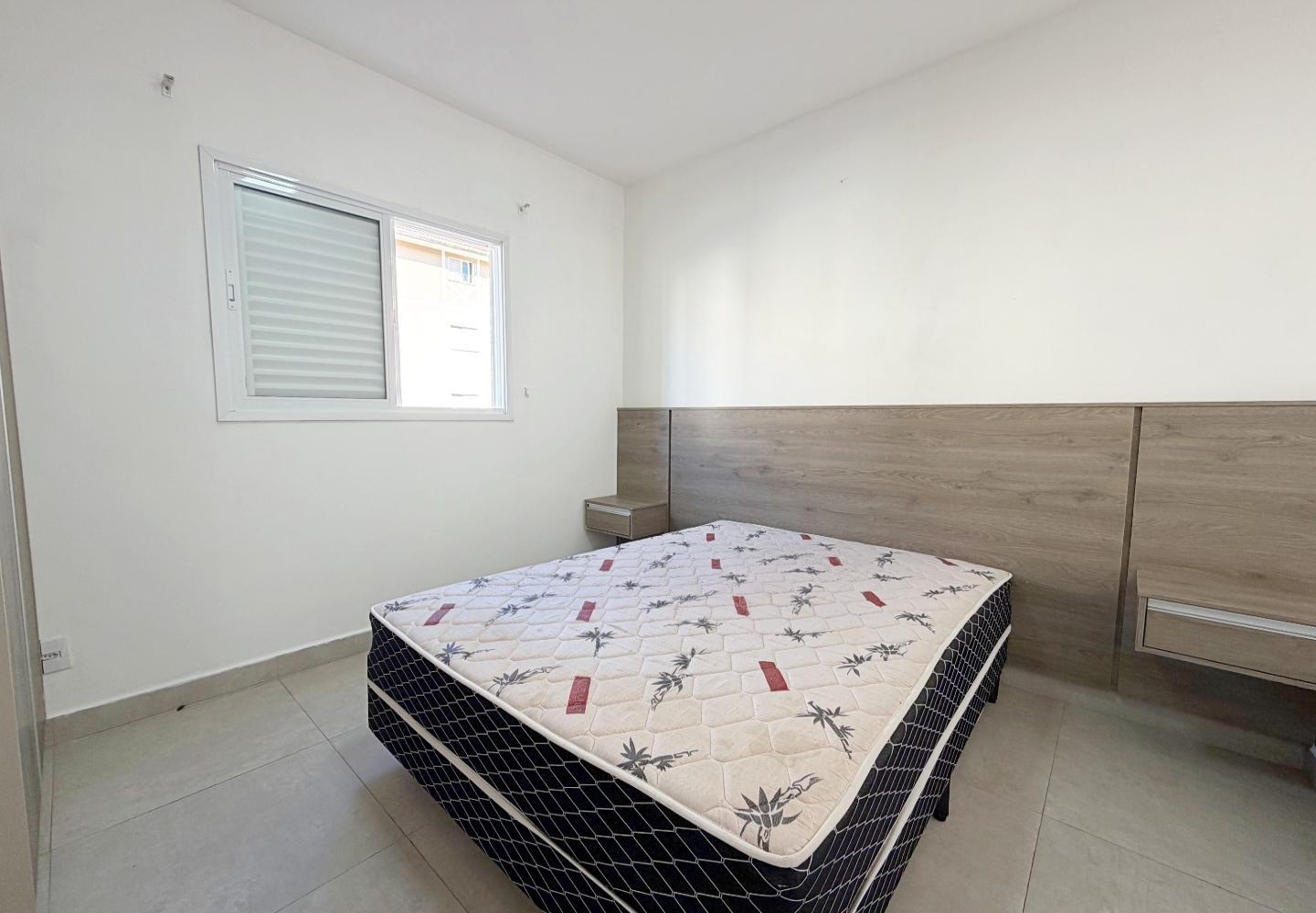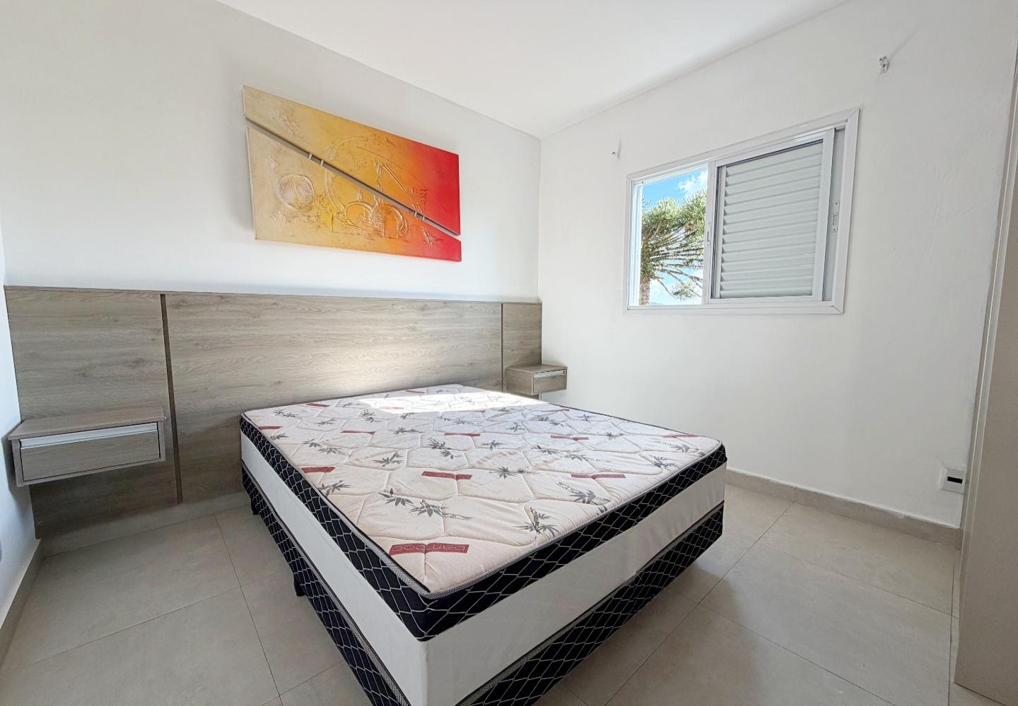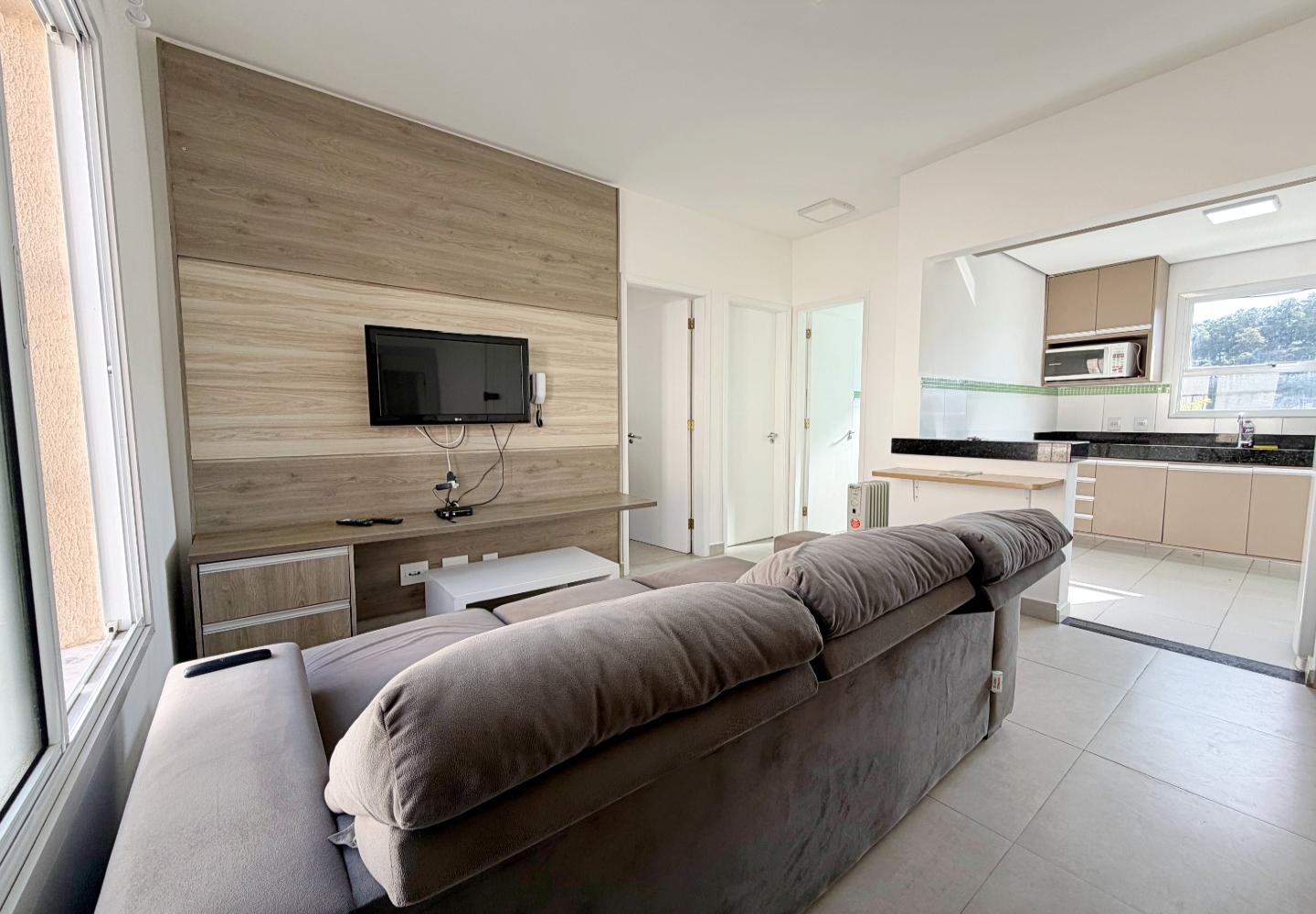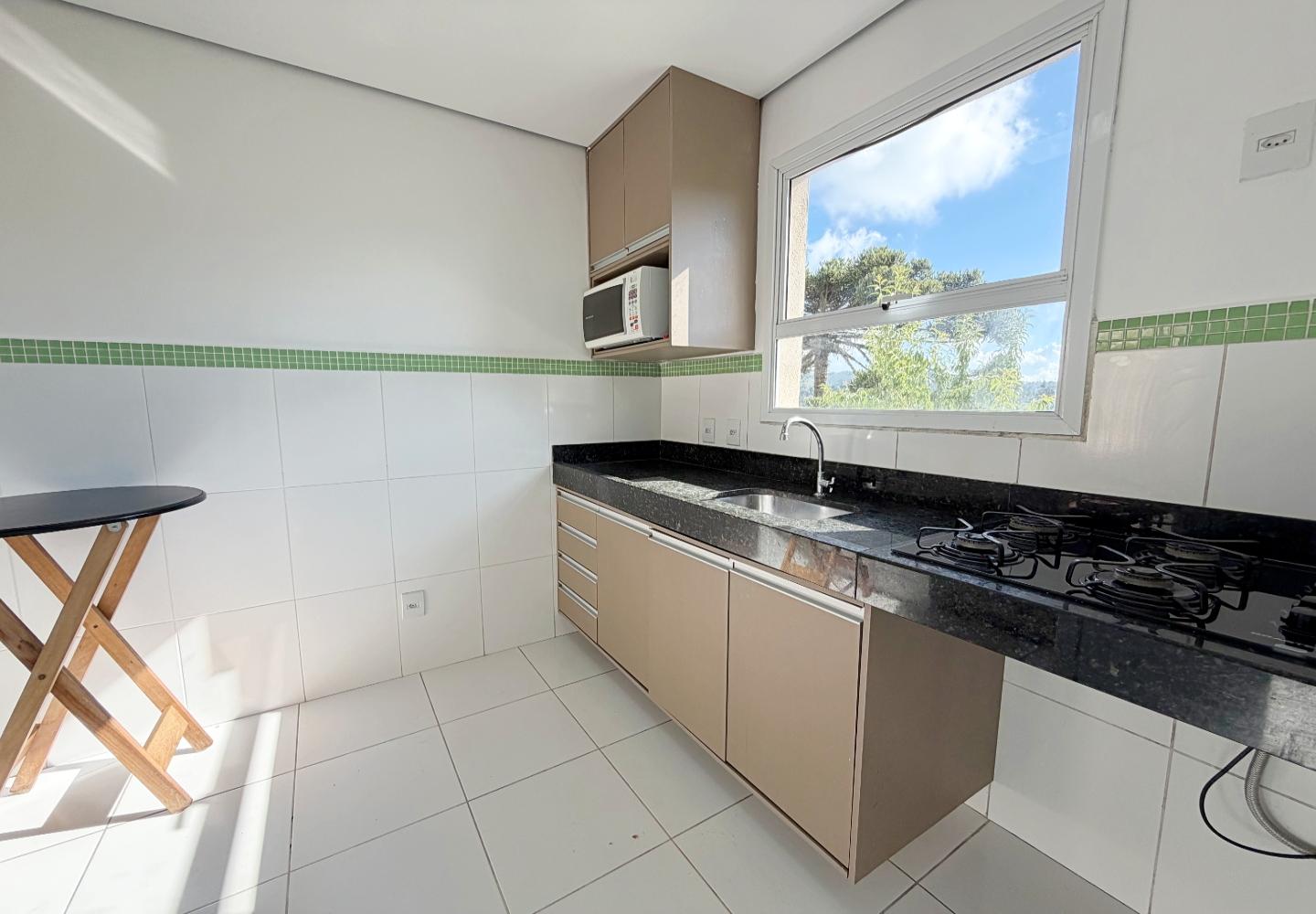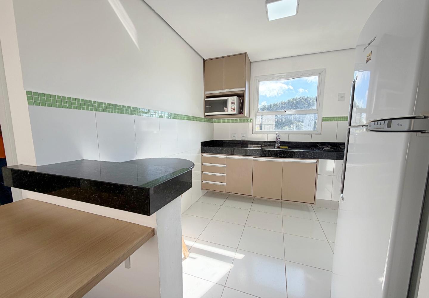A sala recebe luz da janela frontal e se conecta visualmente à cozinha, que possui bancada em granito, armários planejados e janela voltada para a mata, garantindo ventilação constante. Os dois dormitórios seguem o mesmo padrão de acabamento claro e funcional, e o banheiro oferece ventilação natural e box em vidro.
