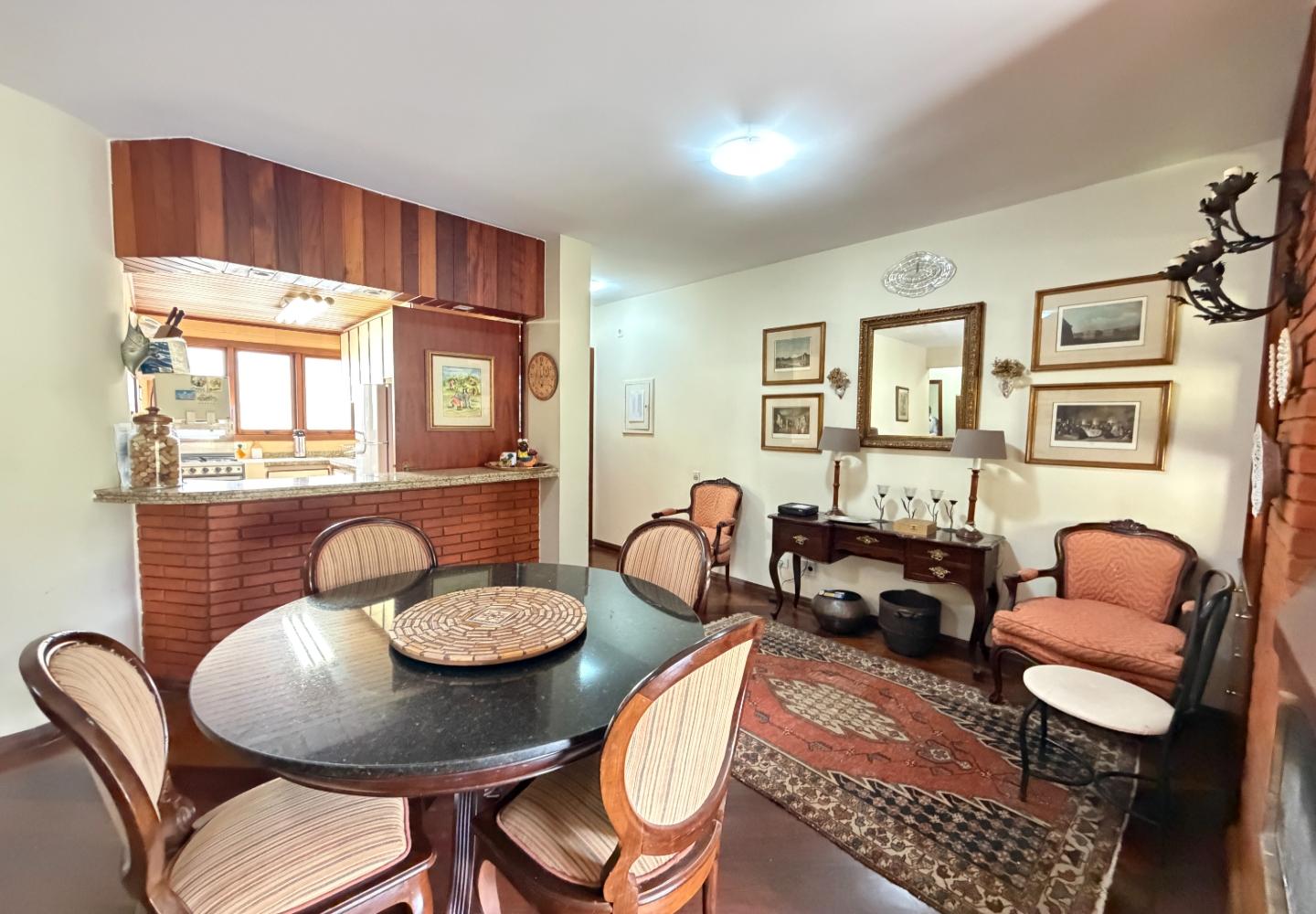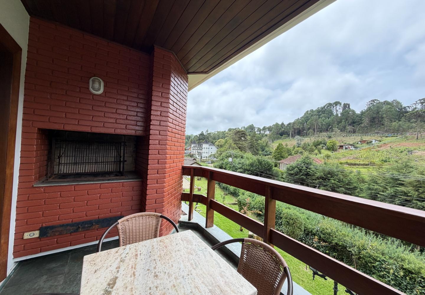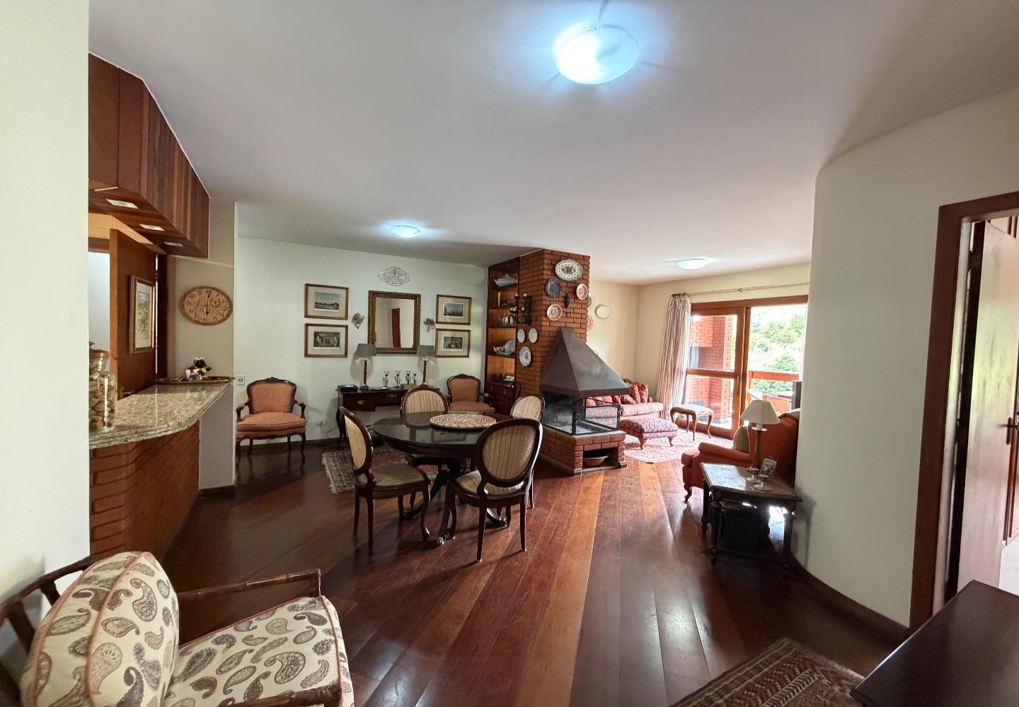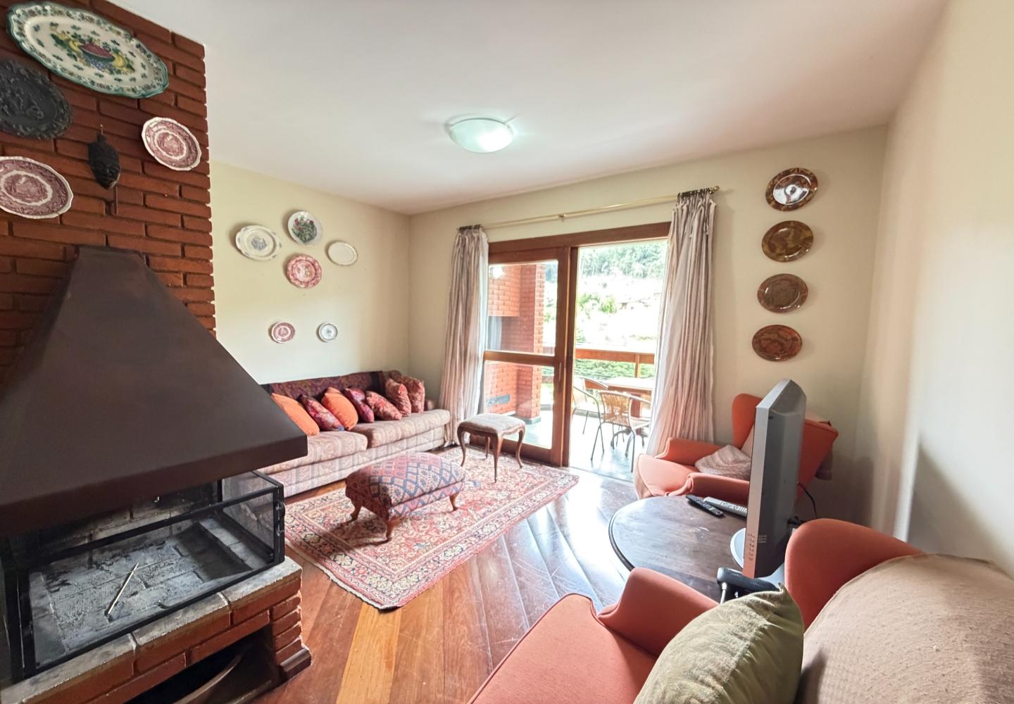 A cozinha tem bancada de apoio voltada para a sala, mantendo a conexão entre os espaços de convivência. Na área íntima, são 3 dormitórios, sendo 1 suíte, todos com marcenaria, proporções confortáveis e um estilo que conversa com a proposta mais clássica do imóvel. Será vendido mobiliado. O condomínio dispõe de portaria 24 horas, estacionamento, jardins cuidados e infraestrutura de lazer com quadra poliesportiva, além de fácil acesso às principais vias da cidade. Trata-se de uma opção completa em um dos endereços mais consolidados de Campos do Jordão, unindo segurança, valorização imobiliária e qualidade de vida em meio à natureza da serra.