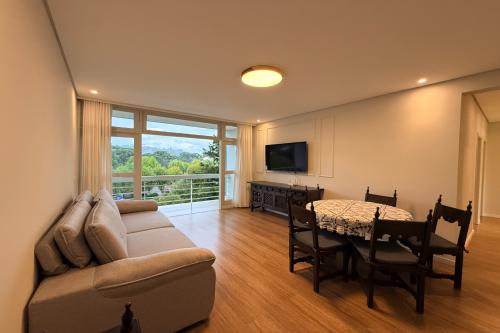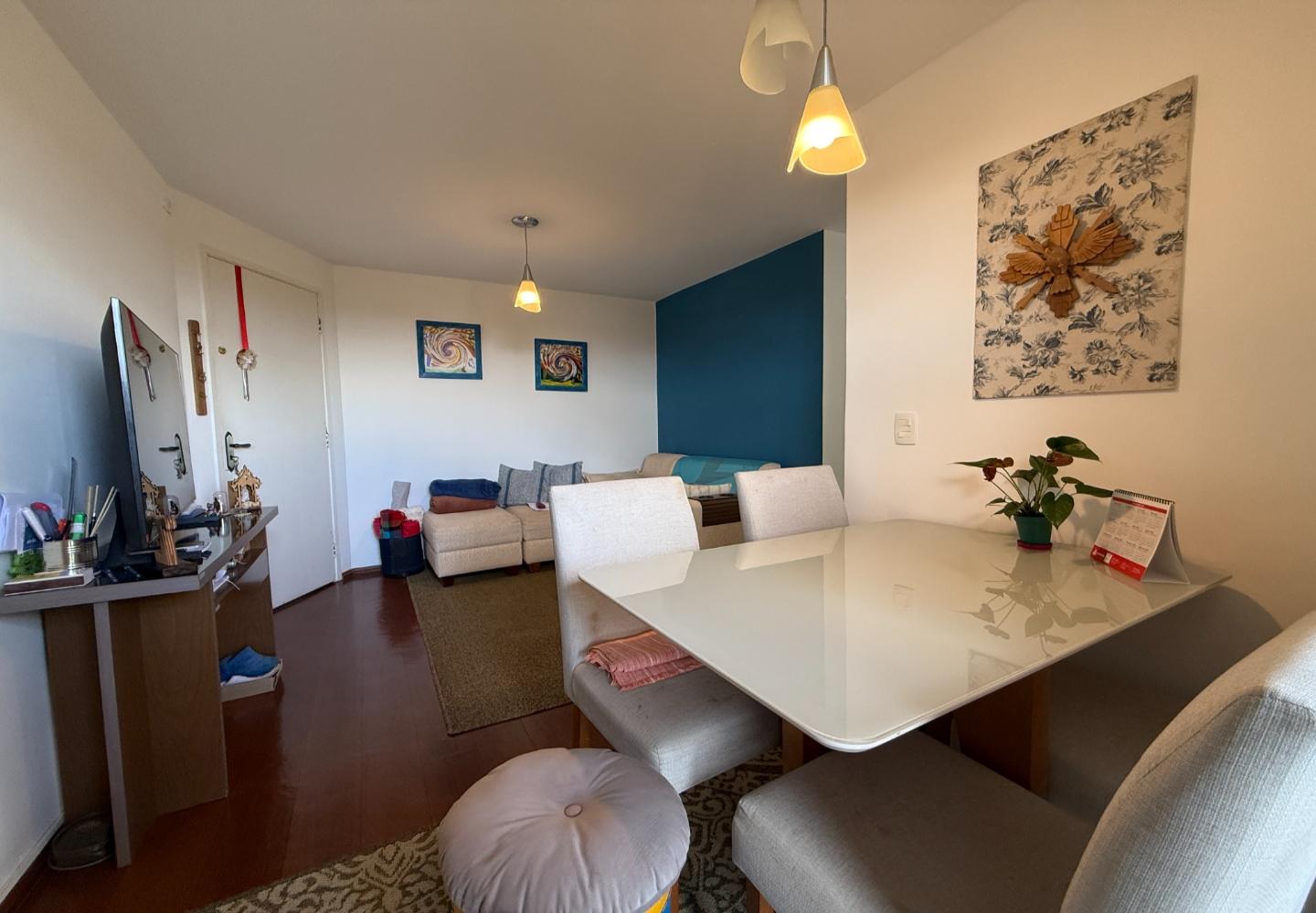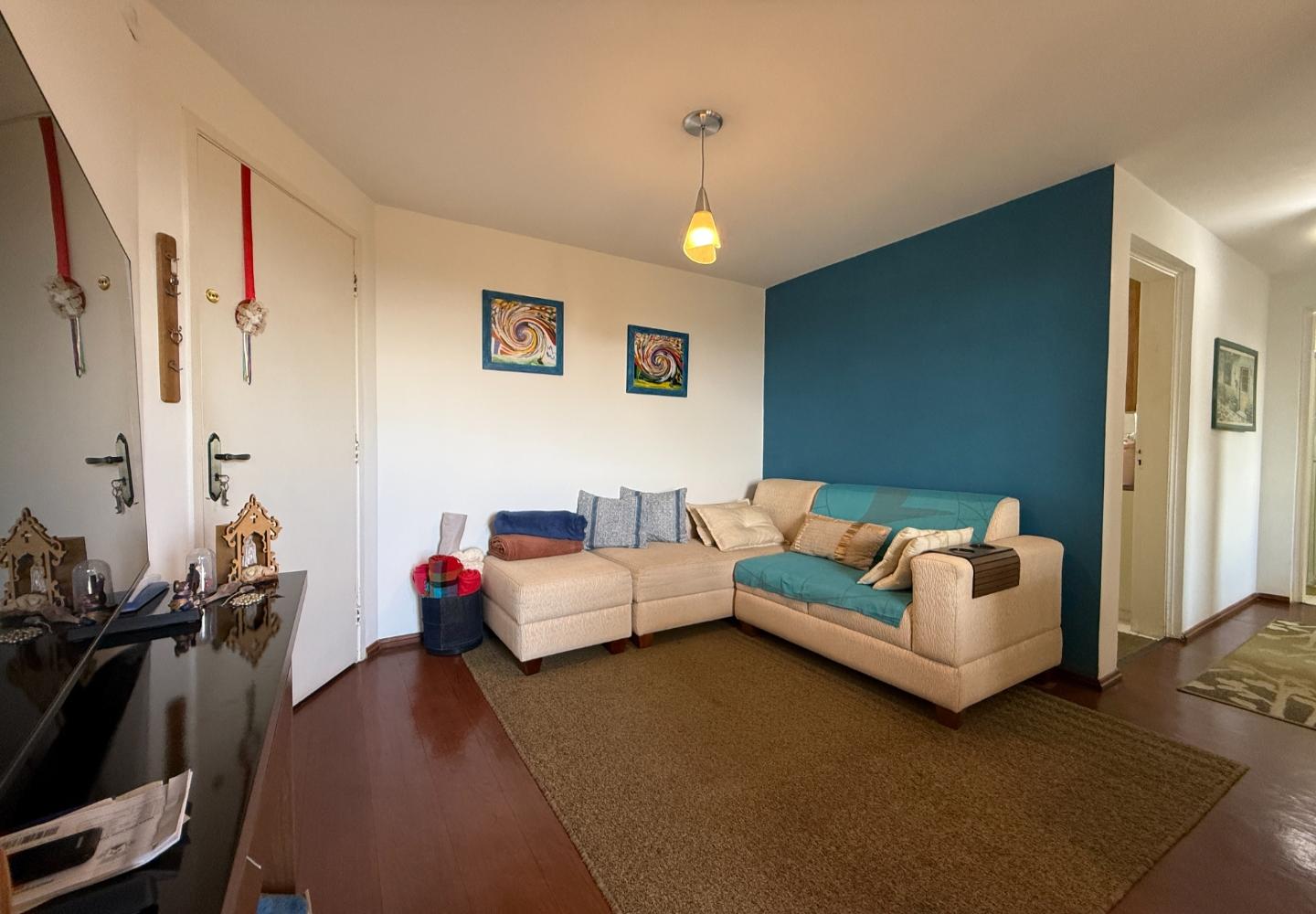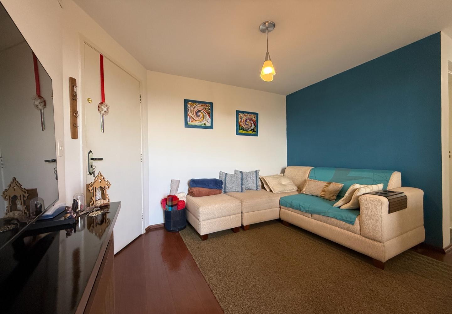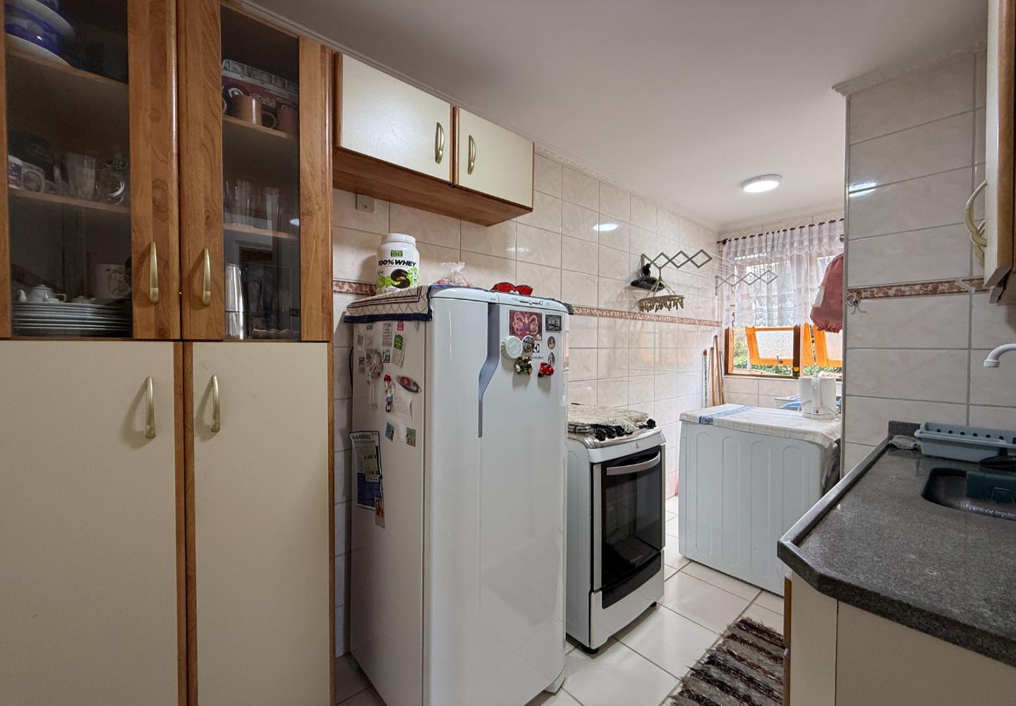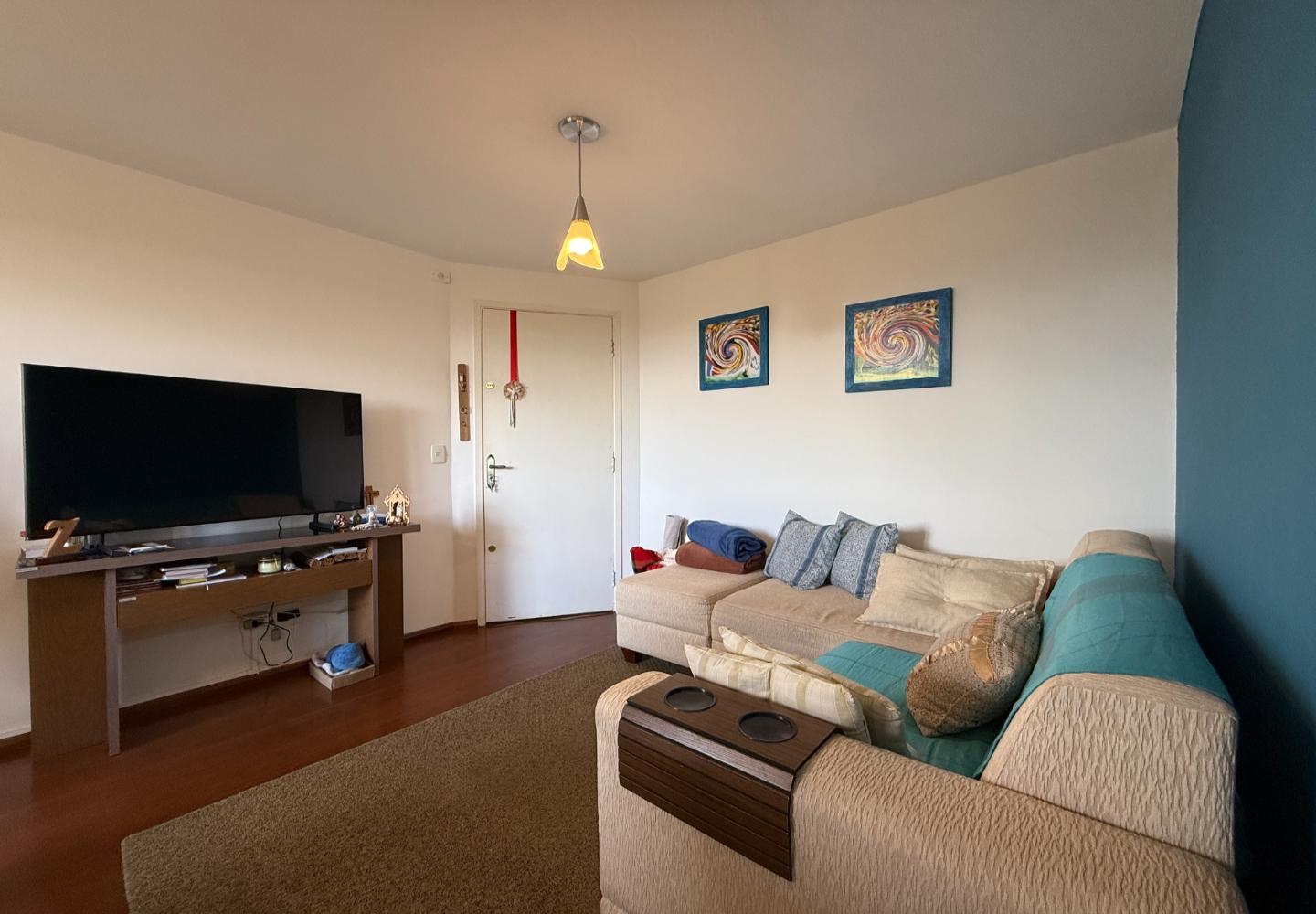 Com 55 m², conta com cozinha funcional, dois dormitórios — sendo um com armário — e banheiro com box em vidro. O imóvel está mobiliado e decorado, com ambientes práticos e bem distribuídos.