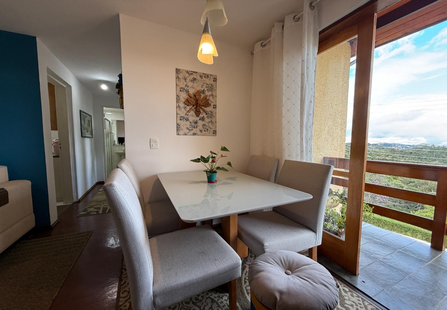 Localizado no segundo andar, o apartamento tem boa incidência de luz natural, ventilação e uma vista mais aberta, trazendo mais privacidade no dia a dia. A área social integra sala de estar e jantar, com acesso à varanda.