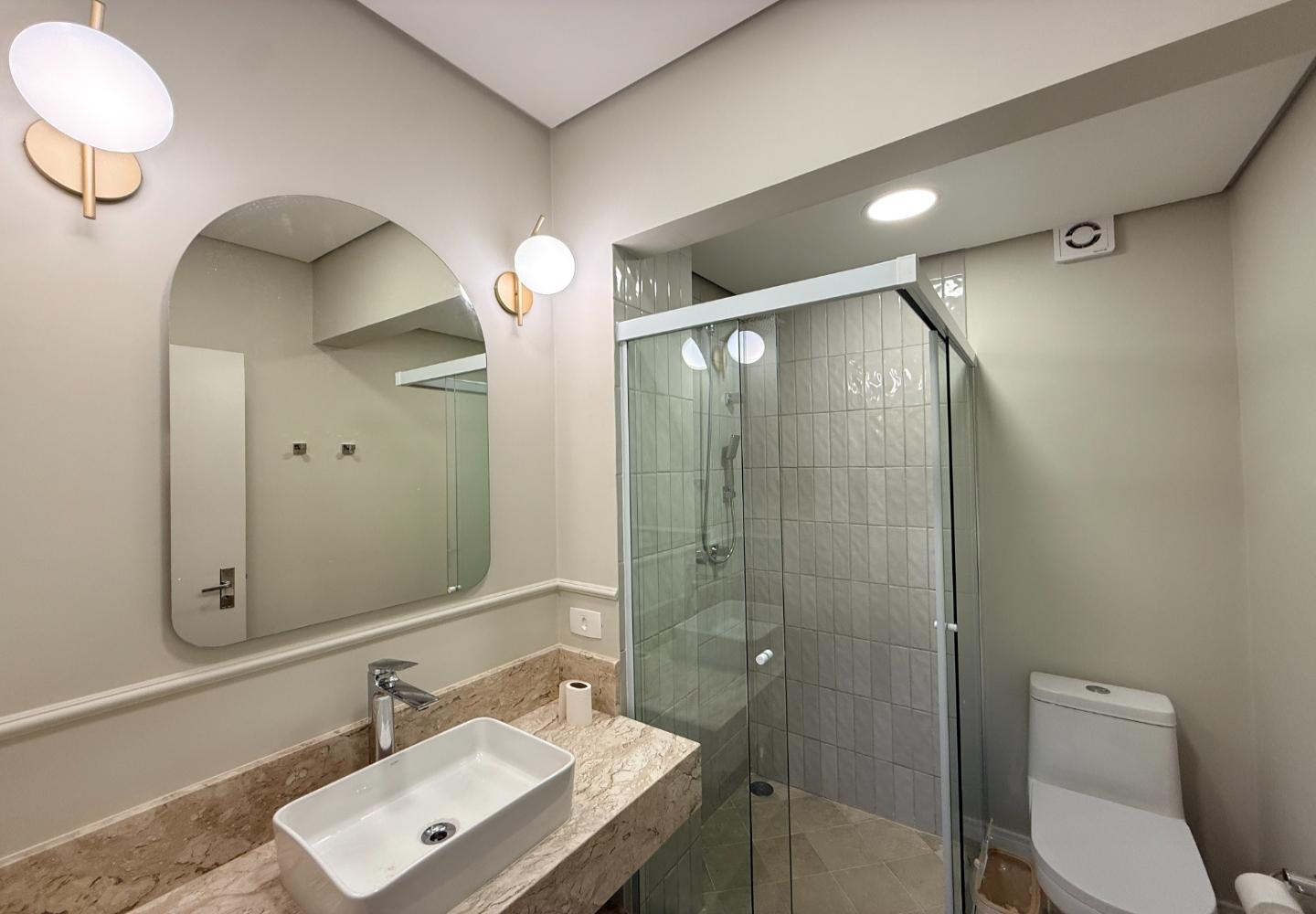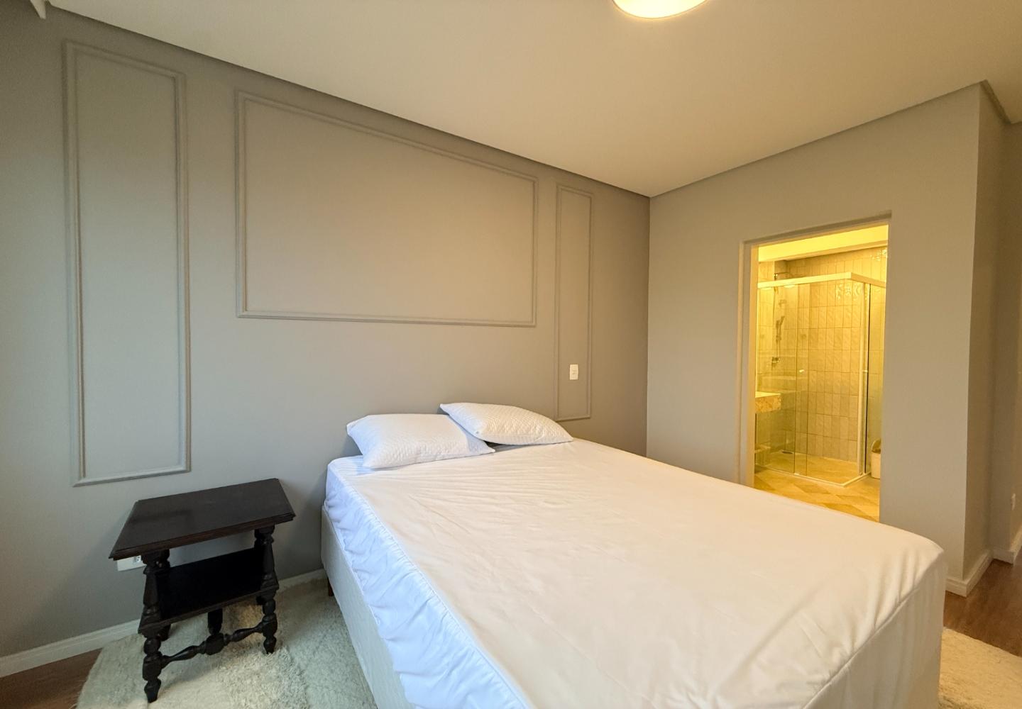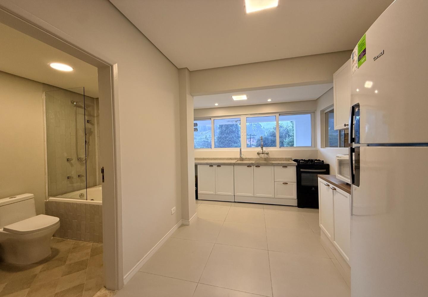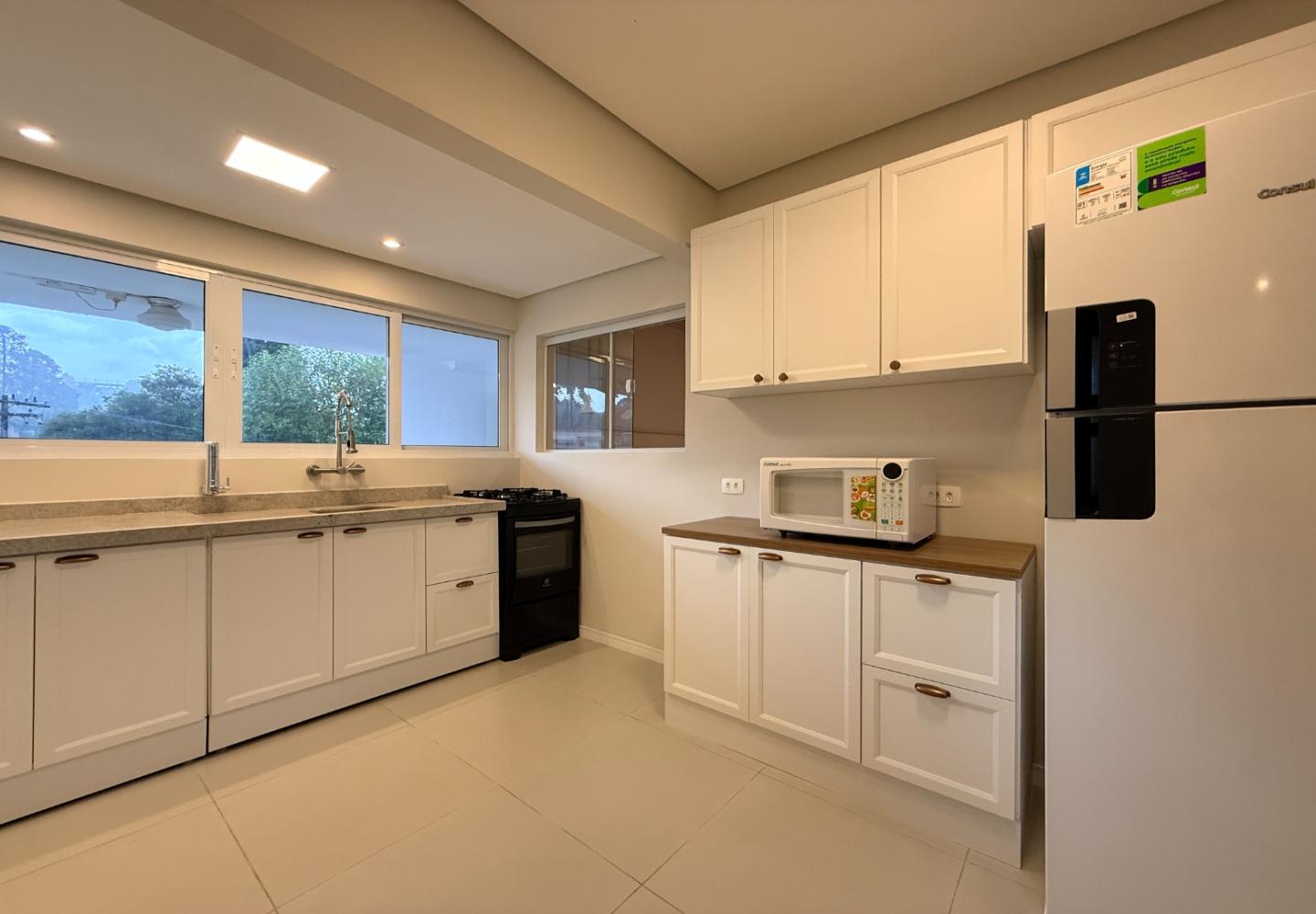 A cozinha foi atualizada, com marcenaria clara, bancada ampla e pontos para lava-louças e lava-roupas, além de área de serviço funcional. Na parte íntima, são três dormitórios, sendo uma suíte, todos com padrão de acabamento alinhado ao restante do imóvel.