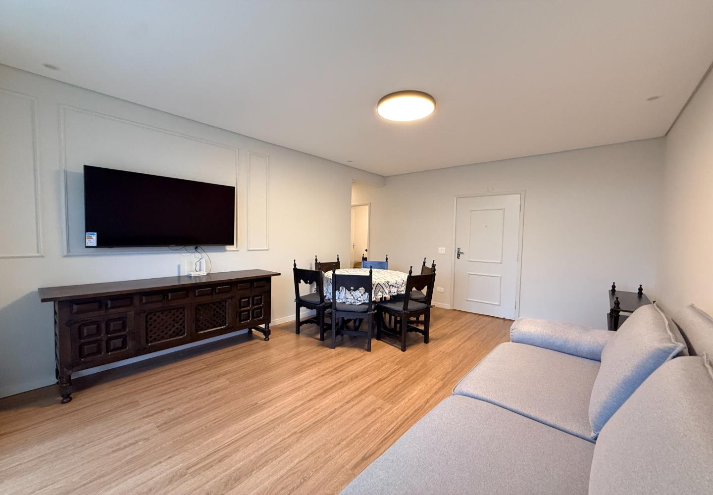 Apartamento com 93 m² no Edifício Mantiqueira, totalmente reformado, incluindo elétrica e hidráulica, e entregue mobiliado. A área social é bem resolvida, com integração entre sala de estar e jantar, boa entrada de luz natural e varanda com vista para o verde.