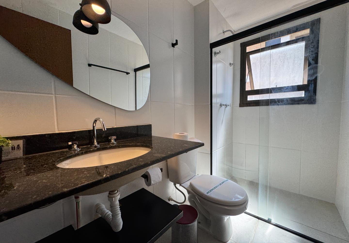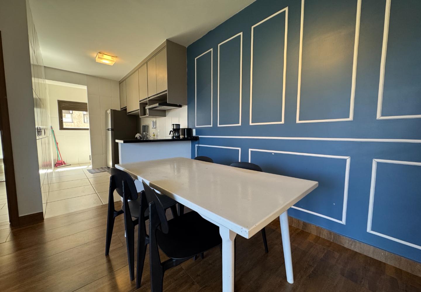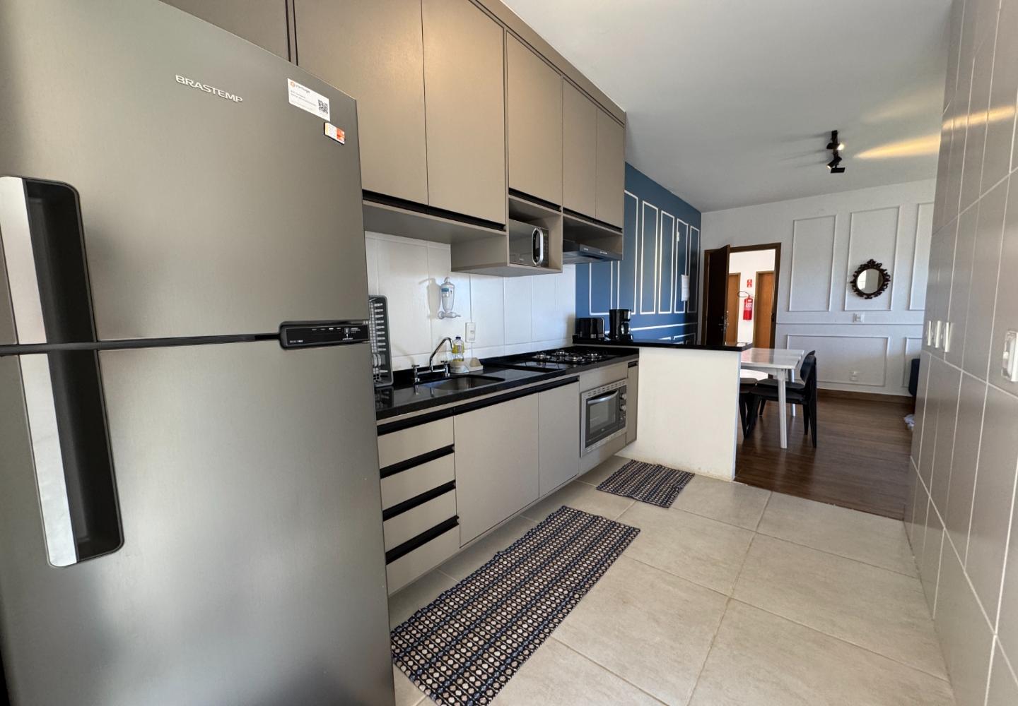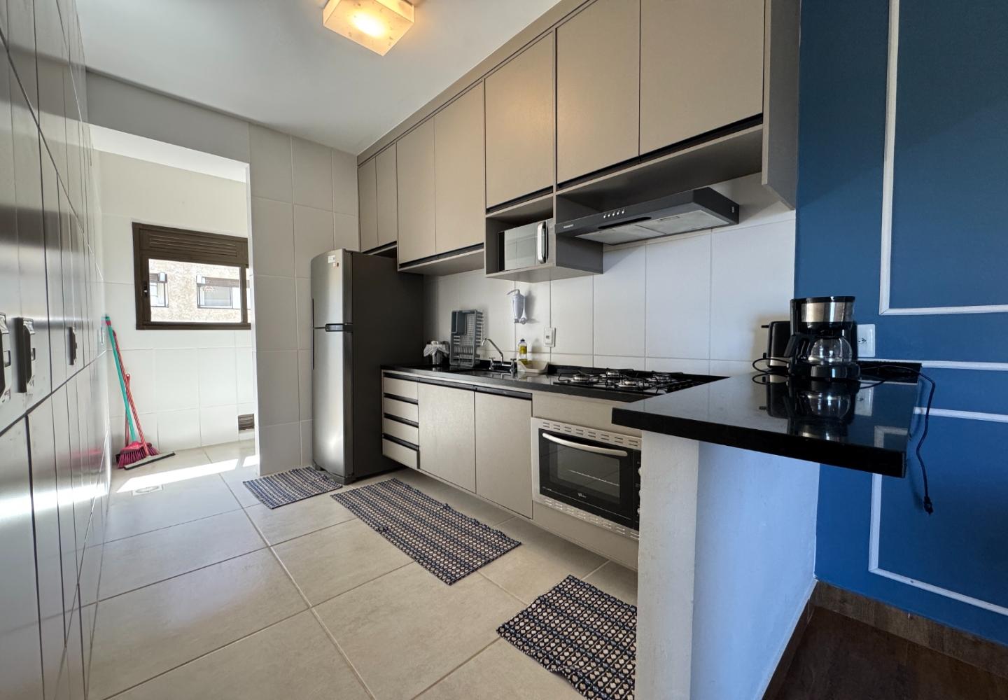 Na cozinha, armários planejados, bancada em granito, cooktop, forno, micro-ondas e geladeira; ao lado, área de serviço independente. A área íntima oferece dois dormitórios bem iluminados — um com cama de casal e outro com duas de solteiro — e banheiro social com ventilação natural, box em vidro e bancada em granito.