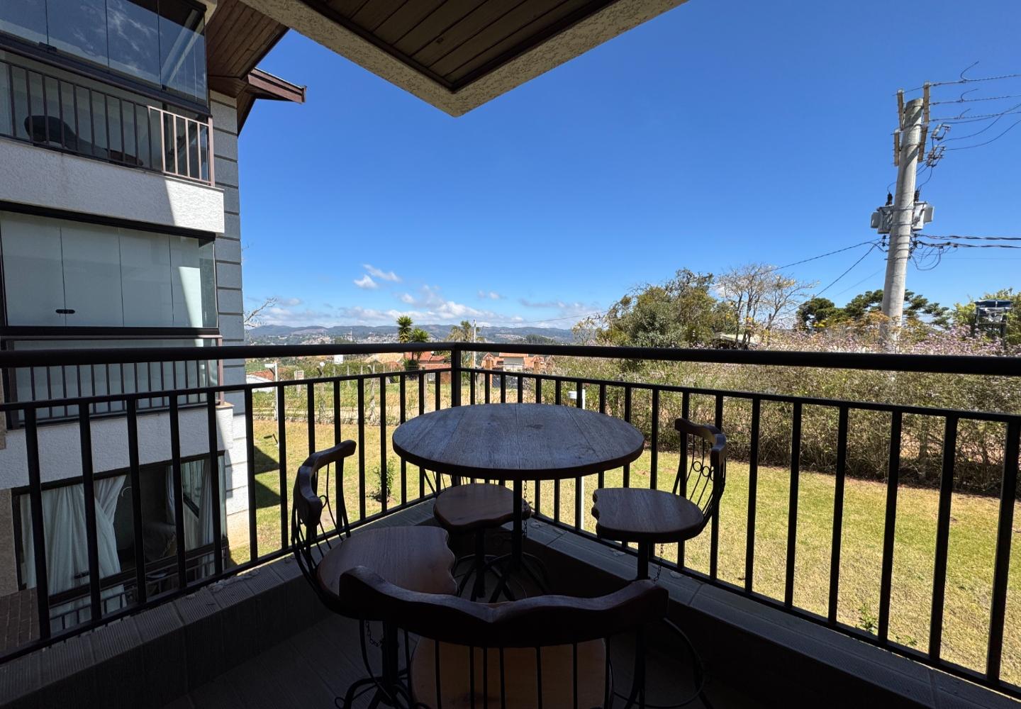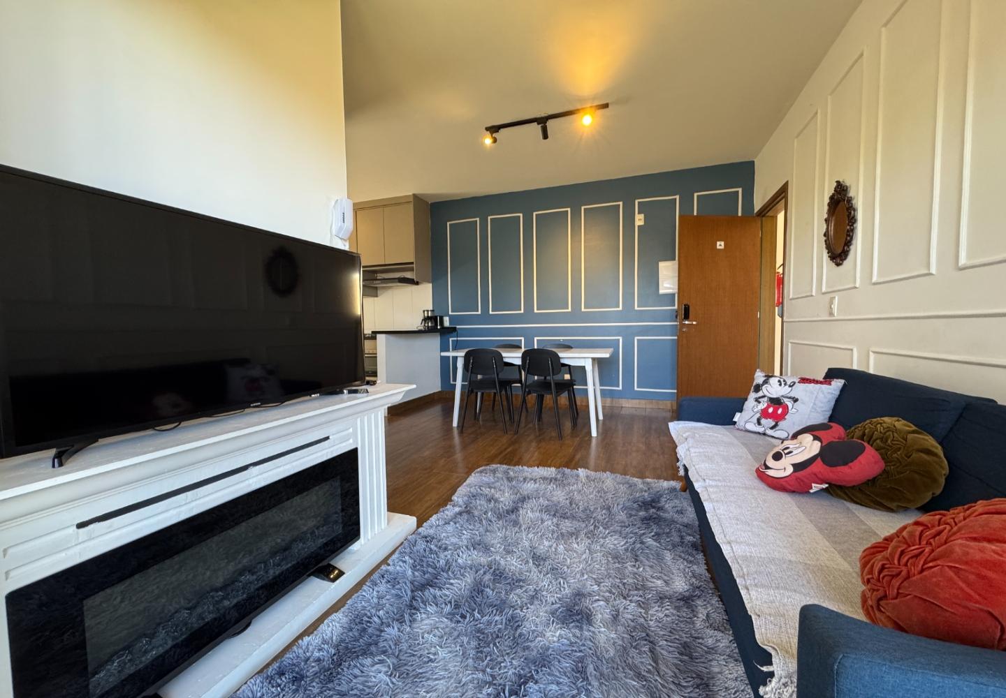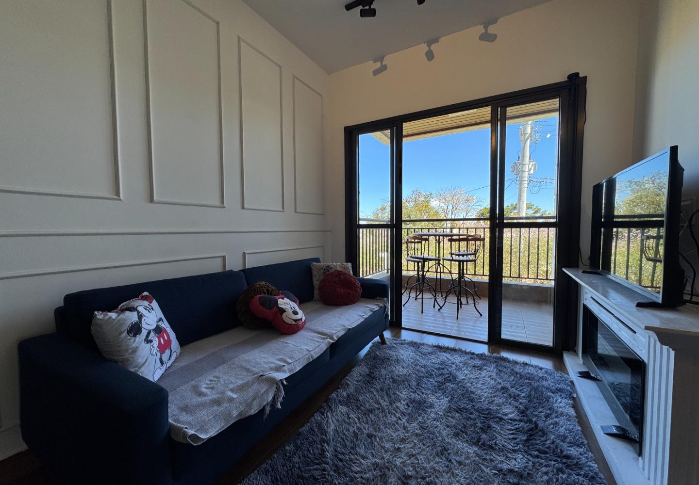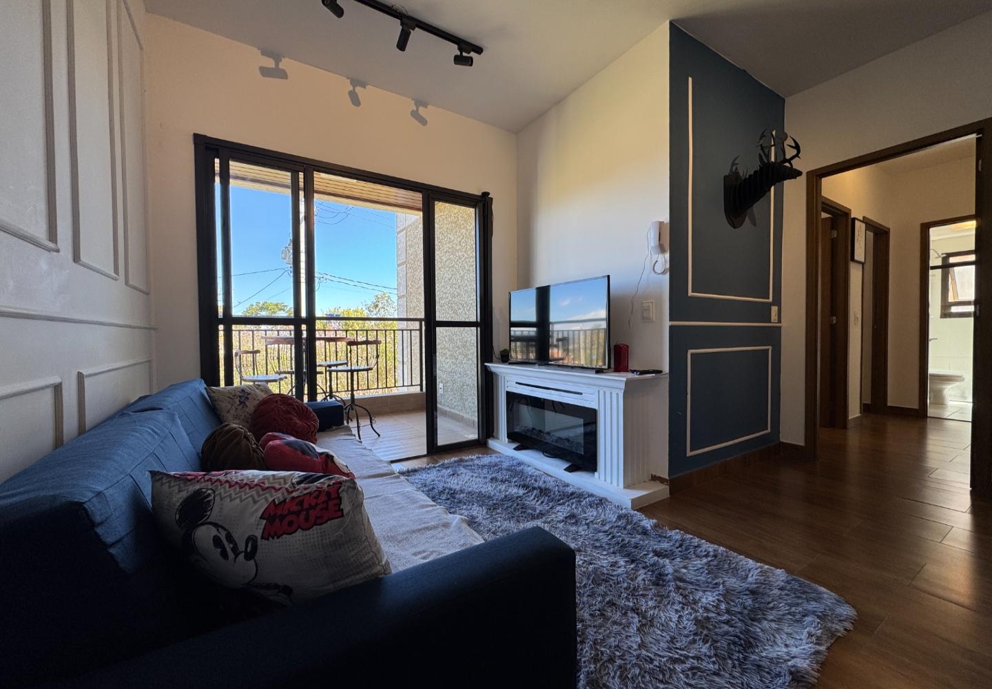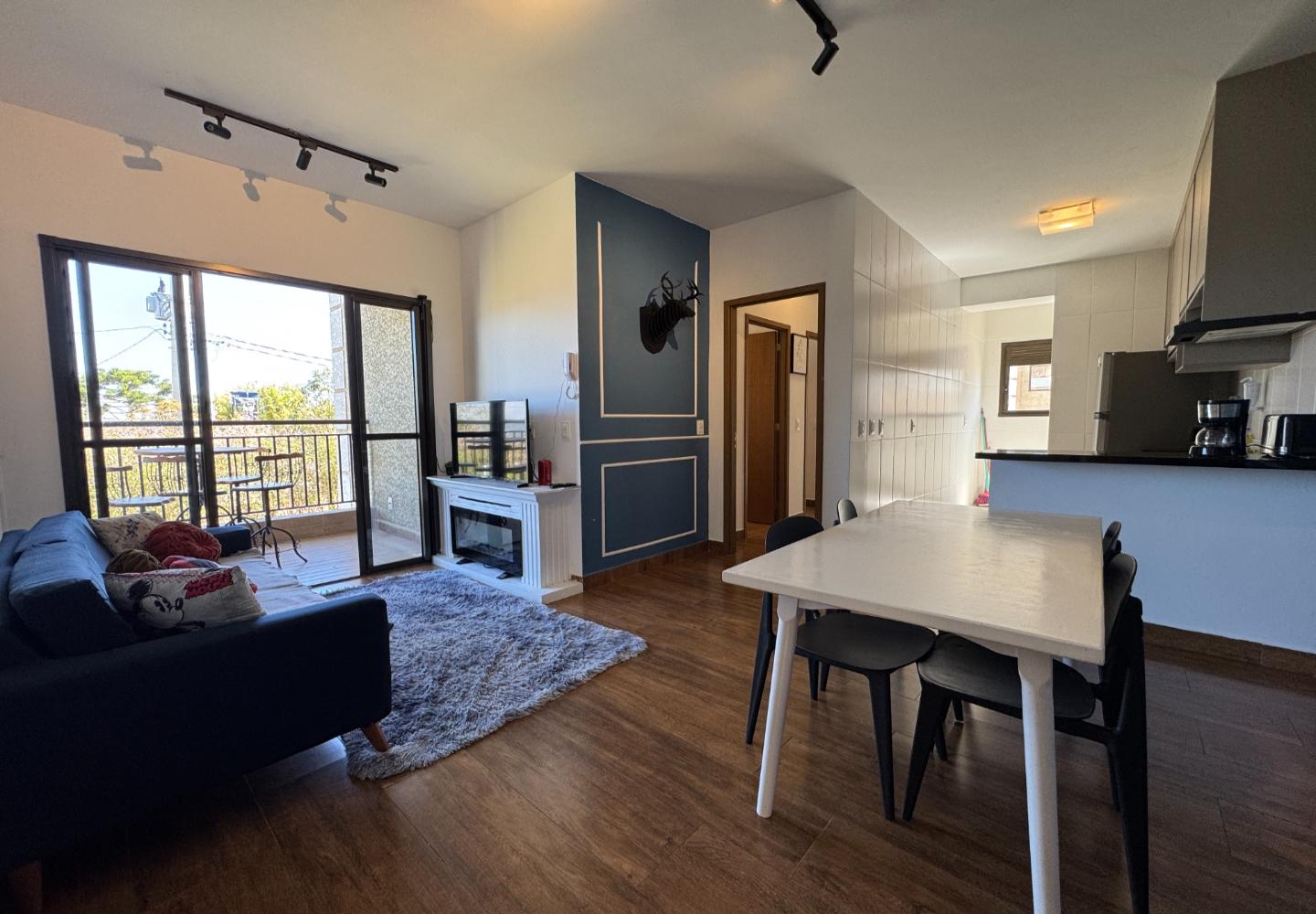 Apartamento mobiliado no condomínio Mountain View, com 58 m² e planta eficiente. A área social reúne sala de estar com boiserie e trilhos de iluminação, lareira elétrica decorativa e TV, integrada à varanda com mesa bistrô e vista aberta para o verde do condomínio.