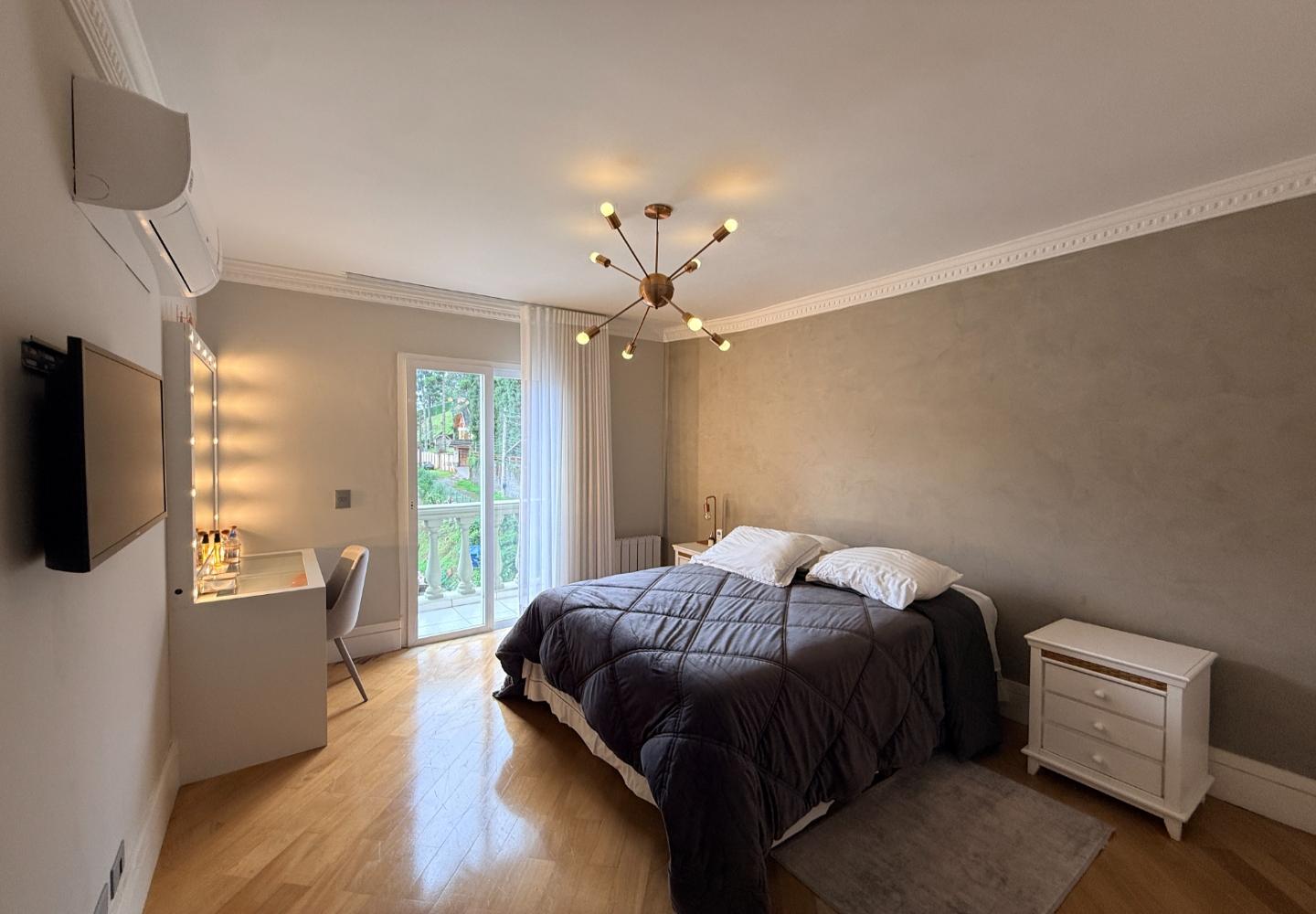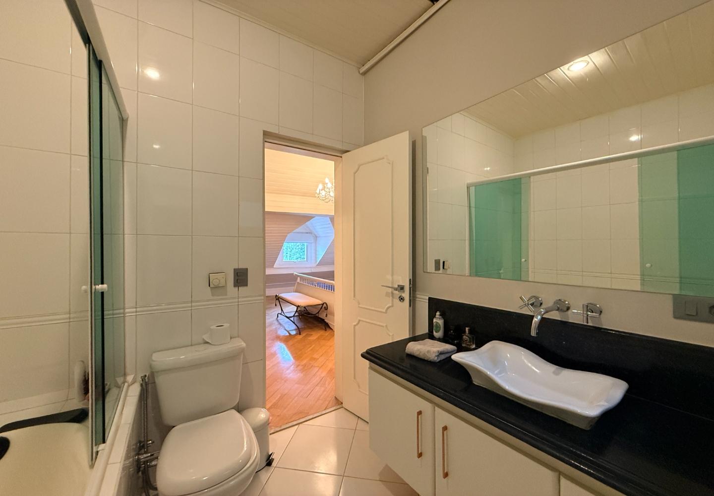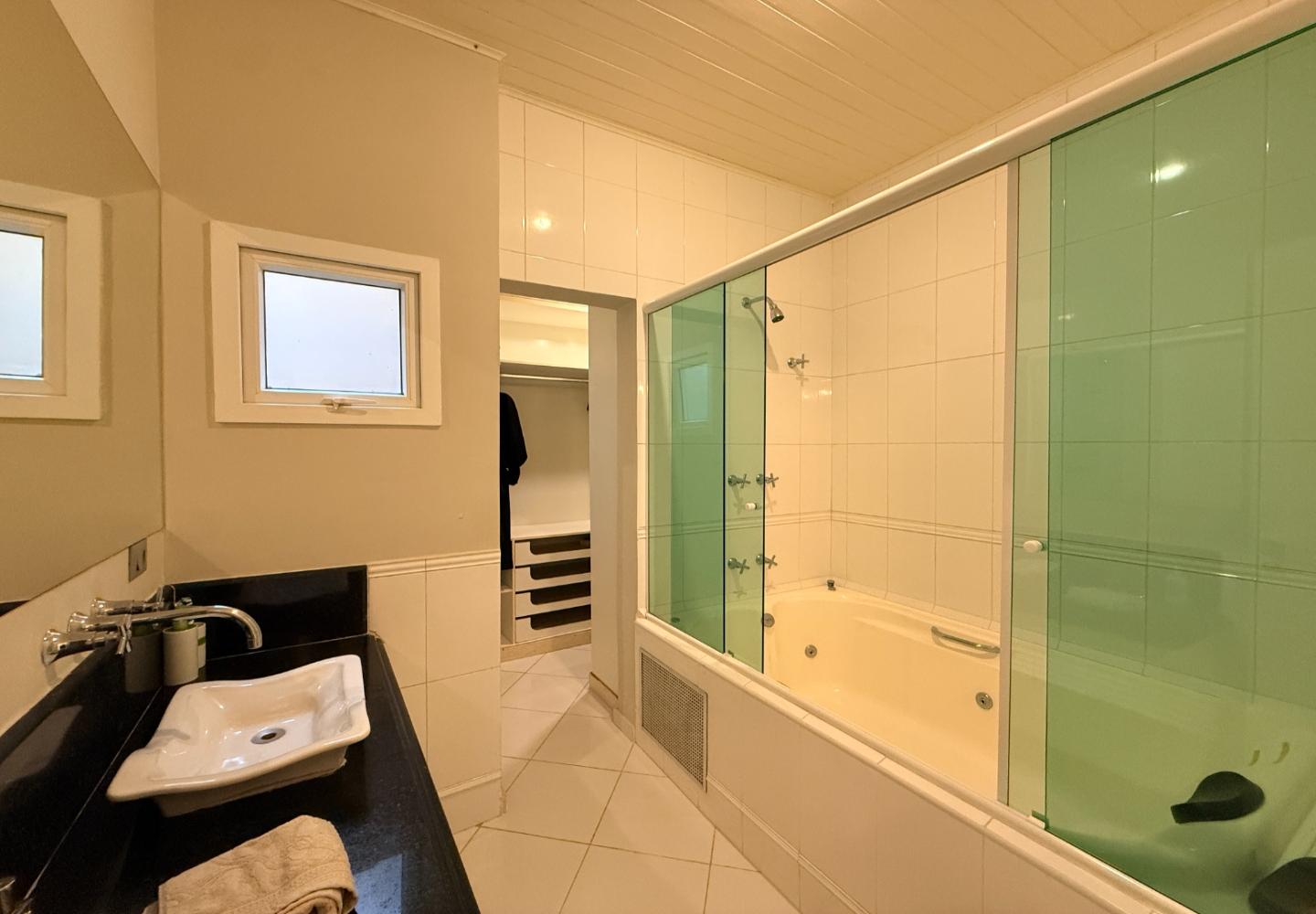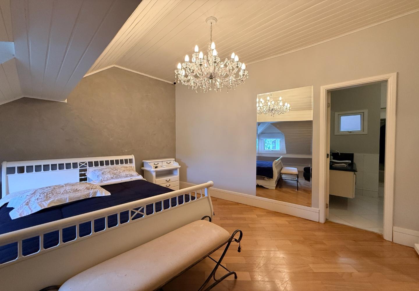 No piso superior, o hall de circulação distribui três suítes, incluindo a principal com closet e banheiro com banheira. Os espaços seguem um padrão consistente, com marcenaria sob medida e bom aproveitamento das áreas sob o telhado.
