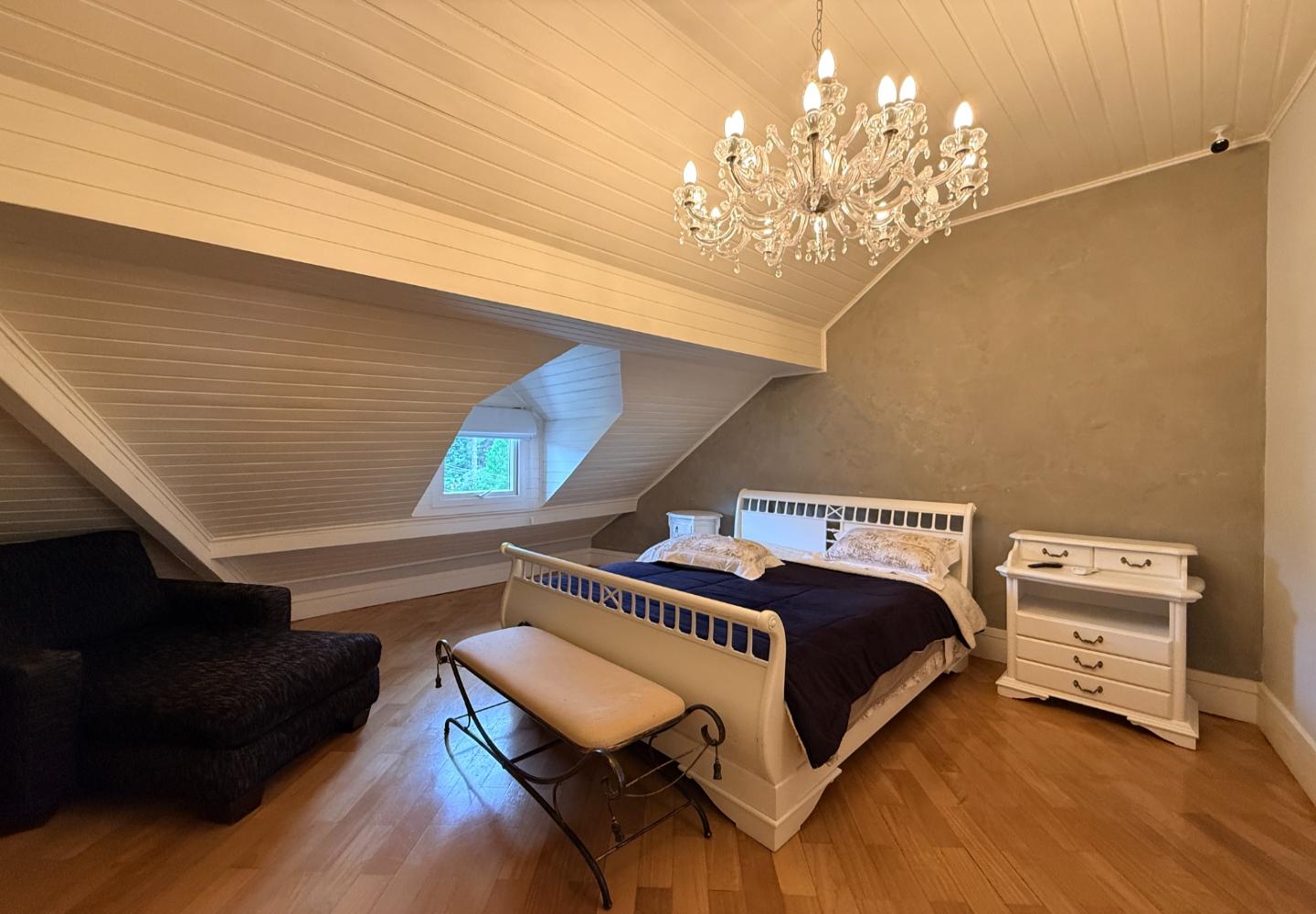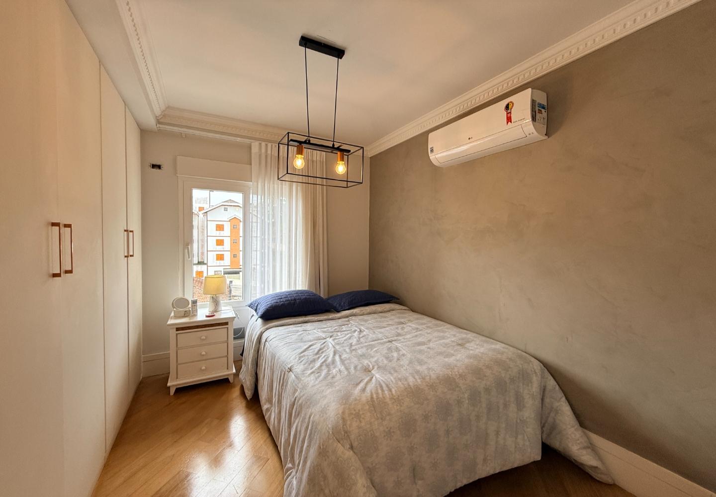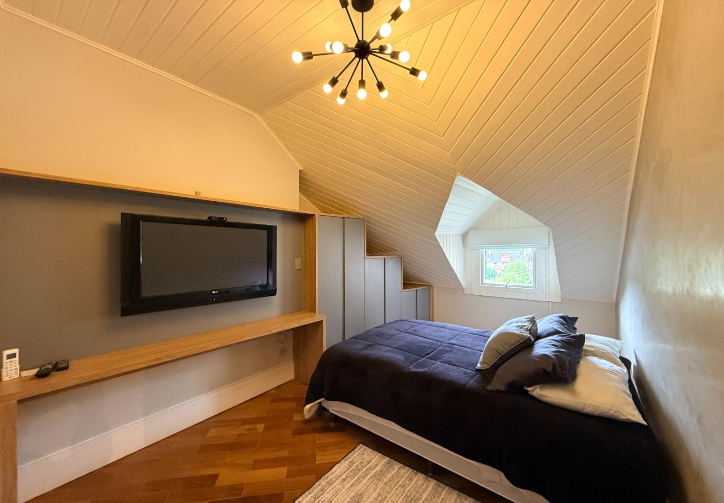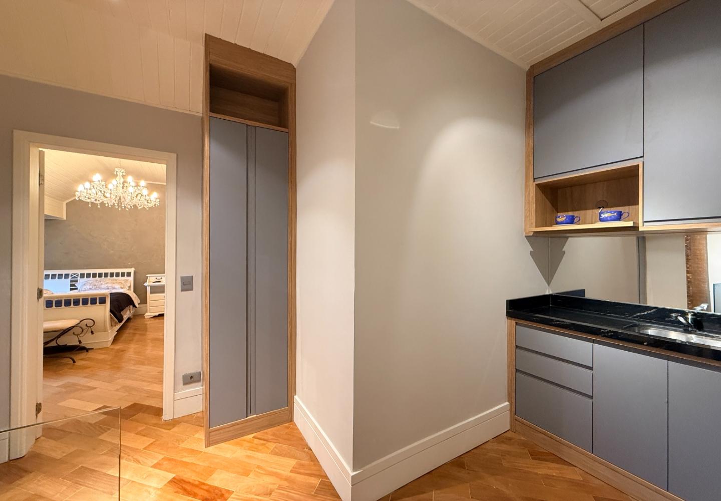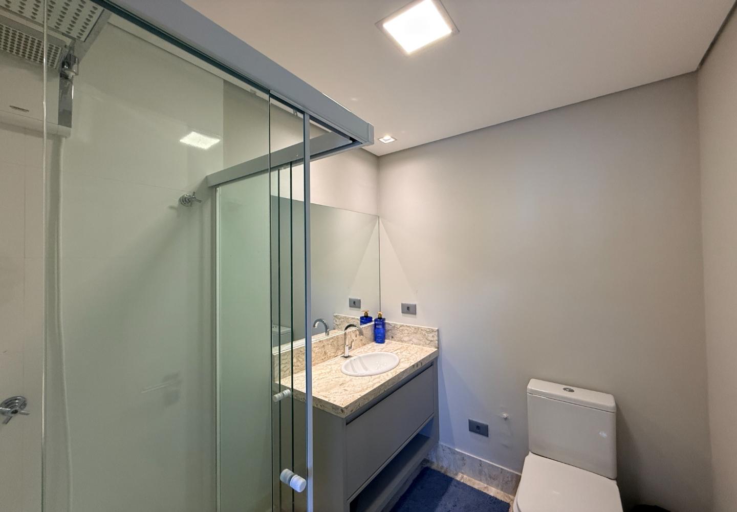 No piso superior, o hall de circulação distribui três suítes, incluindo a principal com closet e banheiro com banheira. Os espaços seguem um padrão consistente, com marcenaria sob medida e bom aproveitamento das áreas sob o telhado.